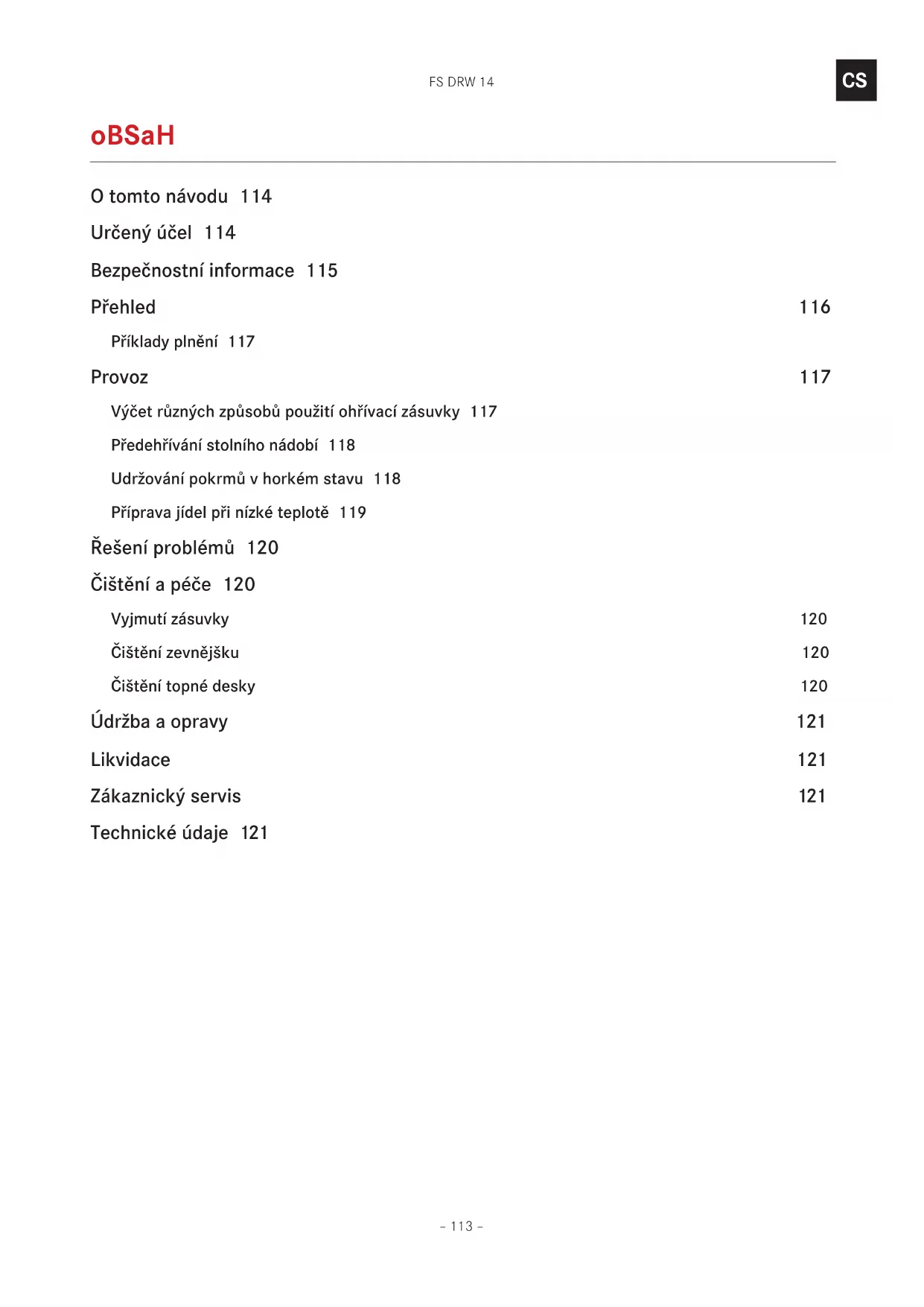 obsah O tomto návodu 114 Určený účel 114 Bezpečnostní informace 115 Přehled 116 Příklady plnění 117 Provoz 117 Výčet různých způsobů použití ohřívací zásuvky 117 Předehřívání stolního nádobí 118 Udržování pokrmů v horkém stavu 118 Příprava jídel při nízké teplotě 119 Řešení problémů 120 Čištění a péče 120 Vyjmutí zásuvky 120 Čištění zevnějšku 120 Čištění topné desky 120 Údržba a opravy 121 Likvidace 121 Zákaznický servis 121 Technické údaje 121FS DRW 14 – 114 –