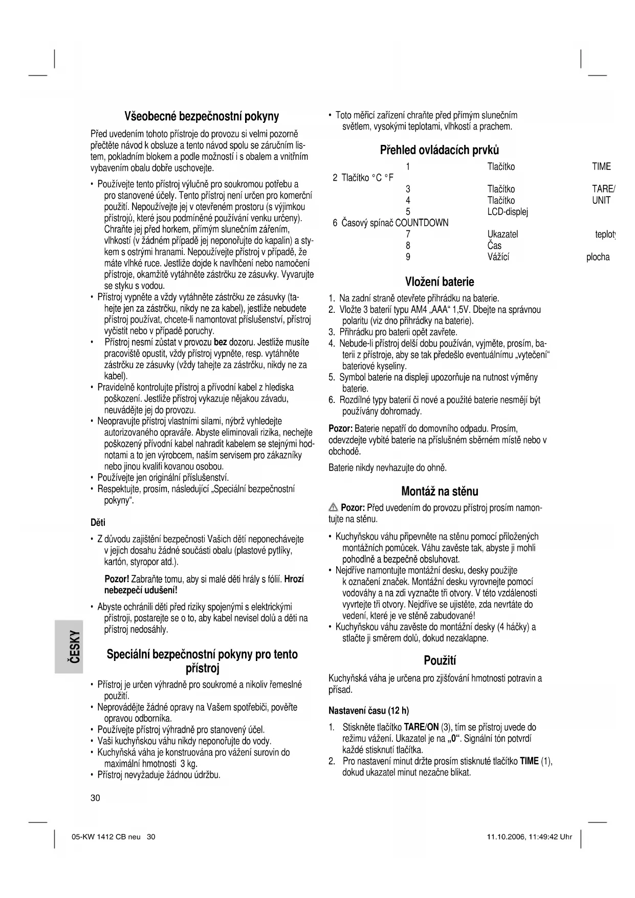 - Po vyčištění otřete přístroj suchým, měkkým hadříkem! Technické údaje Model: ......................................................................KW 1412 CB Pokrytí napětí:...................................... stejnosměrný proud 4,5 V (3 x baterie 1,5V „AAA“) Max. váhové zatížení: .............................................................3 kg Tento přístroj byl testován podle všech příslušných, v současné době platných směrnic CE, jako je např. elektromagnetická kompatibilita a direktiva o nízkonapěťové bezpečnosti, a byl zkonstruován podle nejnovějších bezpečnostně-technických předpisů. Vyhrazujeme si technické změny! Záruka Na námi prodaný přístroj poskytujeme záruku v trvání 24 měsíců od data prodeje (pokladní doklad). Během záruční lhůty odstraníme bezplatně všechny vady přístroje nebo příslušenství, které vzniknou v důsledku vad materiálu nebo výrobních vad, a to opravou nebo, podle našeho uvážení, formou výměny. Záruční plnění nemají za následek ani prodloužení záruční doby ani tím nevzniká nárok na novou záruku! Jako záruční doklad slouží doklad o koupi. Bez tohoto dokladu nelze uskutečnit bezplatnou výměnu nebo bezplatnou opravu. V případě uplatnění záruky předejte, prosím, kompletní přístroj v originálním obalu spolu s pokladním dokladem Vašemu obchodníkovi. Jak na vady na spotřebním příslušenství, resp. dílech podléha- jících rychlému opotřebení, tak i na čištění, údržbu nebo výměnu dílů podléhajících rychlému opotřebení se záruka nevztahuje a je proto nutno je uhradit! Záruka zaniká v případě, že dojde k zásahu neautorizovanou osobou. 05-KW 1412 CB neu 31 11.10.2006, 11:49:44 Uhr32 ČESKY ČESKY Po uplynutí záruky Po uplynutí záruční doby je možno za úplatu provést opravy v příslušném odborném obchodě nebo opravně. Význam symbolu „Popelnice“ Chraňte naše životní prostředí, elektropřístroje nepatří do domovního odpadu. Pro likvidaci elektropřístrojů použijte určených sběrných míst a odevzdejte zde elektropřístroje, jestliže už nebudete používat. Pomůžete tak předejít možným negativním dopadům na životní prostředí a lidské zdraví, ke kterým by mohlo dojít v důsledku nesprávné likvidace. Přispějete tím ke zhodnocení, recyklaci a dalším formám zhod- nocení starých elektronických a elektrických přístrojů. Informace o tom, kde lze tyto přístroje odevzdat k likvidaci, obdržíte prostřednictvím územně správních celků nebo obecního úřadu. 05-KW 1412 CB neu 32 11.10.2006, 11:49:46 UhrČESKY