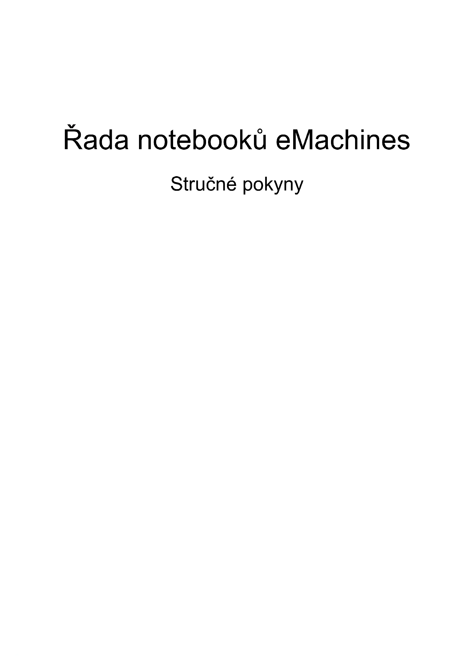 4ĭada notebooků eMachines Stručné pokynyČíslo modelu: _________________________________ Sériové číslo: __________________________________ Datum zakoupení: ______________________________ Místo zakoupení: _______________________________ © 2010 Všechna práva vyhrazena. Stručné pokyny pro Įadu notebooků eMachines Původní vydání: 06/20103 Stručné pokyny Děkujeme vám, že jste si k uspokojení svých potĮeb v oblasti pĮenosných počítačů vybrali notebook eMachines. Uživatelské pĮíručky Abychom vám pĮi používání notebooku eMachines pomohli, vytvoĮili jsme pro vás sadu pĮíruček: Instalační leták vám pomůže pĮi úvodním nastavení počítače. Obecná uživatelská příručka pro počítače eMachines obsahuje užitečné informace pro všechny modely Įady eMachines. Obsahuje základní témata, napĮ. obnovení systému, používání klávesnice a zvuku atd. Berte laskavě na vědomí, že Obecná uživatelská příručka pro počítače eMachines může popisovat funkce nebo vlastnosti, kterými jsou vybaveny pouze určité modely a kterými nemusí být nutně vybaven vámi zakoupený model. V takových pĮípadech je text označen frází „pouze u vybraných modelů“. Tyto Stručné pokyny vás seznámí se základními schopnostmi a funkcemi nového počítače. Další informace o tom, jak vám počítač může pomoci zvýšit produktivitu, najdete v pĮíručce Obecná uživatelská příručka pro počítač e eMachines, která poskytuje podrobné informace o takových námětech, jako jsou systémové nástroje, obnovování dat, možností rozšíĮení a odstraňování potíží. Dále obsahuje záruční informace, informace týkající se všeobecných pĮedpisů a bezpečnostní upozornění k notebooku. PĮíručka je k dispozici ve formátu PDF (Portable Document Format) a je již uložena do notebooku. Zobrazíte ji následujícím postupem: 1 Klepněte na tlačítko Start > Všechny programy > Dokumentace eMachines. 2 Klepněte na položku Obecná uživatelská příručka pro počítače eMachines. Poznámka: K zobrazení tohoto souboru je vyžadován program Adobe Reader. Pokud v počítači není program Adobe Reader nainstalován, klepnutím na položku Obecná uživatelská příručka pro počítače eMachines nejprve spustíte instalační program. Dokončete instalaci podle pokynů na obrazovce. Pokyny týkající se používání programu Adobe Reader jsou k dispozici v nabídce Nápověda a odborná pomoc.4 Čeština Seznámení s notebookem eMachines Po nastavení počítače podle pokynů znázorněných na instalačním letáku vás seznámíme s vaším novým notebookem eMachines. Pohled shora