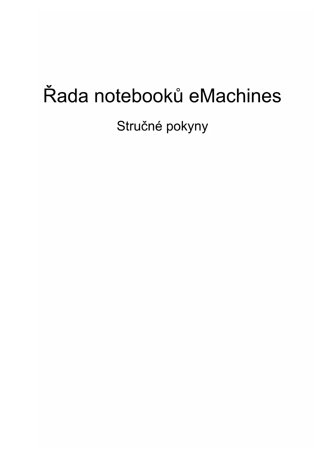 4ĭada notebooků eMachines Stručné pokynyČíslo modelu: _________________________________ Sériové číslo: __________________________________ Datum zakoupení: ______________________________ Místo zakoupení: _______________________________ © 2010 Všechna práva vyhrazena. Stručné pokyny pro Įadu notebooků eMachines Původní vydání: 07/20103 Stručné pokyny Děkujeme vám, že jste si k uspokojení svých potĮeb v oblasti pĮenosných počítačů vybrali notebook eMachines. Uživatelské pĮíručky Abychom vám pĮi používání notebooku eMachines pomohli, vytvoĮili jsme pro vás sadu pĮíruček: Instalační leták vám pomůže pĮi úvodním nastavení počítače. Obecná uživatelská příručka pro počítače eMachines obsahuje užitečné informace pro všechny modely Įady eMachines. Obsahuje základní témata, napĮ. obnovení systému, používání klávesnice a zvuku atd. Berte laskavě na vědomí, že Obecná uživatelská příručka pro počítače eMachines může popisovat funkce nebo vlastnosti, kterými jsou vybaveny pouze určité modely a kterými nemusí být nutně vybaven vámi zakoupený model. V takových pĮípadech je text označen frází „pouze u vybraných modelů“. Tyto Stručné pokyny vás seznámí se základními schopnostmi a funkcemi nového počítače. Další informace o tom, jak vám počítač může pomoci zvýšit produktivitu, najdete v pĮíručce Obecná uživatelská příručka pro počítač e eMachines, která poskytuje podrobné informace o takových námětech, jako jsou systémové nástroje, obnovování dat, možností rozšíĮení a odstraňování potíží. Dále obsahuje záruční informace, informace týkající se všeobecných pĮedpisů a bezpečnostní upozornění k notebooku. PĮíručka je k dispozici ve formátu PDF (Portable Document Format) a je již uložena do notebooku. Zobrazíte ji následujícím postupem: 1 Klepněte na tlačítko Start > Všechny programy > Dokumentace eMachines. 2 Klepněte na položku Obecná uživatelská příručka pro počítače eMachines. Poznámka: K zobrazení tohoto souboru je vyžadován program Adobe Reader. Pokud v počítači není program Adobe Reader nainstalován, klepnutím na položku Obecná uživatelská příručka pro počítače eMachines nejprve spustíte instalační program. Dokončete instalaci podle pokynů na obrazovce. Pokyny týkající se používání programu Adobe Reader jsou k dispozici v nabídce Nápověda a odborná pomoc.4 Čeština Seznámení s notebookem eMachines Po nastavení počítače podle pokynů znázorněných na instalačním letáku vás seznámíme s vaším novým notebookem eMachines. Pohled shora