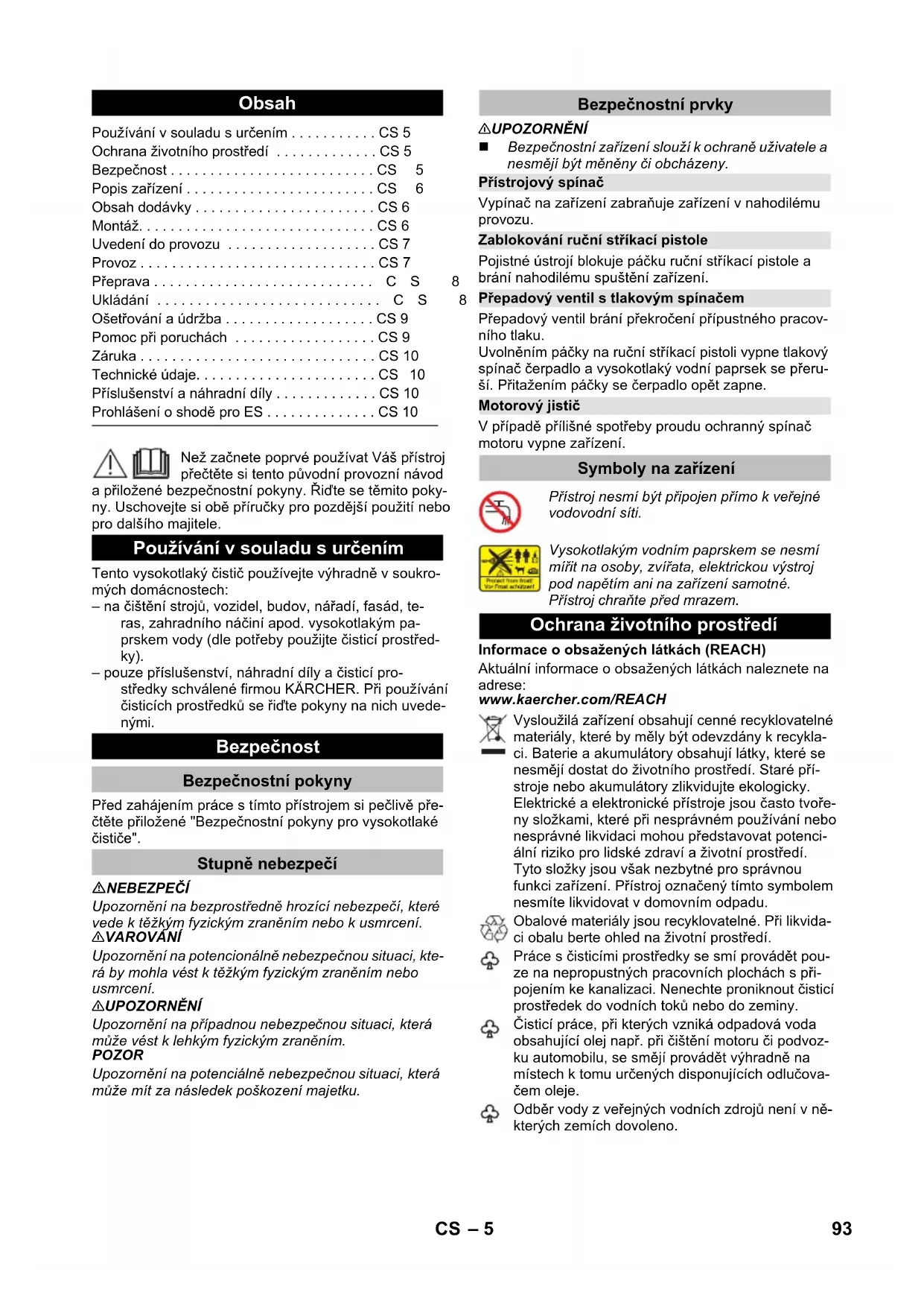 92 dB(A) Műszaki változtatások joga fenntartva. Tartozékok és alkatrészek EK konformitási nyiltakozat Termék: Nagynyomású tisztító Típus: 1.324-xxx Vonatkozó európai közösségi irányelvek: 2000/14/EK 2014/30/EU 2006/42/EK (+2009/127/EK) 2011/65/ЕU Alkalmazott harmonizált szabványok: EN 50581 EN 55014–1: 2006+A1: 2009+A2: 2011 EN 55014–2: 1997+A1: 2001+A2: 2008 EN 60335–1 EN 60335–2–79 EN 61000–3–2: 2014 EN 61000–3–3: 2013 EN 62233: 2008 Követett megfelelés megállapítási eljárás: 2000/14/EK: V. függelék Hangteljesítményszint dB(A) Mért: 89 Garantált: 92 Winnenden, 2016/01/01 CEO Head of Approbation 92 HU– 5 Než začnete poprvé používat Váš přístroj přečtěte si tento původní provozní návod a přiložené bezpečnostní pokyny. Řiďte se těmito poky- ny. Uschovejte si obě příručky pro pozdější použití nebo pro dalšího majitele. Tento vysokotlaký čistič používejte výhradně v soukro- mých domácnostech: – na čištění strojů, vozidel, budov, nářadí, fasád, te- ras, zahradního náčiní apod. vysokotlakým pa- prskem vody (dle potřeby použijte čisticí prostřed- ky). – pouze příslušenství, náhradní díly a čisticí pro- středky schválené firmou KÄRCHER. Při používání čisticích prostředků se řiďte pokyny na nich uvede- nými. Před zahájením práce s tímto přístrojem si pečlivě pře- čtěte přiložené "Bezpečnostní pokyny pro vysokotlaké čističe". NEBEZPEČÍ Upozornění na bezprostředně hrozící nebezpečí, které vede k těžkým fyzickým zraněním nebo k usmrcení. 몇 VAROVÁNÍ Upozornění na potencionálně nebezpečnou situaci, kte- rá by mohla vést k těžkým fyzickým zraněním nebo usmrcení. 몇 UPOZORNĚNÍ Upozornění na případnou nebezpečnou situaci, která může vést k lehkým fyzickým zraněním. POZOR Upozornění na potenciálně nebezpečnou situaci, která může mít za následek poškození majetku. 몇 UPOZORNĚNÍ Bezpečnostní zařízení slouží k ochraně uživatele a nesmějí být měněny či obcházeny. Vypínač na zařízení zabraňuje zařízení v nahodilému provozu. Pojistné ústrojí blokuje páčku ruční stříkací pistole a brání nahodilému spuštění zařízení. Přepadový ventil brání překročení přípustného pracov- ního tlaku. Uvolněním páčky na ruční stříkací pistoli vypne tlakový spínač čerpadlo a vysokotlaký vodní paprsek se přeru- ší. Přitažením páčky se čerpadlo opět zapne. V případě přílišné spotřeby proudu ochranný spínač motoru vypne zařízení. Informace o obsažených látkách (REACH) Aktuální informace o obsažených látkách naleznete na adrese: www.kaercher.com/REACH Obsah Používání v souladu s určením . . . . . . . . . . . CS 5 Ochrana životního prostředí . . . . . . . . . . . . . CS 5 Bezpečnost . . . . . . . . . . . . . . . . . . . . . . . . . . CS5 Popis zařízení . . . . . . . . . . . . . . . . . . . . . . . . CS6 Obsah dodávky . . . . . . . . . . . . . . . . . . . . . . . CS 6 Montáž. . . . . . . . . . . . . . . . . . . . . . . . . . . . . . CS 6 Uvedení do provozu . . . . . . . . . . . . . . . . . . . CS 7 Provoz . . . . . . . . . . . . . . . . . . . . . . . . . . . . . . CS 7 Přeprava . . . . . . . . . . . . . . . . . . . . . . . . . . . .CS 8 Ukládání . . . . . . . . . . . . . . . . . . . . . . . . . . . .CS 8 Ošetřování a údržba . . . . . . . . . . . . . . . . . . . CS 9 Pomoc při poruchách . . . . . . . . . . . . . . . . . . CS 9 Záruka . . . . . . . . . . . . . . . . . . . . . . . . . . . . . . CS 10 Technické údaje. . . . . . . . . . . . . . . . . . . . . . . CS 10 Příslušenství a náhradní díly . . . . . . . . . . . . . CS 10 Prohlášení o shodě pro ES . . . . . . . . . . . . . . CS 10 Používání v souladu s určením Bezpečnost Bezpečnostní pokyny Stupně nebezpečí Bezpečnostní prvky Přístrojový spínač Zablokování ruční stříkací pistole Přepadový ventil s tlakovým spínačem Motorový jistič Symboly na zařízení Přístroj nesmí být připojen přímo k veřejné vodovodní síti. Vysokotlakým vodním paprskem se nesmí mířit na osoby, zvířata, elektrickou výstroj pod napětím ani na zařízení samotné. Přístroj chraňte před mrazem. Ochrana životního prostředí Vysloužilá zařízení obsahují cenné recyklovatelné materiály, které by měly být odevzdány k recykla- ci. Baterie a akumulátory obsahují látky, které se nesmějí dostat do životního prostředí. Staré pří- stroje nebo akumulátory zlikvidujte ekologicky. Elektrické a elektronické přístroje jsou často tvoře- ny složkami, které při nesprávném používání nebo nesprávné likvidaci mohou představovat potenci- ální riziko pro lidské zdraví a životní prostředí. Tyto složky jsou však nezbytné pro správnou funkci zařízení. Přístroj označený tímto symbolem nesmíte likvidovat v domovním odpadu. Obalové materiály jsou recyklovatelné. Při likvida- ci obalu berte ohled na životní prostředí. Práce s čisticími prostředky se smí provádět pou- ze na nepropustných pracovních plochách s při- pojením ke kanalizaci. Nenechte proniknout čisticí prostředek do vodních toků nebo do zeminy. Čisticí práce, při kterých vzniká odpadová voda obsahující olej např. při čištění motoru či podvoz- ku automobilu, se smějí provádět výhradně na místech k tomu určených disponujících odlučova- čem oleje. Odběr vody z veřejných vodních zdrojů není v ně- kterých zemích dovoleno. 93CS– 6 V provozní příručce je popsáno maximální vybavení. V závislosti na modelu se liší obsah dodávky (viz obal). Ilustrace najdete na rozkládací stránce 4 1 Spojovací element pro přívod vody 2 Vodní přípojka s integrovaným sítkem 3 Vysokotlaká hadice 4 Vedení hadice 5 Uložení pro 