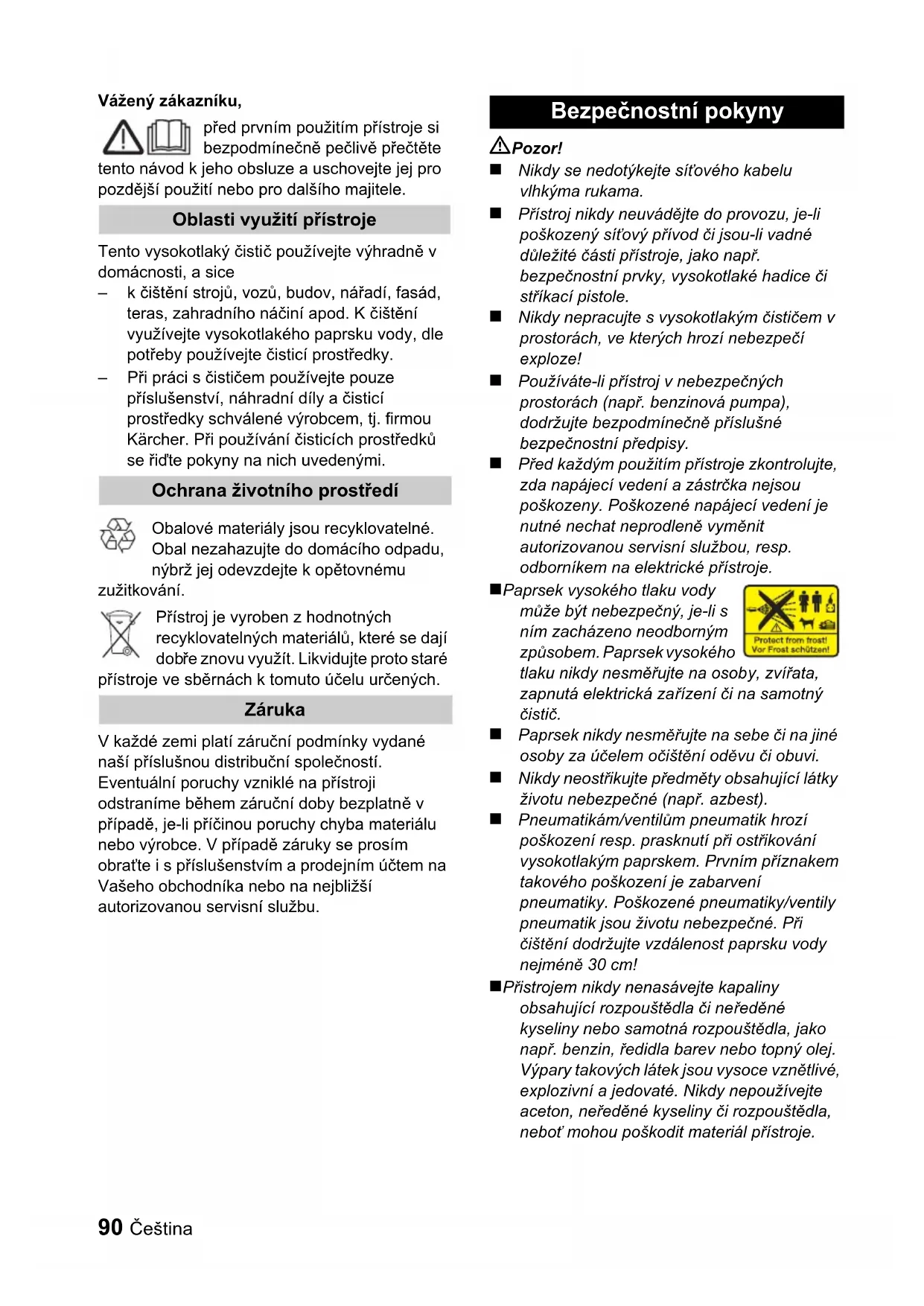 Hangteljesítményszint dB(A) Mért: 85 dB(A) Garantált: 87 dB(A)90 Čeština Vážený zákazníku, před prvním použitím přístroje si bezpodmínečně pečlivě přečtěte tento návod k jeho obsluze a uschovejte jej pro pozdější použití nebo pro dalšího majitele. Tento vysokotlaký čistič používejte výhradně v domácnosti, a sice –k čištění strojů, vozů, budov, nářadí, fasád, teras, zahradního náčiní apod. K čištění využívejte vysokotlakého paprsku vody, dle potřeby používejte čisticí prostředky. –Při práci s čističem používejte pouze příslušenství, náhradní díly a čisticí prostředky schválené výrobcem, tj. firmou Kärcher. Při používání čisticích prostředků se řiďte pokyny na nich uvedenými. Obalové materiály jsou recyklovatelné. Obal nezahazujte do domácího odpadu, nýbrž jej odevzdejte k opětovnému zužitkování. Přístroj je vyroben z hodnotných recyklovatelných materiálů, které se dají dob ře znovu využít. Likvidujte proto staré přístroje ve sběrnách k tomuto účelu určených. V každé zemi platí záruční podmínky vydané naší příslušnou distribuční společností. Eventuální poruchy vzniklé na přístroji odstraníme během záruční doby bezplatně v případě, je-li příčinou poruchy chyba materiálu nebo výrobce. V případě záruky se prosím obraťte i s příslušenstvím a prodejním účtem na Vašeho obchodníka nebo na nejbližší autorizovanou servisní službu. Pozor! ! Nikdy se nedotýkejte síťového kabelu vlhkýma rukama. ! Přístroj nikdy neuvádějte do provozu, je-li poškozený síťový přívod či jsou-li vadné důležité části přístroje, jako např. bezpečnostní prvky, vysokotlaké hadice či stříkací pistole. ! Nikdy nepracujte s vysokotlakým čističem v prostorách, ve kterých hrozí nebezpečí exploze! ! Používáte-li přístroj v nebezpečných prostorách (např. benzinová pumpa), dodržujte bezpodmínečně příslušné bezpečnostní předpisy. ! Před každým použitím přístroje zkontrolujte, zda napájecí vedení a zástrčka nejsou poškozeny. Poškozené napájecí vedení je nutné nechat neprodleně vyměnit autorizovanou servisní službou, resp. odborníkem na elektrické přístroje. ! Paprsek vysokého tlaku vody může být nebezpečný, je-li s ním zacházeno neodborným způsobem. Paprsek vysokého tlaku nikdy nesměřujte na osoby, zvířata, zapnutá elektrická zařízení či na samotný čistič. ! Paprsek nikdy nesměřujte na sebe či na jiné osoby za účelem očištění oděvu či obuvi. ! Nikdy neostřikujte předměty obsahující látky životu nebezpečné (např. azbest). ! Pneumatikám/ventilům pneumatik hrozí poškození resp. prasknutí při ostřikování vysokotlakým paprskem. Prvním příznakem takového poškození je zabarvení pneumatiky. Poškozené pneumatiky/ventily pneumatik jsou životu nebezpečné. Při čištění dodržujte vzdálenost paprsku vody nejméně 30 cm! ! Přistrojem nikdy nenasávejte kapaliny obsahující rozpouštědla či neředěné kyseliny nebo samotná rozpouštědla, jako např. benzin, ředidla barev nebo topný olej. Výpary takových látek jsou vysoce vznětlivé, explozivní a jedovaté. Nikdy nepoužívejte aceton, neředěné kyseliny či rozpouštědla, neboť mohou poškodit materiál přístroje. Oblasti využití přístroje Ochrana životního prostředí Záruka Bezpečnostní pokynyČeština 91