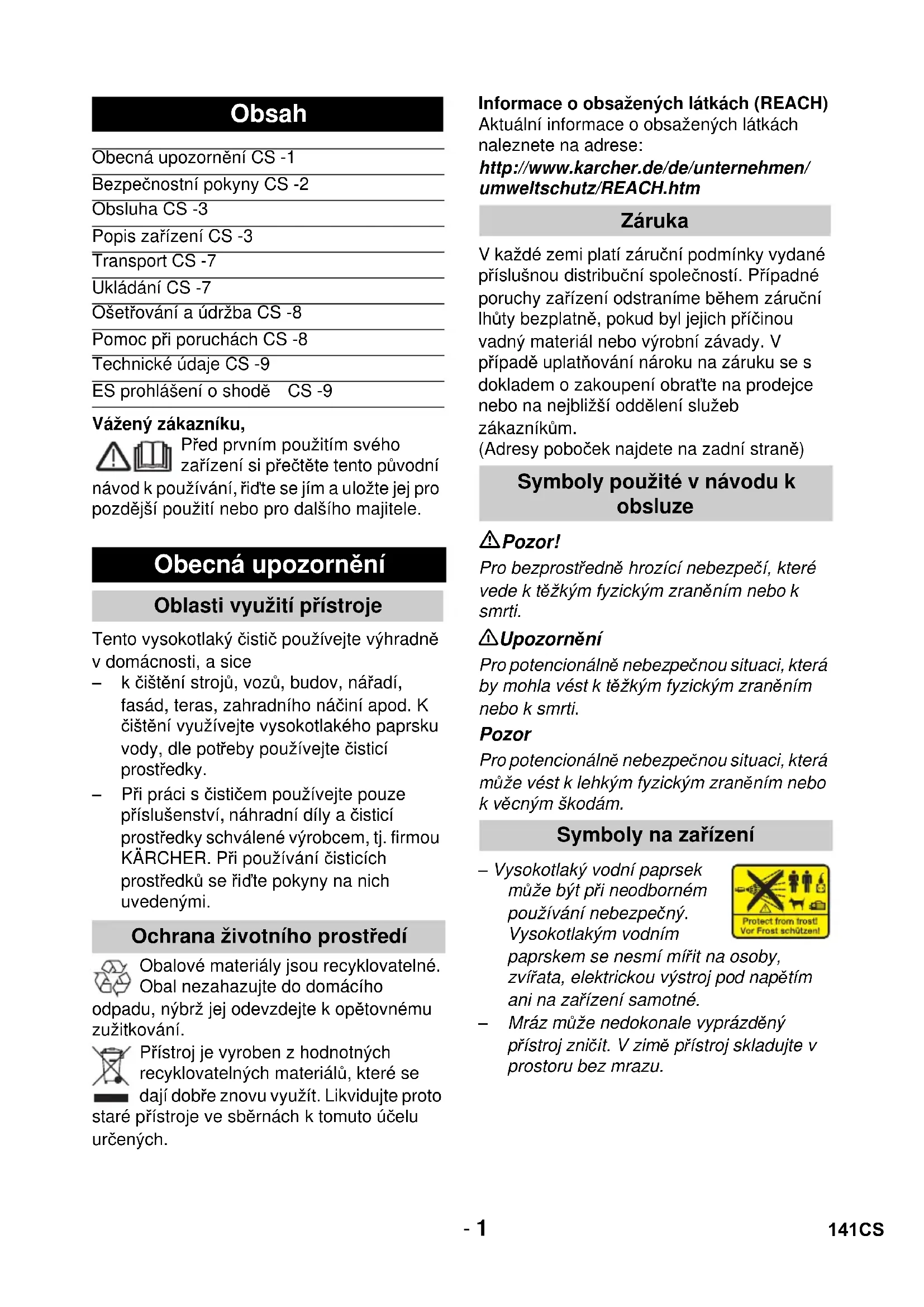 Hangteljesítményszint dB(A) K 3.700 K 4.700 K 5.700 Mért: 90 90 87 Garantált: 92 93 89 CEO Head of Approbation 140 HU- 1 Vážený zákazníku, Před prvním použitím svého zařízení si přečtěte tento původní návod k používání, řiďte se jím a uložte jej pro pozdější použití nebo pro dalšího majitele. Tento vysokotlaký čistič používejte výhradně v domácnosti, a sice – k čištění strojů, vozů, budov, nářadí, fasád, teras, zahradního náčiní apod. K čištění využívejte vysokotlakého paprsku vody, dle potřeby používejte čisticí prostředky. – Při práci s čističem používejte pouze příslušenství, náhradní díly a čisticí prostředky schválené výrobcem, tj. firmou KÄRCHER. Při používání čisticích prostředků se řiďte pokyny na nich uvedenými. Obalové materiály jsou recyklovatelné. Obal nezahazujte do domácího odpadu, nýbrž jej odevzdejte k opětovnému zužitkování. Přístroj je vyroben z hodnotných recyklovatelných materiálů, které se dají dobře znovu využít. Likvidujte proto staré přístroje ve sběrnách k tomuto účelu určených. Informace o obsažených látkách (REACH) Aktuální informace o obsažených látkách naleznete na adrese: http://www.karcher.de/de/unternehmen/ umweltschutz/REACH.htm V každé zemi platí záruční podmínky vydané příslušnou distribuční společností. Případné poruchy zařízení odstraníme během záruční lhůty bezplatně, pokud byl jejich příčinou vadný materiál nebo výrobní závady. V případě uplatňování nároku na záruku se s dokladem o zakoupení obraťte na prodejce nebo na nejbližší oddělení služeb zákazníkům. (Adresy poboček najdete na zadní straně) Pozor! Pro bezprostředně hrozící nebezpečí, které vede k těžkým fyzickým zraněním nebo k smrti. 몇 Upozornění Pro potencionálně nebezpečnou situaci, která by mohla vést k těžkým fyzickým zraněním nebo k smrti. Pozor Pro potencionálně nebezpečnou situaci, která může vést k lehkým fyzickým zraněním nebo k věcným škodám. – Vysokotlaký vodní paprsek může být při neodborném používání nebezpečný. Vysokotlakým vodním paprskem se nesmí mířit na osoby, zvířata, elektrickou výstroj pod napětím ani na zařízení samotné. – Mráz může nedokonale vyprázděný přístroj zničit. V zimě přístroj skladujte v prostoru bez mrazu. Obsah Obecná upozornění CS -1 Bezpečnostní pokyny CS -2 Obsluha CS -3 Popis zařízení CS -3 Transport CS -7 Ukládání CS -7 Ošetřování a údržba CS -8 Pomoc při poruchách CS -8 Technické údaje CS -9 ES prohlášení o shodě CS -9 Obecná upozornění Oblasti využití přístroje Ochrana životního prostředí Záruka Symboly použité v návodu k obsluze Symboly na zařízení 141CS- 2