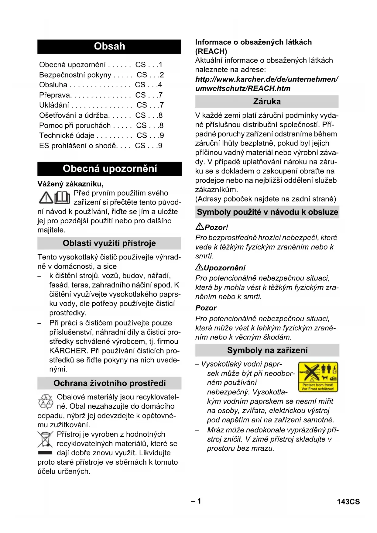 - (Adresy poboček najdete na zadní straně) Pozor! Pro bezprostředně hrozící nebezpečí, které vede k těžkým fyzickým zraněním nebo k smrti. 몇 Upozornění Pro potencionálně nebezpečnou situaci, která by mohla vést k těžkým fyzickým zra- něním nebo k smrti. Pozor Pro potencionálně nebezpečnou situaci, která může vést k lehkým fyzickým zraně- ním nebo k věcným škodám. – Vysokotlaký vodní papr- sek může být při neodbor- ném používání nebezpečný. Vysokotla- kým vodním paprskem se nesmí mířit na osoby, zvířata, elektrickou výstroj pod napětím ani na zařízení samotné. – Mráz může nedokonale vyprázděný pří- stroj zničit. V zimě přístroj skladujte v prostoru bez mrazu. Obsah Obecná upozornění