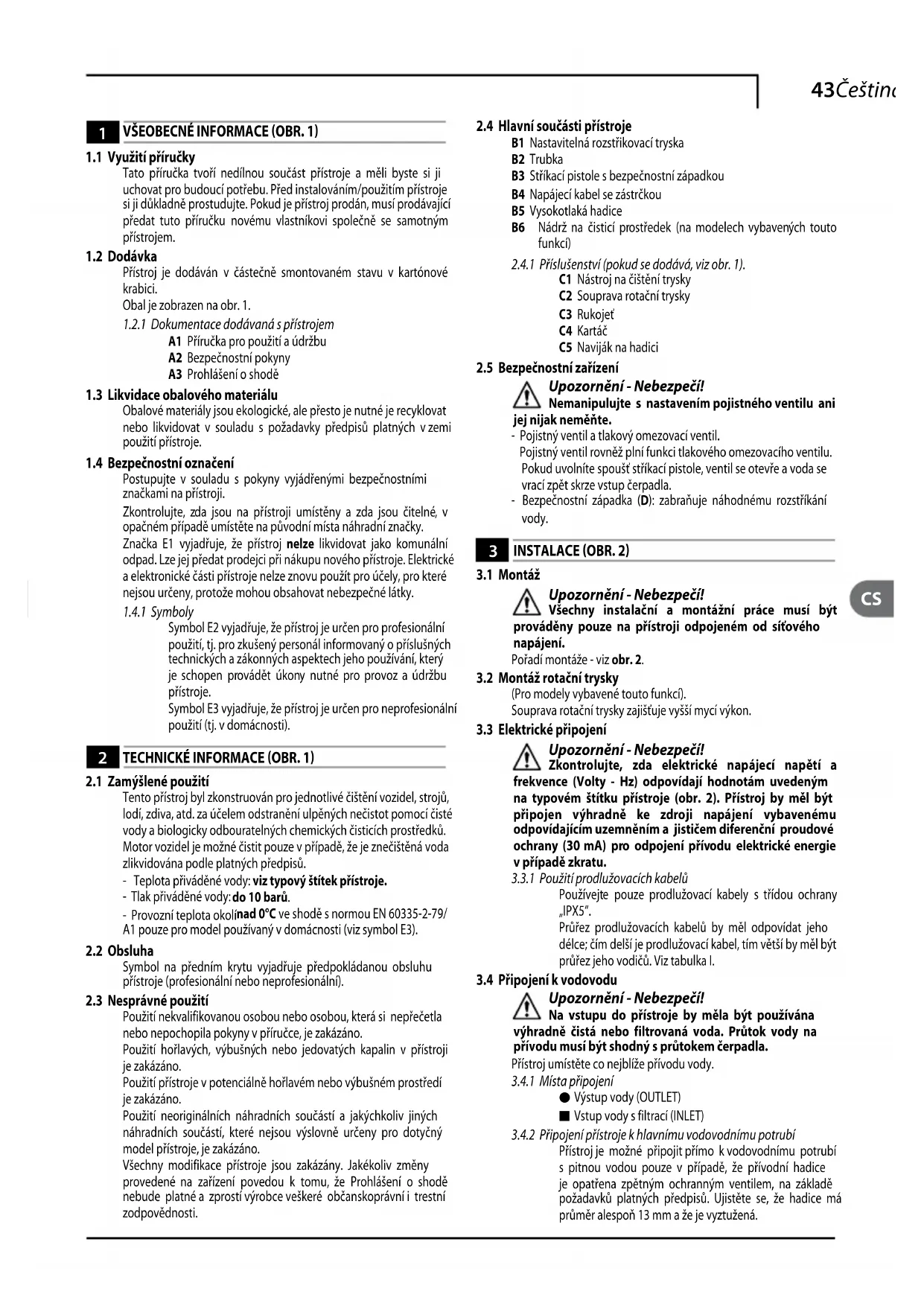 B1 Nastavitelná rozstřikovací tryskaB2 TrubkaB3 Stříkací pistole s bezpečnostní západkouB4 Napájecí kabel se zástrčkouB5 Vysokotlaká hadice B6 Nádrž na čisticí prostředek (na modelech vybavených touto funkcí)