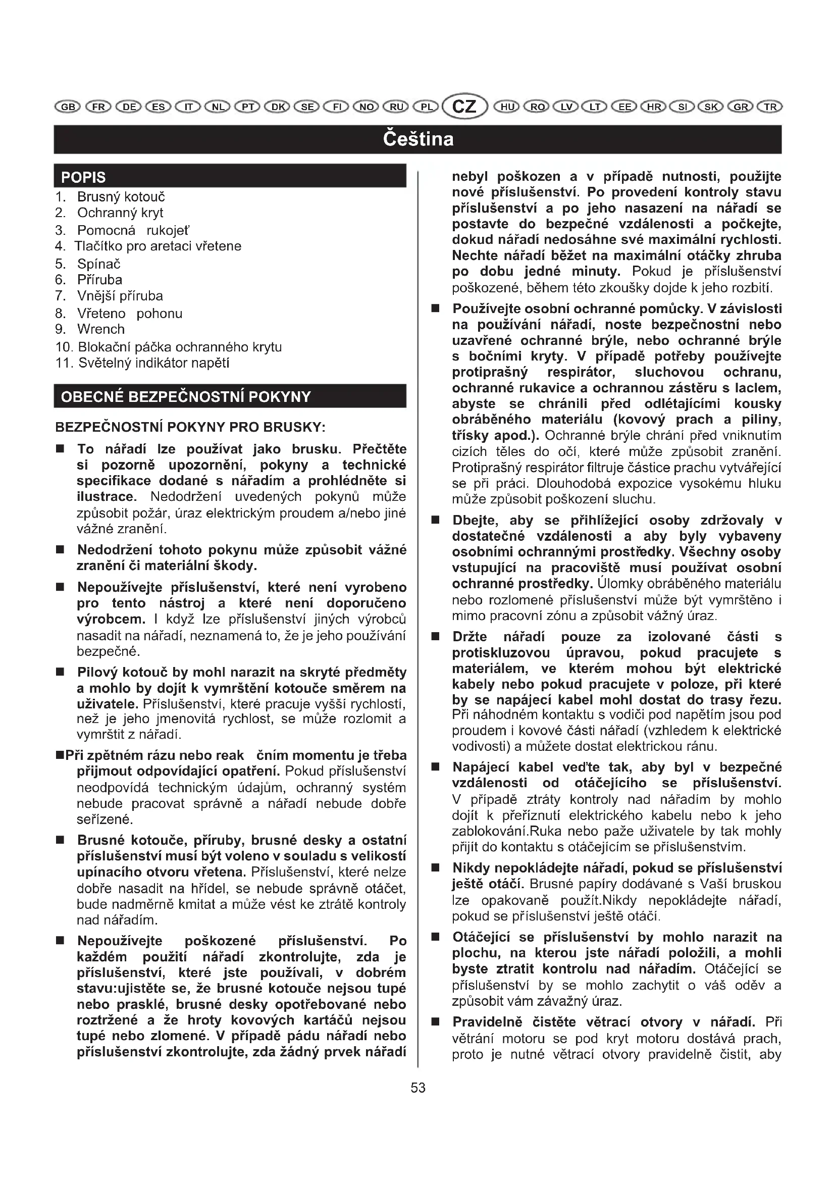 BEZPE$NOSTNÍ POKYNY PRO BRUSKY: To náadí lze používat jako brusku. Pette si pozorn upozornní, pokyny a technické specifikace dodané s náadím a prohlédnte si ilustrace. Nedodržení uvedených pokyn¸ m¸že zp¸sobit požár, úraz elektrickým proudem a/nebo jiné vážné zran·ní. Nedodržení tohoto pokynu mže zpsobit vážné zranní i materiální škody. Nepoužívejte píslušenství, které není vyrobeno pro tento nástroj a které není doporueno výrobcem. I když lze pLíslušenství jiných výrobc¸ nasadit na náLadí, neznamená to, že je jeho používání bezpeMné. Pilový kotou by mohl narazit na skryté pedmty a mohlo by dojít k vymrštní kotoue smrem na uživatele. PLíslušenství, které pracuje vyšší rychlostí, než je jeho jmenovitá rychlost, se m¸že rozlomit a vymrštit z náLadí. Pi zptném rázu nebo reak ním momentu je teba pijmout odpovídající opatení. Pokud pLíslušenství neodpovídá technickým údaj¸m, ochranný systém nebude pracovat správn· a náLadí nebude dobLe seLízené. Brusné kotoue, píruby, brusné desky a ostatní píslušenství musí být voleno v souladu s velikostí upínacího otvoru vetena. PLíslušenství, které nelze dobLe nasadit na hLídel, se nebude správn· otáMet, bude nadm·rn· kmitat a m¸že vést ke ztrát· kontroly nad náLadím. Nepoužívejte poškozené píslušenství. Po každém použití náadí zkontrolujte, zda je píslušenství, které jste používali, v dobrém stavu:ujistte se, že brusné kotoue nejsou tupé nebo prasklé, brusné desky opotebované nebo roztržené a že hroty kovových kartá nejsou tupé nebo zlomené. V pípad pádu náadí nebo píslušenství zkontrolujte, zda žádný prvek náadí nebyl poškozen a v pípad nutnosti, použijte nové píslušenství. Po provedení kontroly stavu píslušenství a po jeho nasazení na náadí se postavte do bezpené vzdálenosti a pokejte, dokud náadí nedosáhne své maximální rychlosti. Nechte náadí bžet na maximální otáky zhruba po dobu jedné minuty. Pokud je pLíslušenství poškozené, b·hem této zkoušky dojde k jeho rozbití. Používejte osobní ochranné pomcky. V závislosti na používání náadí, noste bezpenostní nebo uzavené ochranné brýle, nebo ochranné brýle s boními kryty. V pípad poteby používejte protiprašný respirátor, sluchovou ochranu, ochranné rukavice a ochrannou zástru s laclem, abyste se chránili ped odlétajícími kousky obrábného materiálu (kovový prach a piliny, tísky apod.). Ochranné brýle chrání pLed vniknutím cizích t·les do oMí, které m¸že zp¸sobit zran·ní. Protiprašný respirátor filtruje Mástice prachu vytváLející se pLi práci. Dlouhodobá expozice vysokému hluku