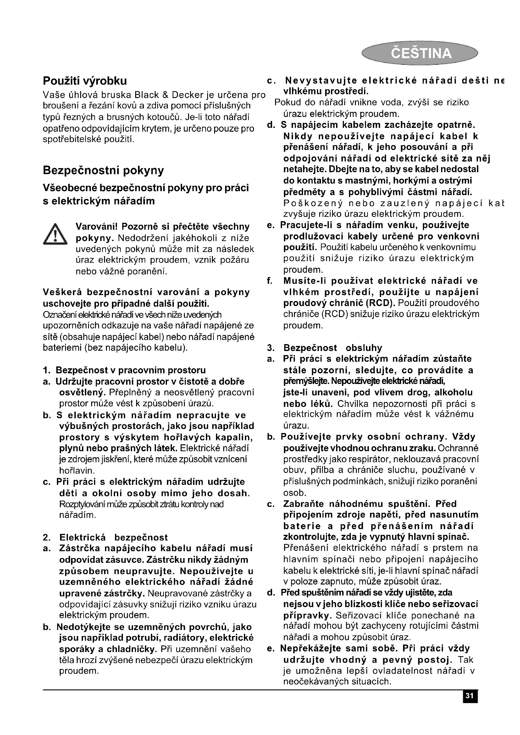Záruka Společnost Black & Decker je přesvědčena o kvalitě svých výrobků a nabízí mimořádnou záruku. Tato záruka je nabízena ve prospěch zákazníka a nijak neovlivní jeho zákonná záruční práva. Tato záruka platí ve všech členských státech EU a v evropské zóně volného obchodu EFTA. Objeví-li se na výrobku Black & Decker, v průběhu 24 měsíců od zakoupení, jakékoli materiálové či vý- robní vady, společnost Black & Decker garantuje ve snaze o minimalizování vašich starostí bezplatnou výměnu vadných dílů, opravu nebo výměnu celého výrobku za níže uvedených podmínek: Výrobek nebyl používán pro obchodní nebo profesionální účely a nedocházelo-li k jeho pronájmu. Výrobek nebyl vystaven nesprávnému použití a nebyla zanedbána jeho předepsaná údržba. Výrobek nebyl poškozen cizím zaviněním. Opravy nebyly prováděny jinými osobami, než autorizovanými opraváři nebo mechaniky auto- rizovaného servisu Black & Decker. Požadujete-li záruční opravu, budete muset pro- dejci nebo zástupci autorizovaného servisu před- ložit doklad o zakoupení výrobku. Místo nejbližšího autorizovaného servisu Black & Decker naleznete na příslušné adrese uvedené v tomto návodu. Seznam autorizovaných servisů Black & Decker a podrobnosti o poprodejním servisu naleznete také na internetové adrese: www.2helpU.com Navštivte prosím naši internetovou stránku www.blackanddecker.co.uk, abyste mohli zaregistrovat váš nový výrobek Black & Decker a kde budete informováni o našich nových výrobcích a speciálních nabídkách. Na adrese www.blackanddecker.co.uk jsou k dispozici další informace o značce Black & Decker a o celé řadě našich dalších výrobků.39 MAGYAR Rendeltetésszerű használat Black & Decker sarokcsiszolóját a megfelelő vágó vagy csiszolótárcsák alkalmazásával csiszolásra, illetve fém és falazat vágására használhatja. A sarokcsiszoló iparszerű felhasználásra nem alkalmas. Biztonsági előírások Elektromos kéziszerszámokra vonatkozó általános biztonsági fi gyelmeztetések Figyelmeztetés! Olvassa el az összes biztonsági fi gyelmeztetést és utasítást. Az utasítások figyelmen kívül hagyása elektromos áramütés veszélyével járhat vagy tüzet és/vagy súlyos balesetet okozhat. Őrizze meg az összes biztonsági fi gyelmeztetést és utasítást. Az "elektromos szerszám" kifejezés a figyelmeztetésekben az Ön által használt vezetékes vagy akkumulátorral üzemeltetett (vezeték nélküli) elektromos szerszámot jelenti.