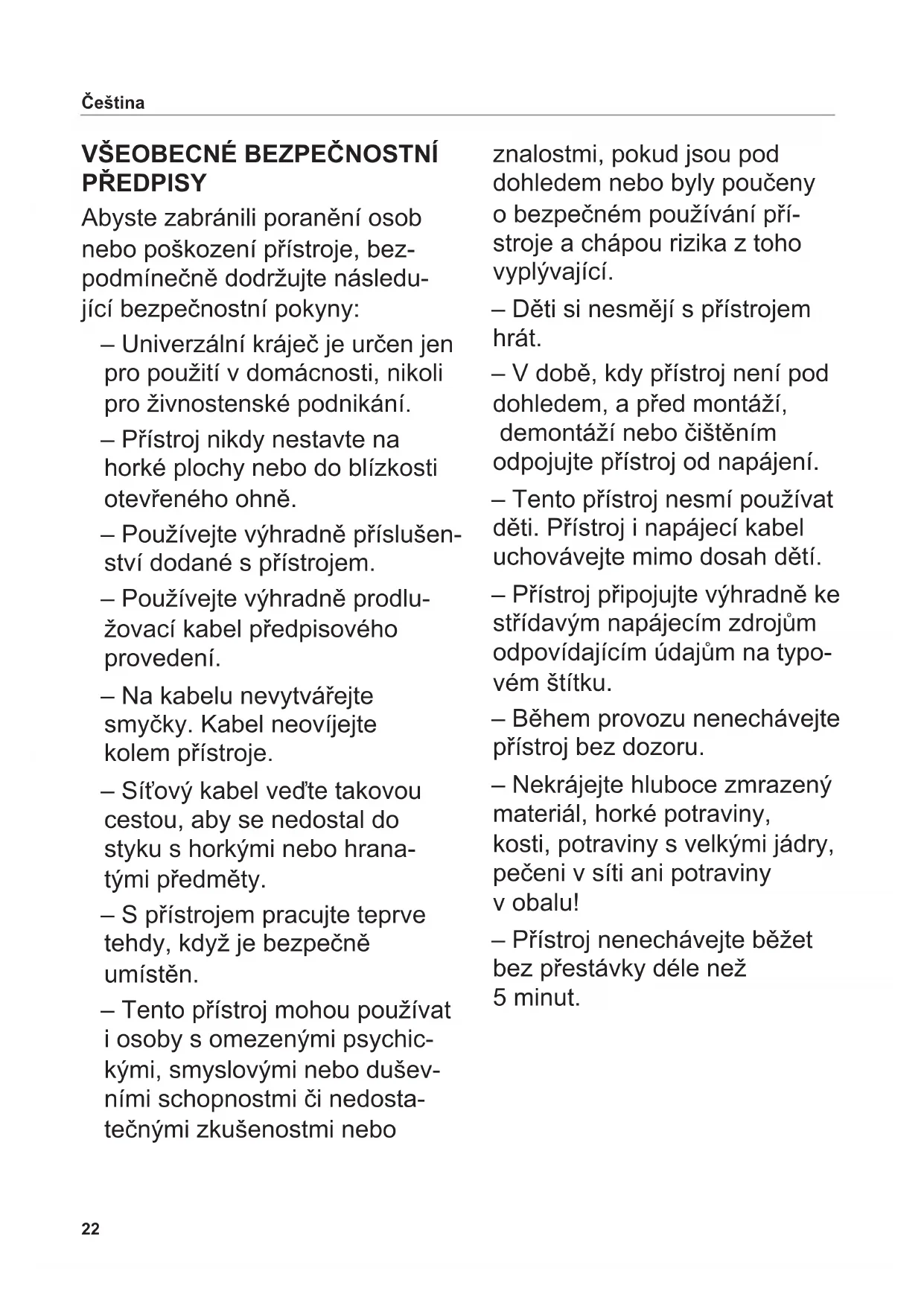 PŘEDPISY Abyste zabránili poranění osob nebo poškození přístroje, bez- podmínečně dodržujte následu- jící bezpečnostní pokyny: – Univerzální kráječ je určen jen pro použití v domácnosti, nikoli pro živnostenské podnikání. – Přístroj nikdy nestavte na horké plochy nebo do blízkosti otevřeného ohně. – Používejte výhradně příslušen- ství dodané s přístrojem. – Používejte výhradně prodlu- žovací kabel předpisového provedení. – Na kabelu nevytvářejte smyčky. Kabel neovíjejte kolem přístroje. – Síťový kabel veďte takovou cestou, aby se nedostal do styku s horkými nebo hrana- tými předměty. – S přístrojem pracujte teprve tehdy, když je bezpečně umístěn. – Tento přístroj mohou používat i osoby s omezenými psychic- kými, smyslovými nebo dušev- ními schopnostmi či nedosta- tečnými zkušenostmi nebo znalostmi, pokud jsou pod dohledem nebo byly poučeny o bezpečném používání pří- stroje a chápou rizika z toho vyplývající. – Děti si nesmějí s přístrojem hrát. – V době, kdy přístroj není pod dohledem, a před montáží, demontáží nebo čištěním odpojujte přístroj od napájení. – Tento přístroj nesmí používat děti. Přístroj i napájecí kabel uchovávejte mimo dosah dětí. – Přístroj připojujte výhradně ke střídavým napájecím zdrojům odpovídajícím údajům na typo- vém štítku. – Během provozu nenechávejte přístroj bez dozoru. – Nekrájejte hluboce zmrazený materiál, horké potraviny, kosti, potraviny s velkými jádry, pečeni v síti ani potraviny v obalu! – Přístroj nenechávejte běžet bez přestávky déle než 5 minut.23 Nebezpečí úrazu elektrickým proudem – Při poruchách provozu, před každým čištěním a před delší nečinností přístroje vždy vytáhněte síťovou zástrčku ze zásuvky. Tahejte přitom za vidlici, nikoli za kabel. – Přístroj nikdy neponořujte do vody. Přístroj nikdy nevysta- vujte dešti nebo jinému půso- bení vlhkosti. Pokud by přístroj přece jen spadl do vody, vytáh- něte nejprve síťovou vidlici ze zásuvky a teprve potom vyta- hujte přístroj z vody. Předtím, než přístroj opět uvedete do provozu, jej nechejte přezkou- šet v autorizovaném servisu. – Přístroj neberte do vlhkých rukou. Nepoužívejte jej, jest- liže je mokrý nebo vlhký, nebo když stojíte na mokré podlaze. Přístroj nepoužívejte venku. – Při jakémkoli poškození sou- částí přístroje ihned přestaňte přístroj používat a spojte se se zákaznickým servisem ritter. – Pokud je poškozen síťový kabel, musí být vyměněn výrobcem, jeho zákaznic- kým servisem nebo příslušně kvalikovanými osobami, aby nedošlo k ohrožení. Nebezpečí poranění – Tento přístroj nesmí být pou- žíván bez saní pro krájený materiál nebo bez posuvného držáku, pokud se nejedná o použití pro velikost a tvar kráje- ného materiálu, který je mimo jejich meze. – Před výměnou příslušenství nebo doplňků, které se za provozu pohybují, musíte přístroj vypnout a odpojit ho od napájení. – Kotoučový nůž je velmi ostrý. – Při provozu se v žádném pří- padě nedotýkejte kotoučového nože! – Před čištěním přístroj vypněte, vytáhněte síťovou vidlici ze zásuvky a kotouč pro seřízení tloušťky řezu přestavte do polohy „0“. – Kotoučový nůž po vypnutí pohonu ještě určitou dobu dobíhá. Čeština24 Odklopte přední a zadní obálku s obrázky. Před uvedením přístroje do provozu si podrobně přečtěte tento návod. Návod k obsluze uschovejte a předejte jej dalšímu uživateli spolu s přístrojem. Aktuální návod k obsluze máte k dispozici i na webu www.ritterwerk.de.