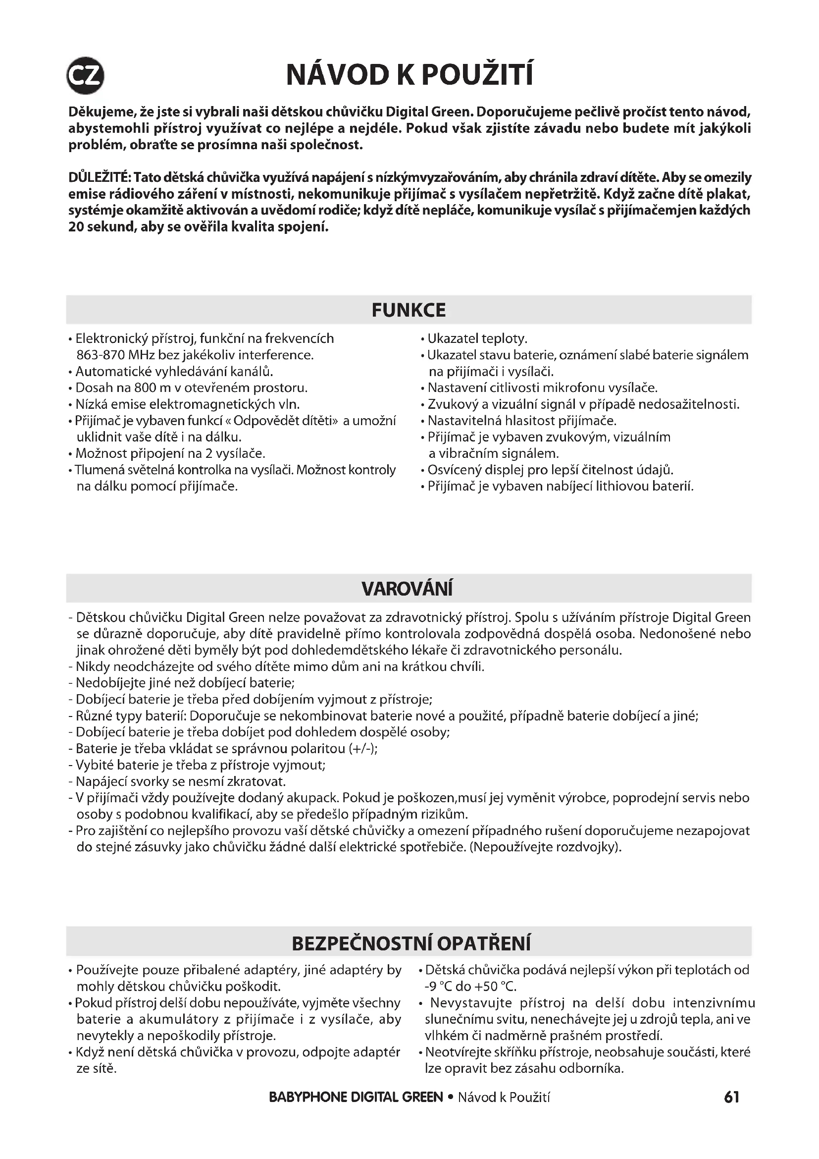 Děkujeme, že jste si vybrali naši dětskou chůvičku Digital Green. Doporučujeme pečlivě pročíst tento návod, abystemohli přístroj využívat co nejlépe a nejdéle. Pokud však zjistíte závadu nebo budete mít jakýkoli problém, obraťte se prosímna naši společnost. DŮLEŽITÉ: Tato dětská chůvička využívá napájení s nízkýmvyzařováním, aby chránila zdraví dítěte. Aby se omezily emise rádiového záření v místnosti, nekomunikuje přijímač s vysílačem nepřetržitě. Když začne dítě plakat, systémje okamžitě aktivován a uvědomí rodiče; když dítě nepláče, komunikuje vysílač s přijímačemjen každých 20 sekund, aby se ověřila kvalita spojení.
