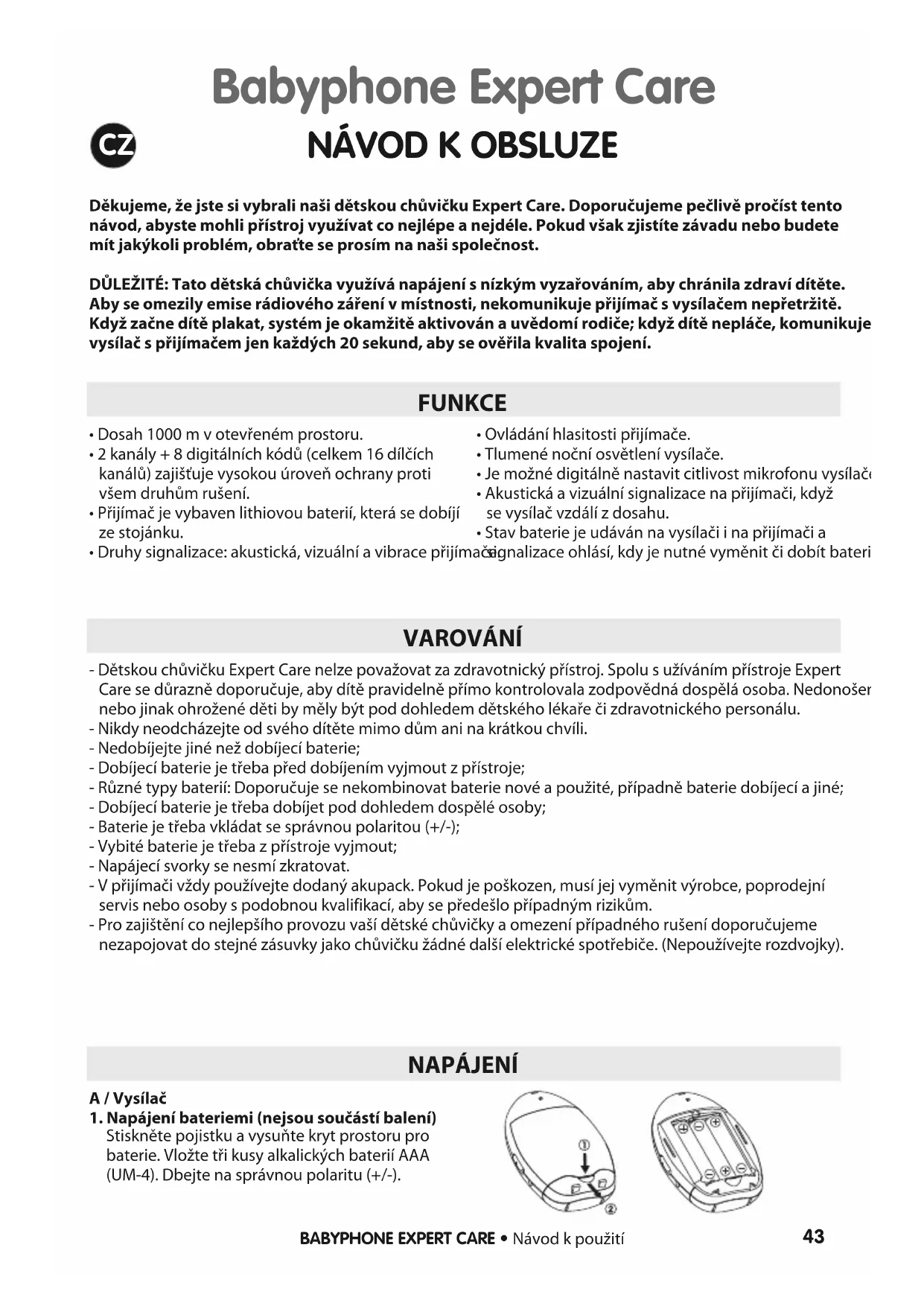 VAROVÁNÍ - Dětskou chůvičku Expert Care nelze považovat za zdravotnický přístroj. Spolu s užíváním přístroje ExpertCare se důrazně doporučuje, aby dítě pravidelně přímo kontrolovala zodpovědná dospělá osoba. Nedonošenénebo jinak ohrožené děti by měly být pod dohledem dětského lékaře či zdravotnického personálu. - Nikdy neodcházejte od svého dítěte mimo dům ani na krátkou chvíli.- Nedobíjejte jiné než dobíjecí baterie;- Dobíjecí baterie je třeba před dobíjením vyjmout z přístroje;- Různé typy baterií: Doporučuje se nekombinovat baterie nové a použité, případně baterie dobíjecí a jiné;- Dobíjecí baterie je třeba dobíjet pod dohledem dospělé osoby;- Baterie je třeba vkládat se správnou polaritou (+/-); - Vybité baterie je třeba z přístroje vyjmout; - Napájecí svorky se nesmí zkratovat. - V přijímači vždy používejte dodaný akupack. Pokud je poškozen, musí jej vyměnit výrobce, poprodejníservis nebo osoby s podobnou kvalifikací, aby se předešlo případným rizikům.- Pro zajištění co nejlepšího provozu vaší dětské chůvičky a omezení případného rušení doporučujemenezapojovat do stejné zásuvky jako chůvičku žádné další elektrické spotřebiče. (Nepoužívejte rozdvojky). NAPÁJENÍ A / Vysílač1. Napájení bateriemi (nejsou součástí balení)Stiskněte pojistku a vysuňte kryt prostoru probaterie. Vložte tři kusy alkalických baterií AAA(UM-4). Dbejte na správnou polaritu (+/-). Babyphone Expert Care