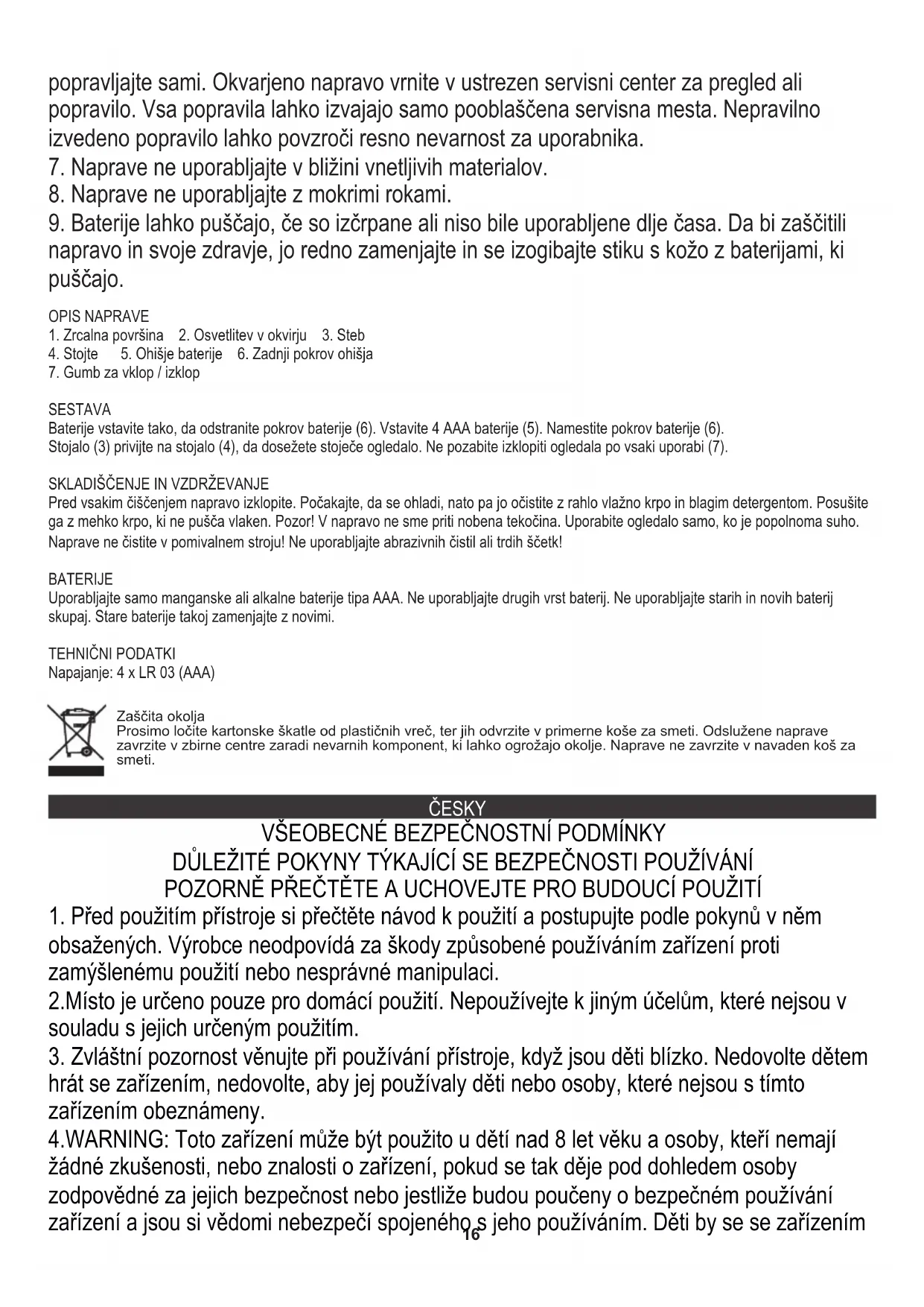 Před každým čištěním přístroj vypněte. Vyčkejte, až vychladne, a pak jej vyčistěte měkkým, mírně navlhčeným hadříkem a jemným čisticím prostředkem. Osušte ho měkkým hadříkem, který nepouští vlákna. Pozor! Do přístroje se nesmí dostat žádná kapalina. Zrcadlo používejte pouze tehdy, když je zcela suché. Přístroj nečistěte v myčce! Nepoužívejte abrazivní čisticí prostředky ani tvrdé kartáče! BATERIE Používejte pouze manganové nebo alkalické baterie typu AAA. Nepoužívejte jiné typy baterií. Nepoužívejte společně staré a nové baterie. Staré baterie ihned vyměňte za nové. TECHNICKÁ DATA Napájení: 4 x LR 03 (AAA) Ochrana životního prostředí. Kartón odevzdejte do sběru. Polyetylénové sáčky (PE) vyhazujte do kontejneru na plasty. Vysloužilý přístroj odevzdejte do příslušného sběrného dvoru, protože některé části zařízení mohou představovat pro životní prostředí nebezpečí. Elektrický přístroj odevzdejte tak, aby se omezilo jeho opětovné používání. Pokud jsou v přístroji baterie, vyjměte je a odevzdejte do příslušného sběrného místa zvlášť. Přístroj nevyhazujte do popelnic ani kontejneru na směsný odpad!! DANSKI ALMINDELIGE SIKKERHEDSBETINGELSER