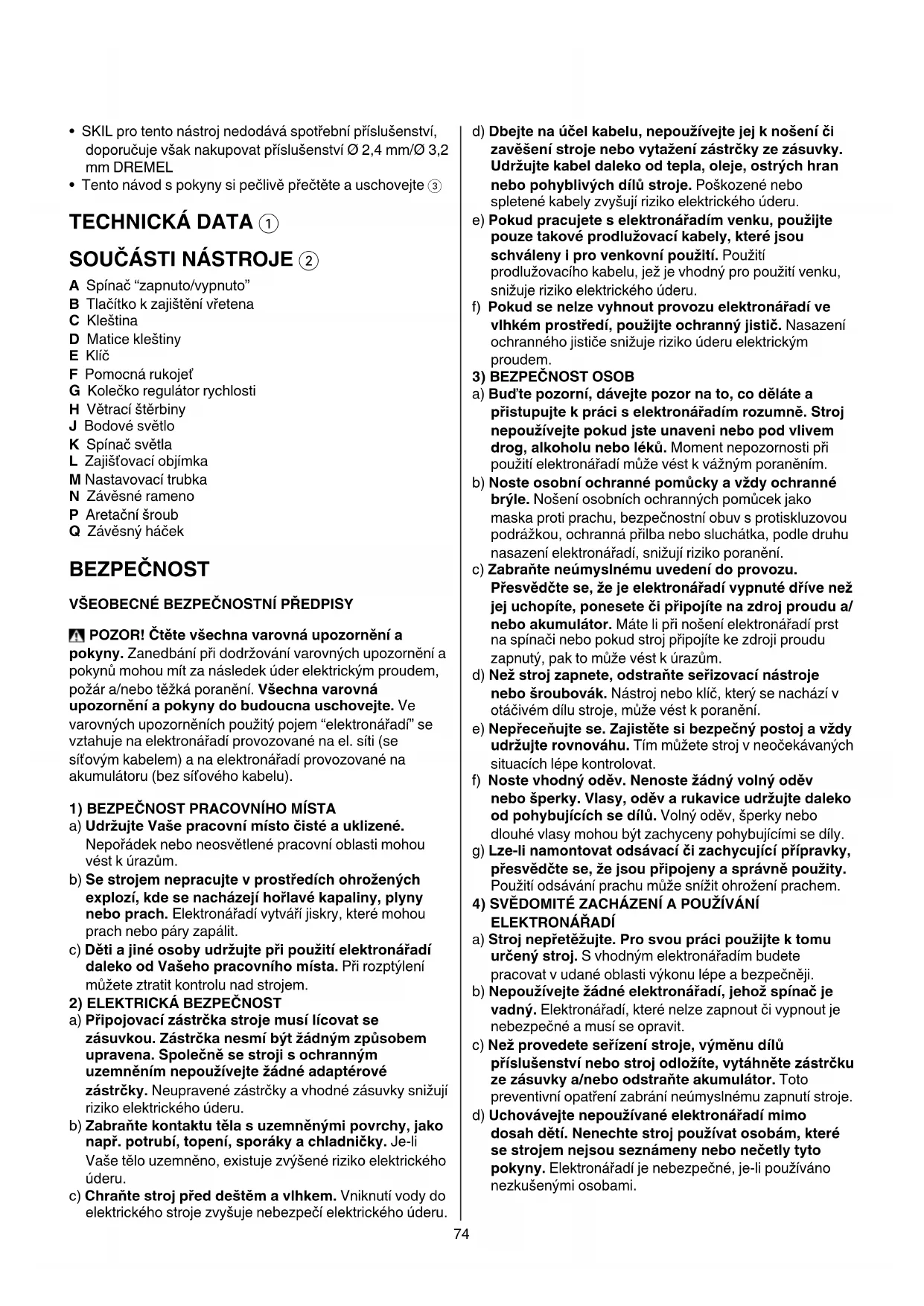 A Spínač “zapnuto/vypnuto” B Tlačítko k zajištění vřetena C Kleština D Matice kleštiny E Klíč F Pomocná rukojeť G Kolečko regulátor rychlosti H Větrací štěrbiny J Bodové světlo K Spínač světla L Zajišťovací objímka M Nastavovací trubka N Závěsné rameno P Aretační šroub Q Závěsný háček BEZPEČNOST