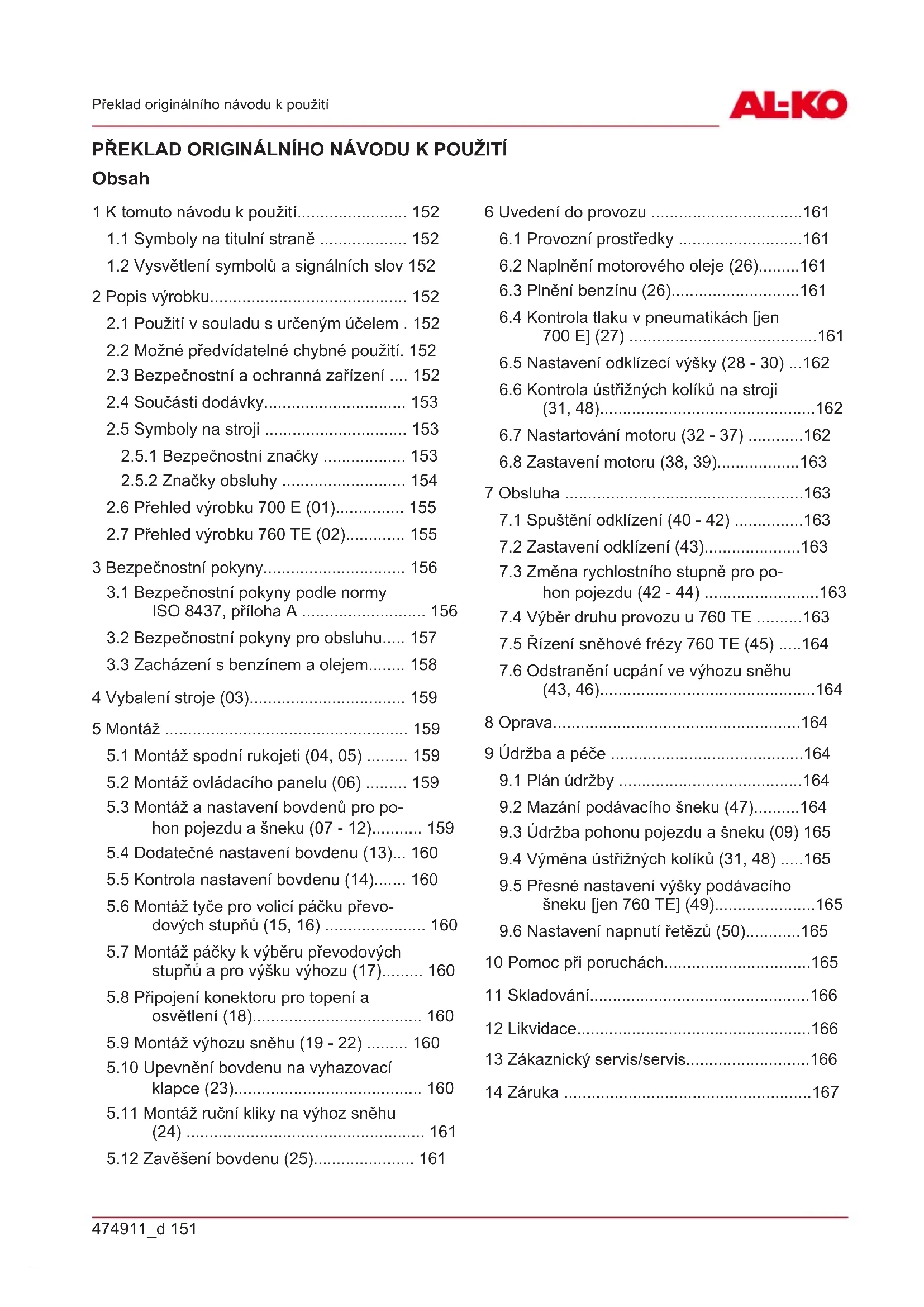 Máte-li nějaké dotazy k záruce, opravě nebo ná- hradním dílům, obraťte se prosím na nejbližší servisAL-KO. Najdete je na internetu pod násle- dující adresou: www.al-ko.com/service-contacts474911_d 167 Záruka 14 ZÁRUKA Případné vady na materiálu či výrobní závady na výrobku odstraníme během zákonné lhůty pro rekla- maci nedostatků, a to dle našeho uvážení buď opravou, nebo dodáním náhradního výrobku. Lhůta pro reklamaci nedostatků se řídí právními ustanoveními země, ve které byl výrobek zakoupen. Naše záruka platí jen vnásledujících případech:
