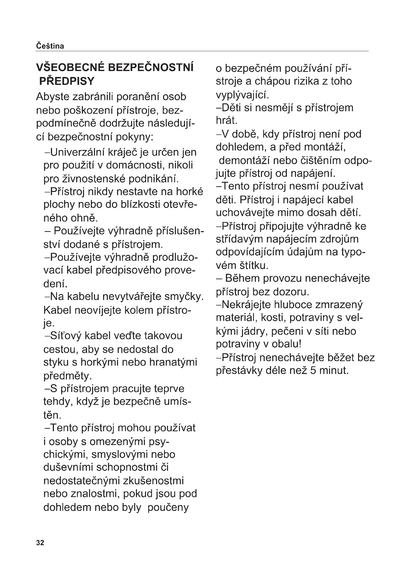 Univerzální kráječ slouží ke kráje- ní běžných potravin v domácnosti. Použití v rozporu s určením nebo nesprávná obsluha mohou vést k závažným zraněním nebo k poškození přístroje. V takovém případě jsou vyloučeny veškeré nároky na případné plnění ze záruky.