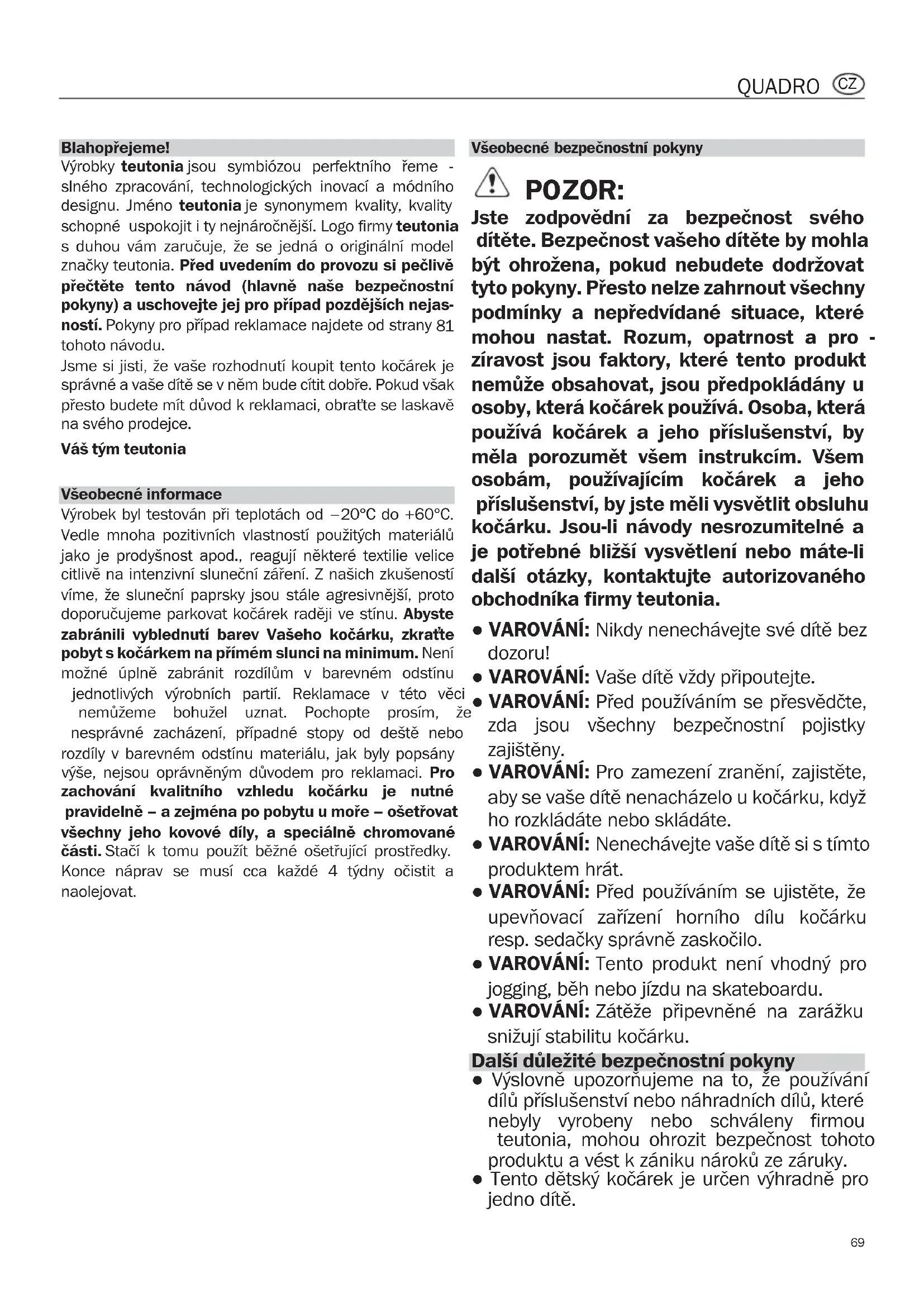 QUADRO RUS Blahopř Výrobky slného z designu. schopné s duhou značky t přečtěte pokyny) ností. Po tohoto n Jsme si správné přesto b na svého Váš tým Všeobec Výrobek Vedle m jako je p citlivě na víme, že doporuč zabránil pobyt s možné jednotliv nemůžem nesprávn rozdíly v výše, ne zachová pravidel všechny části. S Konce n naolejov Quadro_in_mistral_s_08_in.qxd 12.10.11 13:39 Seite 68Všeobecné bezpečnostní pokyny POZOR: Jste zodpovědní za bezpečnost svého dítěte. Bezpečnost vašeho dítěte by mohla být ohrožena, pokud nebudete dodržovat tyto pokyny. Přesto nelze zahrnout všechny podmínky a nepředvídané situace, které mohou nastat. Rozum, opatrnost a pro - zíravost jsou faktory, které tento produkt nemůže obsahovat, jsou předpokládány u osoby, která kočárek používá. Osoba, která používá kočárek a jeho příslušenství, by měla porozumět všem instrukcím. Všem osobám, používajícím kočárek a jeho příslušenství, by jste měli vysvětlit obsluhu kočárku. Jsou-li návody nesrozumitelné a je potřebné bližší vysvětlení nebo máte-li další otázky, kontaktujte autorizovaného obchodníka firmy teutonia. ● VAROVÁNÍ: Nikdy nenechávejte své dítě bez dozoru! ● VAROVÁNÍ: Vaše dítě vždy připoutejte. ● VAROVÁNÍ: Před používáním se přesvědčte, zda jsou všechny bezpečnostní pojistky zajištěny. ● VAROVÁNÍ: Pro zamezení zranění, zajistěte, aby se vaše dítě nenacházelo u kočárku, když ho rozkládáte nebo skládáte. ● VAROVÁNÍ: Nenechávejte vaše dítě si s tímto produktem hrát. ● VAROVÁNÍ: Před používáním se ujistěte, že upevňovací zařízení horního dílu kočárku resp. sedačky správně zaskočilo. ● VAROVÁNÍ: Tento produkt není vhodný pro jogging, běh nebo jízdu na skateboardu. ● VAROVÁNÍ: Zátěže připevněné na zarážku snižují stabilitu kočárku. Další důležité bezpečnostní pokyny ● Výslovně upozorňujeme na to, že používání dílů příslušenství nebo náhradních dílů, které nebyly vyrobeny nebo schváleny firmou teutonia, mohou ohrozit bezpečnost tohoto produktu a vést k zániku nároků ze záruky. ● Tento dětský kočárek je určen výhradně pro jedno dítě.