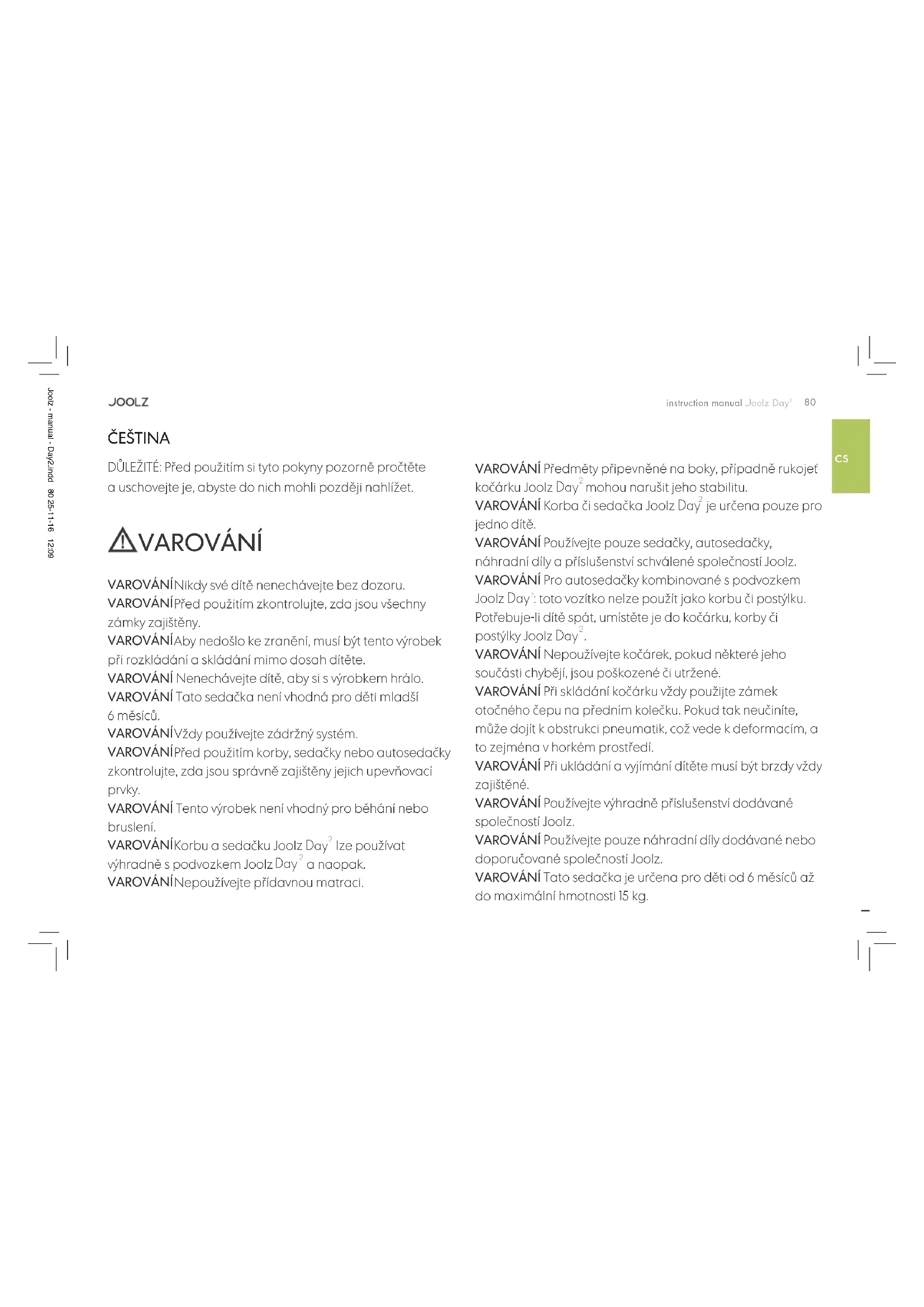 DŮLEŽITÉ: Před použitím si tyto pokyny pozorně pročtěte a uschovejte je, abyste do nich mohli později nahlížet. VAROVÁNÍ VAROVÁNÍ Nikdy své dítě nenechávejte bez dozoru. VAROVÁNÍ Před použitím zkontrolujte, zda jsou všechny zámky zajištěny. VAROVÁNÍ Aby nedošlo ke zranění, musí být tento výrobek při rozkládání a skládání mimo dosah dítěte. VAROVÁNÍ Nenechávejte dítě, aby si s výrobkem hrálo. VAROVÁNÍ Tato sedačka není vhodná pro děti mladší 6 měsíců. VAROVÁNÍ Vždy používejte zádržný systém. VAROVÁNÍ Před použitím korby, sedačky nebo autosedačky zkontrolujte, zda jsou správně zajištěny jejich upevňovací prvky. VAROVÁNÍ Tento výrobek není vhodný pro běhání nebo bruslení. VAROVÁNÍ Korbu a sedačku Joolz Day
