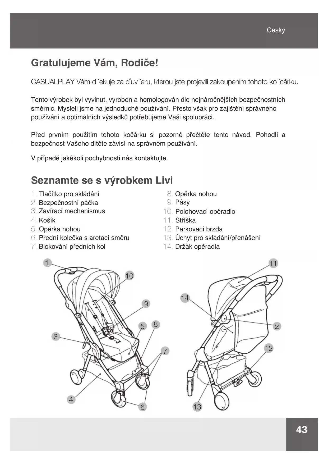 Gratulujeme Vám, Rodie! CASUALPLAY Vám d ˇekuje za d˚uv ˇeru, kterou jste projevili zakoupením tohoto ko ˇcárku. Tento výrobek byl vyvinut, vyroben a homologován dle nejnáročnějších bezpečnostních směrnic. Mysleli jsme na jednoduché používání. Přesto však pro zajištění správného používání a optimálních výsledků potřebujeme Vaši spolupráci. Před prvním použitím tohoto kočárku si pozorně přečtěte tento návod. Pohodlí a bezpečnost Vašeho dítěte závisí na správném používání. V případě jakékoli pochybnosti nás kontaktujte. Seznamte se s výrobkem Livi44 DŮLEŽITÉ – USCHOVAT PRO POZDĚJŠÍ NAHLÉDNUTÍ Tento výrobek je uren pro děti od 0 měsíců a do 15 kg. POZOR: Nenechávejte dítě bez dozoru. POZOR: Před použitím výrobku se ujistěte, zda jsou všechny pojistky zajištěny. POZOR: Při skládání a rozkládání tohoto výrobku zajistěte, aby bylo dítě z dosahu. POZOR: Nedovolujte dětem, aby si hrály s tímto výrobkem. POZOR: Vždy používejte bezpečnostní pásy. POZOR: Před použitím výrobku zkontrolujte, zda jsou všechny mechanismy připevnění lehátka či sedačky řádně aktivovány. POZOR: Nepoužívejte tento výrobek při běhu či bruslení.