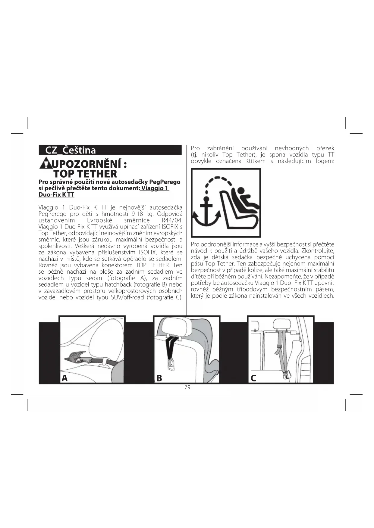 - Juokseva tuotantonumero: hyväksynnän luovutusnumero on turvaistuinkohtainen; kullakin on oma numeronsa. PEG-PÉREGO S.p.A. Peg Pérego S.p.A. on ISO 9001 -sertifioitu yhtiö. Sertifiointi on asiakkaille ja kuluttajille tae siitä, että yritys toimii läpinäkyvästi ja luotettavasti. Peg Pérego voi koska tahansa tehdä tässä julkaisussa kuvattuihin malleihin teknisistä tai kaupallisista syistä muutoksia. Peg Pérego haluaa palvella asiakkaitaan ja vastata parhaansa mukaan kaikkiin heidän tarpeisiinsa. Siksi asiakkaidemme mielipiteet ovat meille erittäin tärkeitä ja arvokkaita. Olisimmekin hyvin kiitollisia, jos haluaisit tuotettamme käytettyäsi täyttää KULUTTAJAN TYYTYVÄISYYSKYSELYN ja kertoa siinä mahdollisista huomautuksistasi ja parannusehdotuksistasi. Kyselyn löydät Internet-sivuiltamme: www.pegperego.com Peg-Pérego-asiakaspalvelu Jos mallin osat sattuvat menemään hukkaan tai ne vaurioituvat, käytä ainoastaan Peg Péregon alkuperäisiä varaosia. Jos tuotteet vaativat korjausta, osia tulee vaihtaa, haluat lisätietoa tuotteista tai tilata alkuperäisiä varaosia ja lisävarusteita, ota yhteyttä Peg Pérego -yhtiön asiakaspalveluun ja jos mahdollista, ilmoita tuotteen sarjanumero. puh. +39 039 60 88 213 fax +39 039 33 09 992 s-posti assistenza@pegperego.it Internet-sivu www.pegperego.com UPOZORNĚNÍ : TOP TETHER Pro správné použití nové autosedačky PegPerego si pečlivě přečtěte tento dokument: Viaggio 1 Duo-Fix K TT Viaggio 1 Duo-Fix K TT je nejnovější autosedačka PegPerego pro děti s hmotností 9-18 kg. Odpovídá ustanovením Evropské směrnice R44/04. Viaggio 1 Duo-Fix K TT využívá upínací zařízení ISOFIX s Top Tether, odpovídající nejnovějším zněním evropských směrnic, které jsou zárukou maximální bezpečnosti a spolehlivosti. Veškerá nedávno vyrobená vozidla jsou ze zákona vybavena příslušenstvím ISOFIX, které se nachází v místě, kde se setkává opěradlo se sedadlem. Rovněž jsou vybavena konektorem TOP TETHER. Ten se běžně nachází na ploše za zadním sedadlem ve vozidlech typu sedan (fotografie A), za zadním sedadlem u vozidel typu hatchback (fotografie B) nebo v zavazadlovém prostoru velkoprostorových osobních vozidel nebo vozidel typu SUV/off-road (fotografie C): CZ_Čeština Pro zabránění používání nevhodných přezek (tj. nikoliv Top Tether), je spona vozidla typu TT obvykle označena štítkem s následujícím logem: Pro podrobnější informace a vyšší bezpečnost si přečtěte návod k použití a údržbě vašeho vozidla. Zkontrolujte, zda je dětská sedačka bezpečně uchycena pomocí pásu Top Tether. Ten zabezpečuje nejenom maximální bezpečnost v případě kolize, ale také maximální stabilitu dítěte při běžném používání. Nezapomeňte, že v případě potřeby lze autosedačku Viaggio 1 Duo- Fix K TT upevnit rovněž běžným tříbodovým bezpečnostním pásem, který je podle zákona nainstalován ve všech vozidlech. BA C80 Děkujeme, že jste si vybrali výrobek Peg-Pérego. Vlastnosti výrobku Dětská sedačka, Skupina 1, „Univerzální“kategorie s bezpečnostními pásy