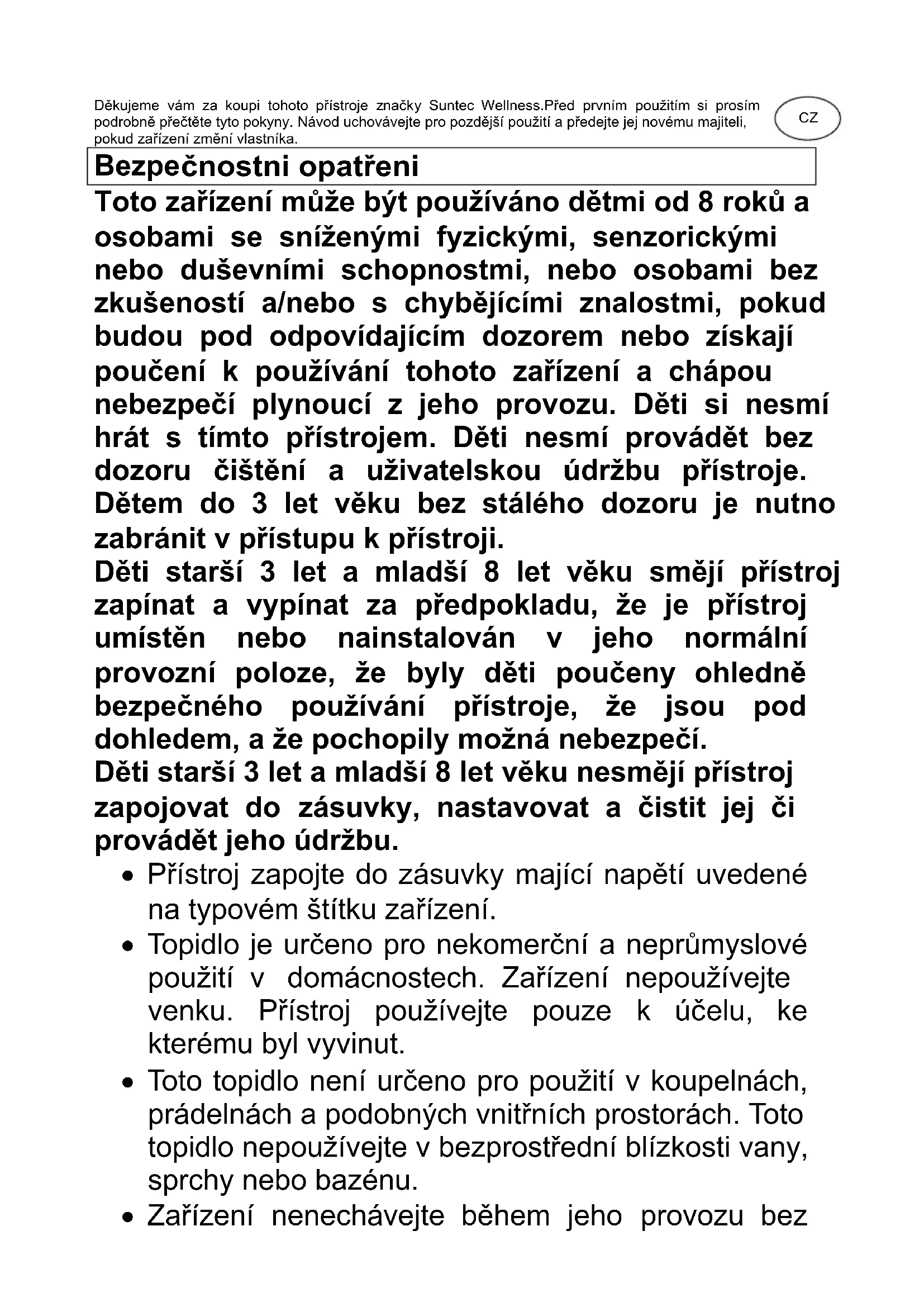 Heat Safe compact SUNTEC WELLNESS GMBH / HOLZSTRASSE 2 / 40 221 DÜSSELDORF / GERMANYDěkujeme vám za koupi tohoto přístroje značky Suntec Wellness.Před prvním použitím si prosím podrobně přečtěte tyto pokyny. Návod uchovávejte pro pozdější použití a předejte jej novému majiteli, pokud zařízení změní vlastníka. Bezpe čnostni opatřeni Toto zařízení může být používáno dětmi od 8 roků a osobami se sníženými fyzickými, senzorickými nebo duševními schopnostmi, nebo osobami bez zkušeností a/nebo s chybějícími znalostmi, pokud budou pod odpovídajícím dozorem nebo získají poučení k používání tohoto zařízení a chápou nebezpečí plynoucí z jeho provozu. Děti si nesmí hrát s tímto přístrojem. Děti nesmí provádět bez dozoru čištění a uživatelskou údržbu přístroje. Dětem do 3 let věku bez stálého dozoru je nutno zabránit v přístupu k přístroji. Děti starší 3 let a mladší 8 let věku smějí přístroj zapínat a vypínat za předpokladu, že je přístroj umístěn nebo nainstalován v jeho normální provozní poloze, že byly děti poučeny ohledně bezpečného používání přístroje, že jsou pod dohledem, a že pochopily možná nebezpečí. Děti starší 3 let a mladší 8 let věku nesmějí přístroj zapojovat do zásuvky, nastavovat a čistit jej či provádět jeho údržbu.