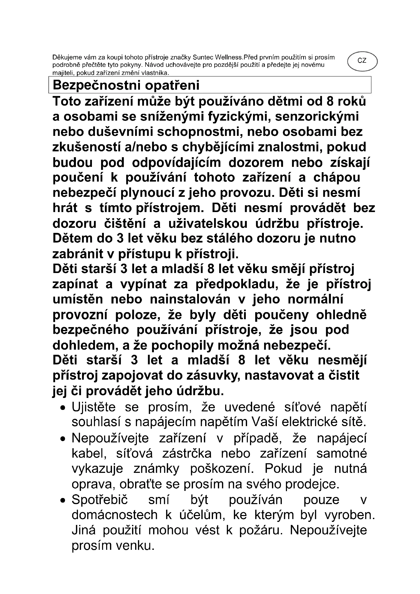 Heat Safe SUNTEC WELLNESS GMBH / HOLZSTRASSE 2 / 40221 DÜSSELDORF / GERMANYCZ Děkujeme vám za koupi tohoto přístroje značky Suntec Wellness.Před prvním použitím si prosím podrobně přečtěte tyto pokyny. Návod uchovávejte pro pozdější použití a předejte jej novému majiteli, pokud zařízení změní vlastníka. Bezpe čnostni opatřeni Toto zařízení může být používáno dětmi od 8 roků a osobami se sníženými fyzickými, senzorickými nebo duševními schopnostmi, nebo osobami bez zkušeností a/nebo s chybějícími znalostmi, pokud budou pod odpovídajícím dozorem nebo získají poučení k používání tohoto zařízení a chápou nebezpečí plynoucí z jeho provozu. Děti si nesmí hrát s tímto přístrojem. Děti nesmí provádět bez dozoru čištění a uživatelskou údržbu přístroje. Dětem do 3 let věku bez stálého dozoru je nutno zabránit v přístupu k přístroji. Děti starší 3 let a mladší 8 let věku smějí přístroj zapínat a vypínat za předpokladu, že je přístroj umístěn nebo nainstalován v jeho normální provozní poloze, že byly děti poučeny ohledně bezpečného používání přístroje, že jsou pod dohledem, a že pochopily možná nebezpečí. Děti starší 3 let a mladší 8 let věku nesmějí přístroj zapojovat do zásuvky, nastavovat a čistit jej či provádět jeho údržbu.