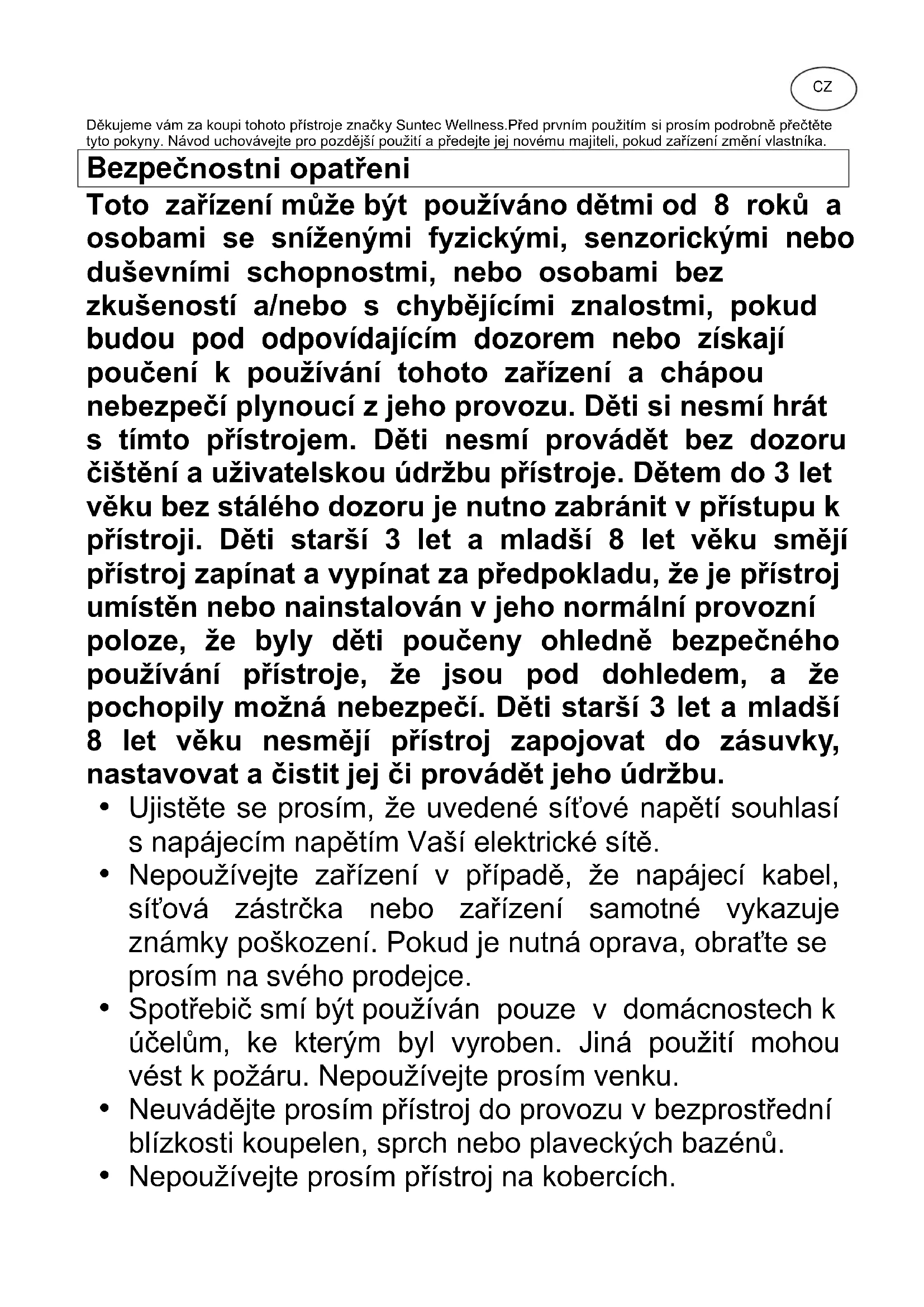 Heat Ray 800 desktop SUNTEC WELLNESS GMBH / HOLZSTRASSE 2 / 40221 DÜSSELDORF / GERMANY spínač ochrany proti prevráteniu prepínač zadný kryt predný kryt ochranná mriežka reflexná plocha kremíková trubicaCZ Děkujeme vám za koupi tohoto přístroje značky Suntec Wellness.Před prvním použitím si prosím podrobně přečtěte tyto pokyny. Návod uchovávejte pro pozdější použití a předejte jej novému majiteli, pokud zařízení změní vlastníka. Bezpe čnostni opatřeni Toto zařízení může být používáno dětmi od 8 roků a osobami se sníženými fyzickými, senzorickými nebo duševními schopnostmi, nebo osobami bez zkušeností a/nebo s chybějícími znalostmi, pokud budou pod odpovídajícím dozorem nebo získají poučení k používání tohoto zařízení a chápou nebezpečí plynoucí z jeho provozu. Děti si nesmí hrát s tímto přístrojem. Děti nesmí provádět bez dozoru čištění a uživatelskou údržbu přístroje. Dětem do 3 let věku bez stálého dozoru je nutno zabránit v přístupu k přístroji. Děti starší 3 let a mladší 8 let věku smějí přístroj zapínat a vypínat za předpokladu, že je přístroj umístěn nebo nainstalován v jeho normální provozní poloze, že byly děti poučeny ohledně bezpečného používání přístroje, že jsou pod dohledem, a že pochopily možná nebezpečí. Děti starší 3 let a mladší 8 let věku nesmějí přístroj zapojovat do zásuvky, nastavovat a čistit jej či provádět jeho údržbu.
