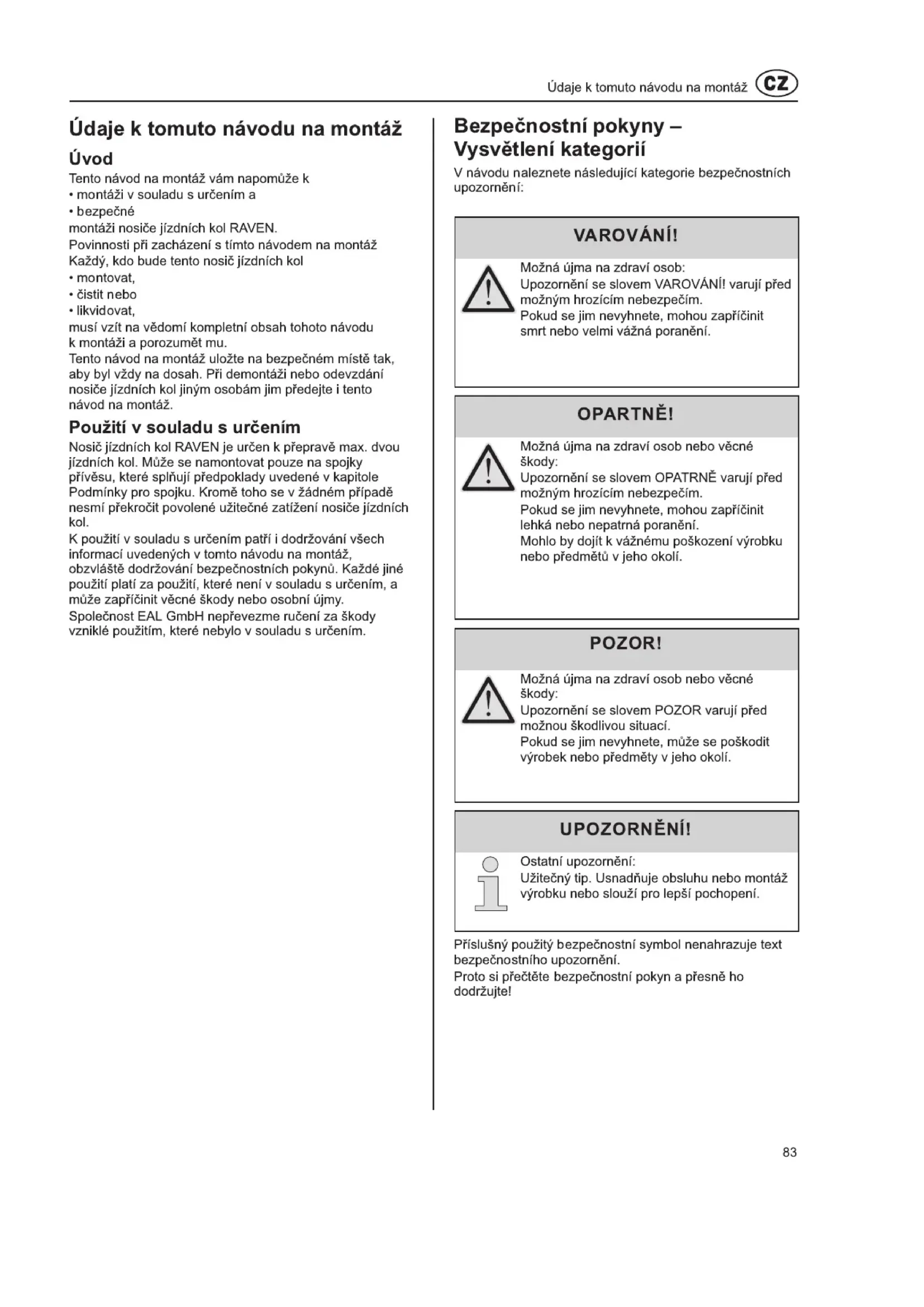 - likvidovat, musí vzít na vědomí kompletní obsah tohoto návodu k montáži a porozumět mu. Tento návod na montáž uložte na bezpečném místě tak, aby byl vždy na dosah. Při demontáži nebo odevzdání nosiče jízdních kol jiným osobám jim předejte i tento návod na montáž. Použití v souladu s určením Nosič jízdních kol RAVEN je určen k přepravě max. dvou jízdních kol. Může se namontovat pouze na spojky přívěsu, které splňují předpoklady uvedené v kapitole Podmínky pro spojku. Kromě toho se v žádném případě nesmí překročit povolené užitečné zatížení nosiče jízdních kol. K použití v souladu s určením patří i dodržování všech informací uvedených v tomto návodu na montáž, obzvláště dodržování bezpečnostních pokynů. Každé jiné použití platí za použití, které není v souladu s určením, a může zapříčinit věcné škody nebo osobní újmy. Společnost EAL GmbH nepřevezme ručení za škody vzniklé použitím, které nebylo v souladu s určením.84 VAROVÁNÍ! Újma na zdraví osob nebo věcné škody v důsledku ztracení jízdních kol. Jízda bez bezpečnostních popruhů může zapříčinit nehody.