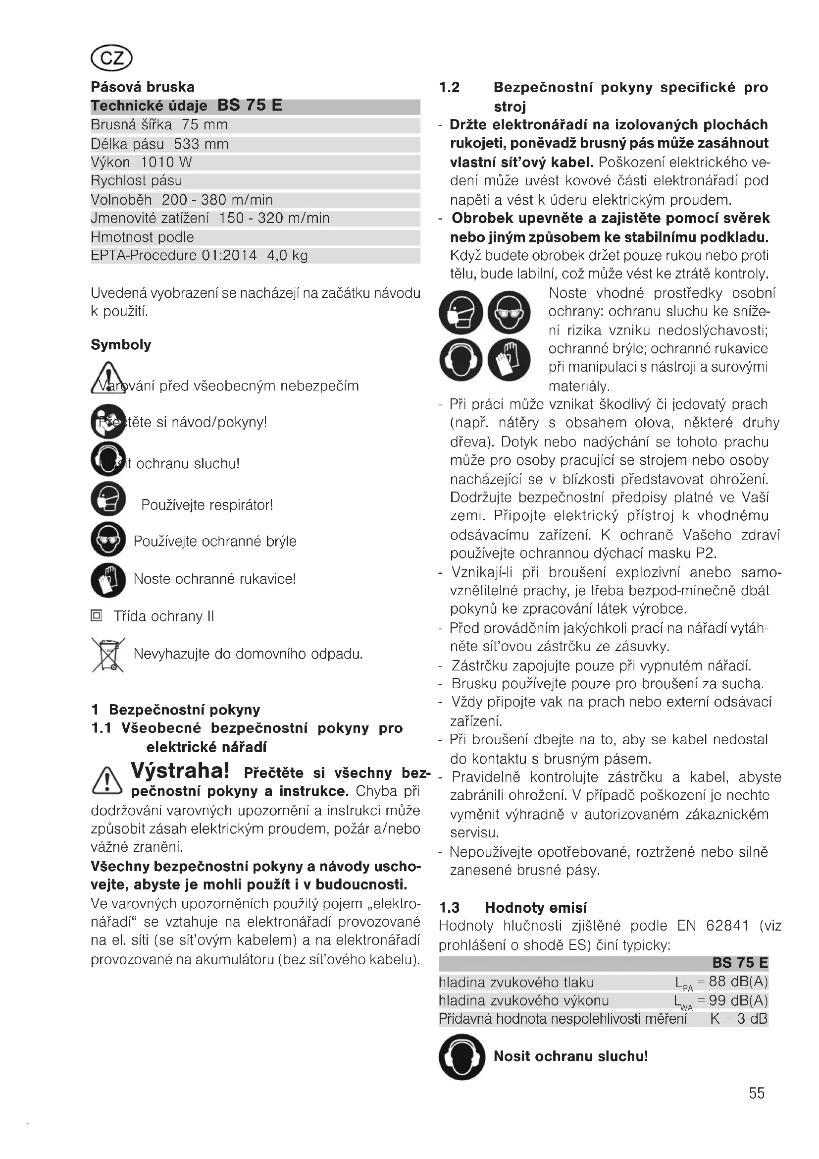 = 6,0 m/s² K = 2,0 m/s² Uvedené emitované hodnoty (vibrace, hlučnost) - slouží k porovnání nářadí, - jsou vhodné také pro předběžné posouzení zatížení vibracemi a hlukem při použití nářadí, - vztahují se k hlavním druhům použití elektrického nářadí. POZOR Emise hluku se mohou – v závislosti na druhu použití elektrického nářadí a zejména na druhu zpracovávaného obrobku – během skutečného použití elektrického nářadí od uvedených hod- not lišit. Určete bezpečnostní opatření pro ochranu obsluhy, která spočívají na odhadu zatíže- ní během skutečných podmínek použití. (Přitom je třeba zohlednit všechny části provozního cyklu, např. doby, ve kterých je elektrické nářadí vypnuto, a doby, ve kterých je sice zapnuté, ale běží bez zatížení.) 2 Použití v souladu s určením Univerzálnì použitelný brusný stroj k broušení døevìných materiálù, umìlých hmot a stavebních materiálù; pøi použití patøièných brusných pásù pro hrubý a jemný brus ploch, hran, lišt a drážek; pomocí typu BS 75 E – Set s nasazením brusného rámu broušení vysoce hodnotných povrchových ploch, napø. dýh a pod. Nesmí se používat na kov a materiály obsahující azbest. Při obrábění kovů může docházet k jiskření, čímž se zvyšuje riziko požáru. Manipulace a použití se dají rozšíøit uvedeným pøíslušenstvím. Musejí být dodržené všeobecnì uznávané pøedpisy pro zábranu úrazù a pøiložené »bezpeènostní pøed- pisy« pro práce s elektrickými nástroji. V pøípadì svévolných zmìn anebo použití cizího pøíslušenství na stroji zaniká nárok záruky výrobce na z tohoto vyplývající škody. Za škody a úrazy pøi neustanoveném použití ruèí použivatel. 3 Pøipojení na sí Napetí síte musí být shodné s napetím uvede- ným na typovém štítku! Jištìní pøi 230 V: 10 A anebo odpovìdný ochranný spínaè vedení. Pøípoj je možný i na zásuvky bez ochranného kontak- tu, jelikož je stroj v izolaèním ochranném provedení (II. tøída). Používejte pouze prodloužovací kabel v rozvi- nutém stavu o prùøezu 3 x 1,5 mm