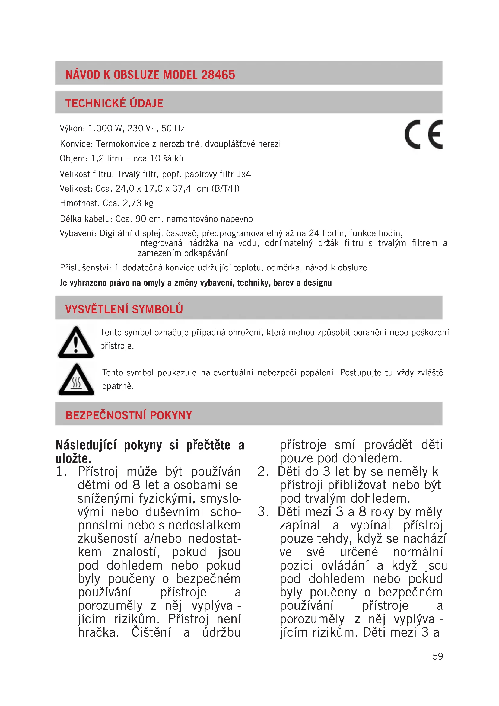Naše vyrobené přístroje mají vysoce kvalitní standard pro zajišt’ění jejich dlouhé životnosti. Pravidel- né údržby i opravy odborně provedeny naším prodejním servisem mohou mít vliv na prodloužení provozní životnosti přístroje. Když je přístroj vadný a už ho nelze opravit, neopomeňte prosím: Toto zařízení nepatří do běžného domovního odpadku, ale musí být předáno do autorizované sběrny pro recyklování elektrických nebo elektronických zařízení. Separátní sběr a recyklování odpadních produktů umožňuje šetření přírodních zdrojů a zajišt’uje, aby byly odpady likvidovány způsobem, který je pro zdraví a kologii přijatelný. Na naše přístroje poskytujeme záruku v trvání 24 měsíců (u průmyslového využití 12 měsíců) od data koupě výrobku, záruka se vztahuje na poškození, která prokazatelne vznikla při správném použití v důsledku výrobních vad. Po dobu záruky budeme odstraňovat materiální i výrobní vady opravou nebo výměnou podle našeho uvážení. Poskytnutí záruky výhradně platí pro zařízení prodány v Německu i Rakousku. V jiných zemích se obrat’te prosím na kompe- tentní dovozce. Přístroje, na které bylo uplatňováno odstranění vad, zašlete prosím smechanicky vyhotovenou kopií nákupního dokladu, ze kterého musí být bezpodmínečně patrný datum nákupu i s popisem vad, přístroj musí být bezpečně zabalen a na- frankován na náš záruční servis. V připadě opravněné záruky jsou kupujícím vraceny poštovní poplatky v Německu i Rakousku. Tato záruka se nevztahuje na poškození způsobená opotřebením, nesprávným zacházením a nedodržováním návodů kúdržbě a obsluze. Záruční doba zaniká, když opravy nebo manipulace s přístrojem byly provedeny třetí osobou. Eventuální nároky zákazníka vůči prodejci/obchodníku nejsou touhle zárukou omezeny.66 Moc: 1.000 W, 230 V~, 50 Hz Dzbanek: Pojemnik termiczne ze stali nierdzewnej Pojemność: 1,2 liter = ok. 10 filiżanek Wielkość filtru: Filtr stały lub papierowy 1 x 4 Wymiary: Ok. szer./gł./wys. 24,0 x 17,0 x 37,4 cm Waga: Ok. 2,73 kg Kabel: Ok. 90 cm, zamontowany na stałe Wyposażenie: Wyświetlacz elektroniczny z funkcją timera (ustawienie do 24h w przód), funkcją zegarka, automatyczne wyłączenie po 2h, wysuwana obudowa filtra z wyjmowanym uchwytem filtra i, funkcją zatrzymania kapania, filtr stały Akcesoria: Łyżeczka do odmierzania, instrukcja obsługi Zmiany i błędy w opisie wyposażenia, technice, kolorach i konstrukcji są zastrzeżone.