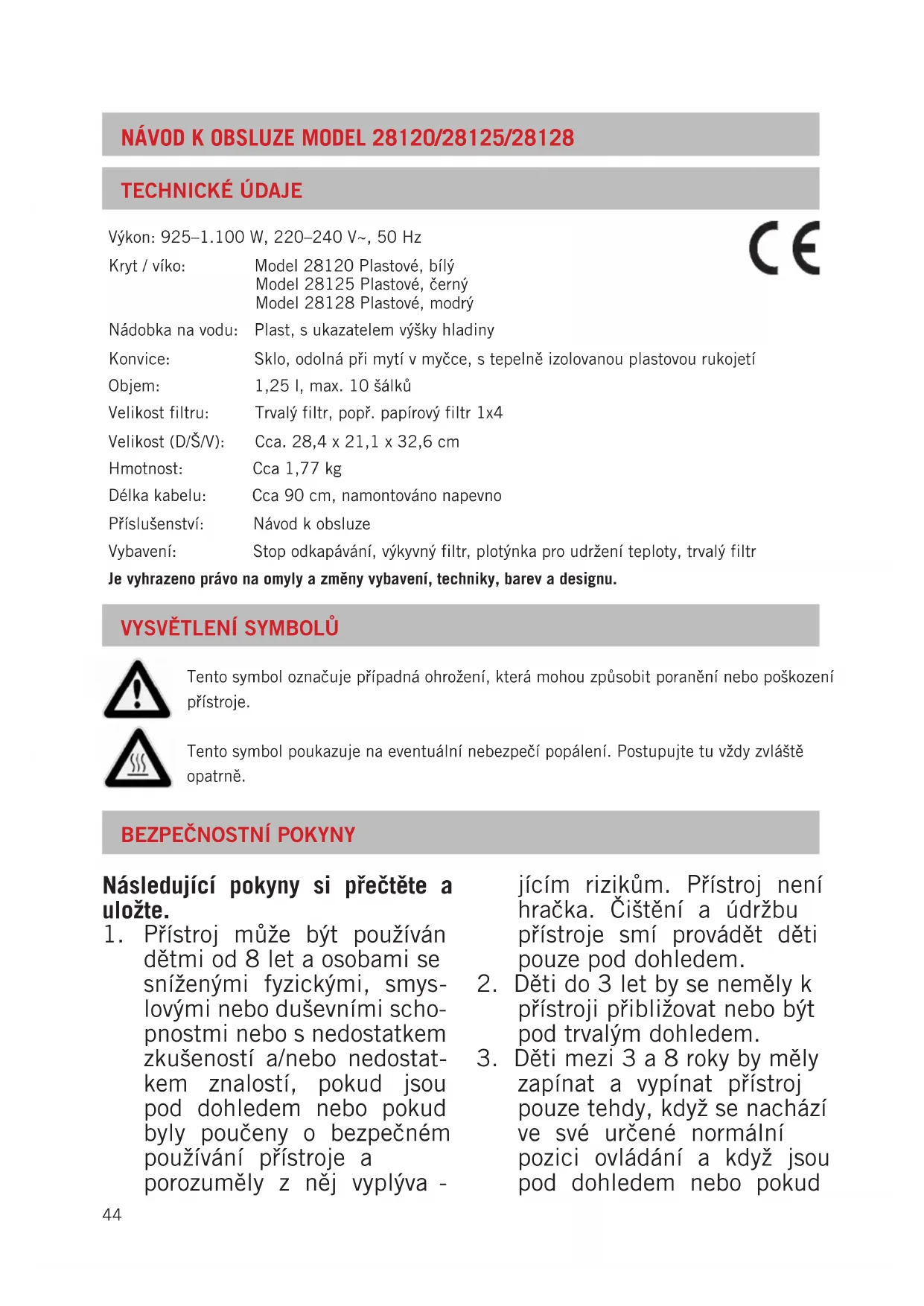 Tento symbol označuje případná ohrožení, která mohou způsobit poranění nebo poškození přístroje. Tento symbol poukazuje na eventuální nebezpečí popálení. Postupujte tu vždy zvláště opatrně. Výkon: 925–1.100 W, 220–240 V~, 50 Hz Kryt / víko: Model 28120 Plastové, bílý Model 28125 Plastové, černý Model 28128 Plastové, modrý Nádobka na vodu: Plast, s ukazatelem výšky hladiny Konvice: Sklo, odolná při mytí v myčce, s tepelně izolovanou plastovou rukojetí Objem: 1,25 l, max. 10 šálků Velikost filtru: Trvalý filtr, popř. papírový filtr 1x4 Velikost (D/Š/V): Cca. 28,4 x 21,1 x 32,6 cm Hmotnost: Cca 1,77 kg Délka kabelu: Cca 90 cm, namontováno napevno Příslušenství: Návod k obsluze Vybavení: Stop odkapávání, výkyvný filtr, plotýnka pro udržení teploty, trvalý filtr Je vyhrazeno právo na omyly a změny vybavení, techniky, barev a designu.45 byly poučeny o bezpečném používání přístroje a porozuměly z něj vyplýva