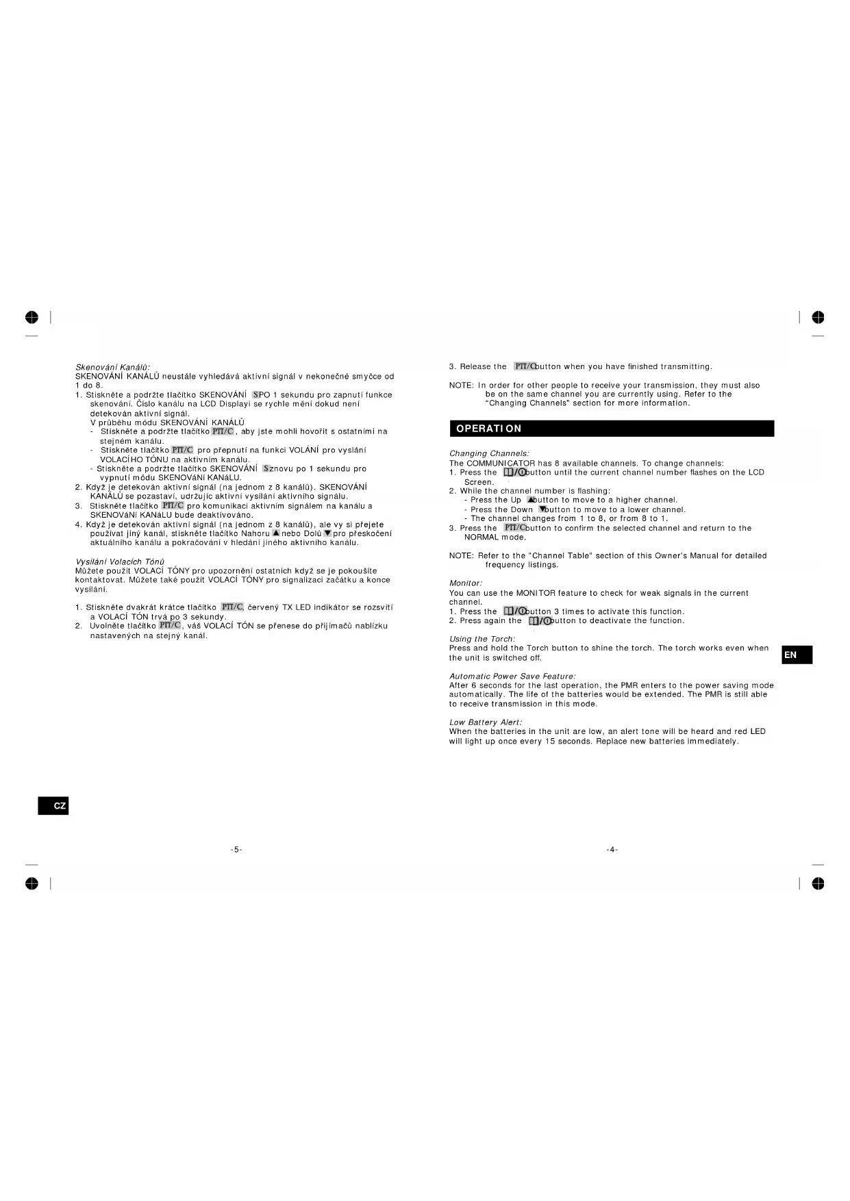 Používání Svítilny: Stiskněte a podržte tlačítko Svítilny pro zapnutí světla. Svítilna funguje i když je jednotka vypnutá. Automatická Funkce Šetření Energie: Po 6 sekundách od poslední operace, vstoupí vysílačka automaticky do módu šetření energie. Tím se prodlužuje životnost baterie. Zařízení je stále schopno přijímat vysílání i v tomto módu. Hlášení Vybité Baterie Když jsou baterky jednotky vybité, uslyšíte varovný tón a červená LED svítí každých 15 sekund. Neprodleně vyměňte baterie za nové.