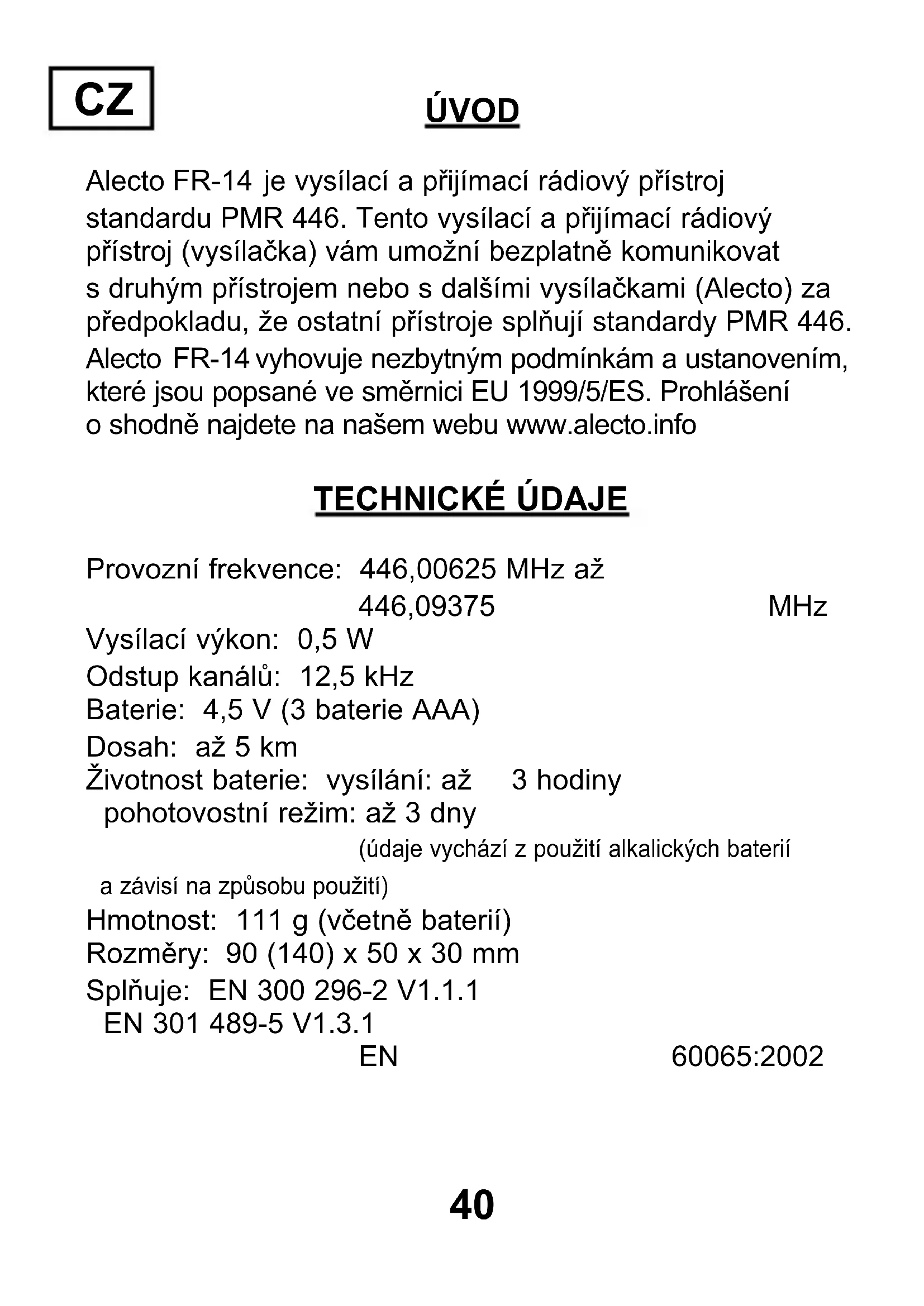OBECNÉ: FR-14 je vysílací a pijímací rádiový pístroj, který používá rádiové vlny v pásmu 446 MHz. Penášený signál mohou rušit vnjší vlivy, jako jsou napíklad jiné vysílací a pijímací rádiové pístroje, vysílae, bezdrátové telefony atd. Pokud vaše vysílaka pijímá nebo vytváí poruchy, mže pomoci pepnutí na jiný kanál. Použití této vysílaky je dovoleno ve všech státech EU. Chcete-li s vysílakou FR-14 cestovat mimo EU, informujte se o místních omezeních, která se týkají pístroj standardu PMR 446. Mjte na pamti, že signál z vaší vysílaky FR-14 mohou zachytit jiné vysílací a pijímací rádiové pístroje nebo pijímae. Není dovoleno provádt žádné zmny elektroniky nebo antény vysílaky FR-14. Údržbu a opravy smí provádt jen kvalifikovaní pracovníci. Vysílaku FR-14 nikdy nepoužívejte venku za bouky.48 ÚDRŽBA: - Vysílaku FR-14 istte vlhkým hadíkem. - Vysílaku nikdy nevystavujte pímému slunenímu záení ani vlhkému prostedí. - Nedovolte, aby do vysílaky FR-14 pronikla voda nebo písek. - Pestane-li vysílaka FR-14 fungovat, nejprve zjistte, zda funguje na jiném míst. RÁDIOVÉ SPOJENÍ: Dosah spojení vysílaky FR-14 je 5 km. Dosah závisí na místních podmínkách, jako je napíklad pítomnost vysokých budov, vedení vysokého naptí a vzduchem vedených drát. Optimálního dosahu dosáhnete, pokud je cesta k vysílace bez pekážek. ŽIVOTNÍ PROSTEDÍ: Chcete-li vysílaku vyhodit, vrate ji svému prodejci, který zajistí její likvidaci zpsobem ohleduplným k životnímu prostedí.49 ZÁRUKA Na vysílaku Alecto FR-14 je poskytována 24msíní záruní lhta, která zaíná bžet ke dni nákupu. V této lht zaruujeme bezplatnou opravu závad vzniklých v dsledku vad materiálu nebo chyb v konstrukci. Tato záruka je poskytována na základ volného rozhodnutí dovozce. POSTUP: Zjistíte-li závadu, nejprve se podívejte do návodu. Pokud se tím problém nevyeší, obrate se na prodejce vysílaky nebo na servisní oddlení spolenosti Alecto (tel.: +31 (0)73 6411 355). ZÁRUKA JE NEPLATNÁ ZA TCHTO PODMÍNEK: Neprofesionální použití, nesprávné spojení, vyteklé nebo špatn umístné baterie, použití díl nebo píslušenství od jiných výrobc než OEM, nedbalost a vady zpsobené vlhkostí, ohnm, záplavou, bleskem a pírodními katastrofami. Neoprávnné úpravy i opravy provádné tetími stranami. Použití obalu nevhodného pro pepravu pístroje a neposkytnutí pístroje s tímto záruním prohlášením a dokladem o nákupu. Záruka nezahrnuje baterie a anténu. Tato záruka nezahrnuje žádnou další odpovdnost, zejména odpovdnost za následnou škodu.50 ÚVOD Alecto FR-14 je obojsmerná rádiostanica PMR-446. Táto obojsmerná rádiostanica vám umožní komunikova navzájom alebo s inými (Alecto) obojsmernými rádiostanicami bezplatne za predpokladu, že zariadenia konštrukne vyhovujú normám PMR-446. Alecto FR-14 vyhovuje základným podmienkam a ustanoveniam uvedeným v smernici EÚ 1999/5/ES. Vyhlásenie o zhode je k dispozícii na našej internetovej stránke www.alecto.info TECHNICKÉ PARAMETRE Prevádzková frekvencia: 446,00625 MHz až 446,09375 MHz Vysielací výkon: 0,5 Wattu Rozstup kanálov: 12,5 kHz Batéria: 4,5 V (3x batérie AAA) Dosah: Do 5 km Životnos batérie: Vysielanie: do 3 hodín Pohotovostný režim: do 3 dní (v prípade alkalických batérií a v závislosti od používania) Hmotnos: 111 g (s batériami) Rozmery: 90 (140) x 50 x 30 mm Vyhovuje norme: EN 300 296-2 V1.1.1 EN 301 489-5 V1.3.1 EN 60065:2002 SK51 NAPÁJANIE Rádiostanica FR-14 je napájaná tromi batériami typu AAA.
