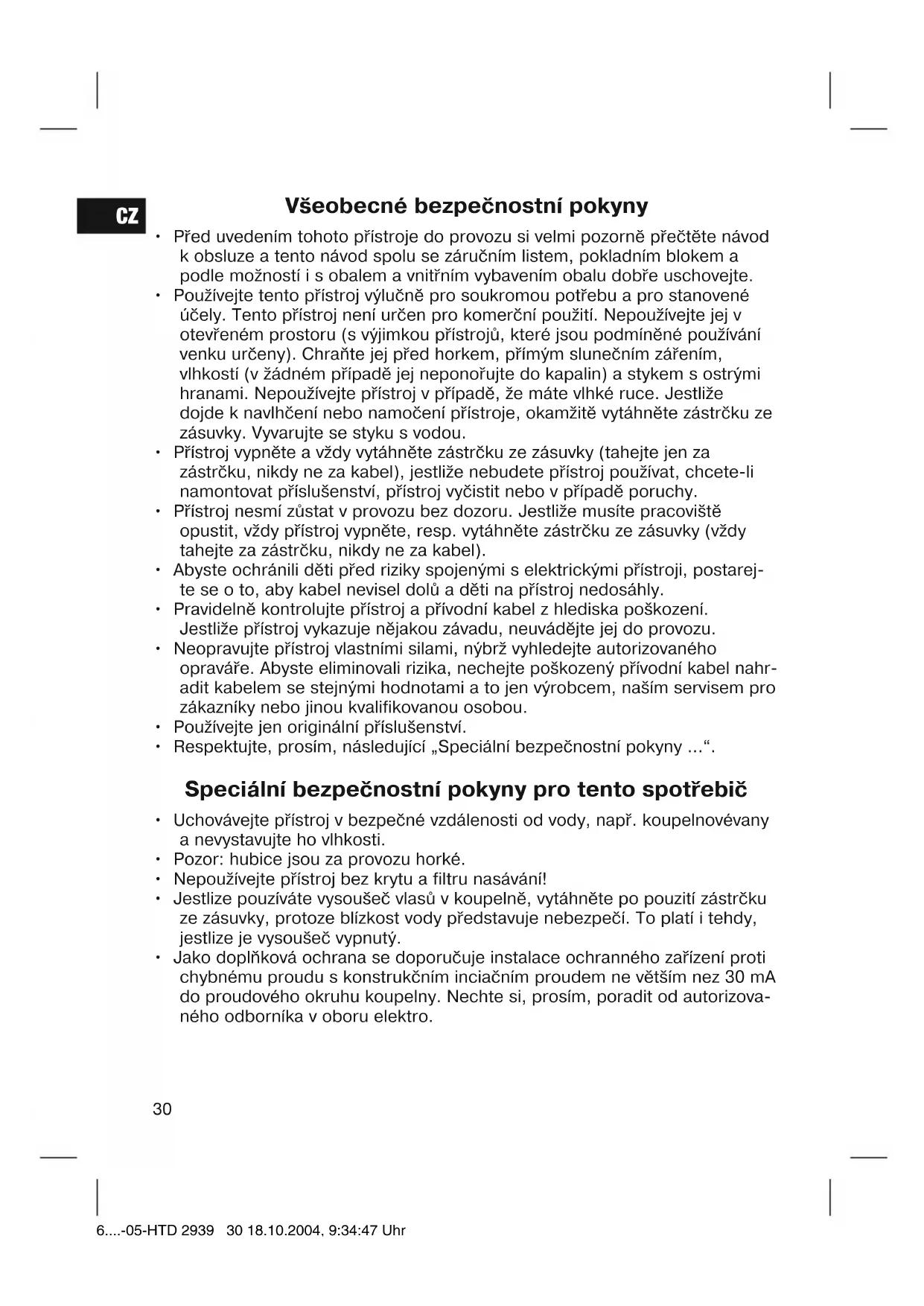 - Jako doplňková ochrana se doporučuje instalace ochranného zařízení proti chybnému proudu s konstrukčním inciačním proudem ne větším nez 30 mA do proudového okruhu koupelny. Nechte si, prosím, poradit od autorizova- ného odborníka v oboru elektro. 6....-05-HTD 2939 30 18.10.2004, 9:34:47 UhrCZ