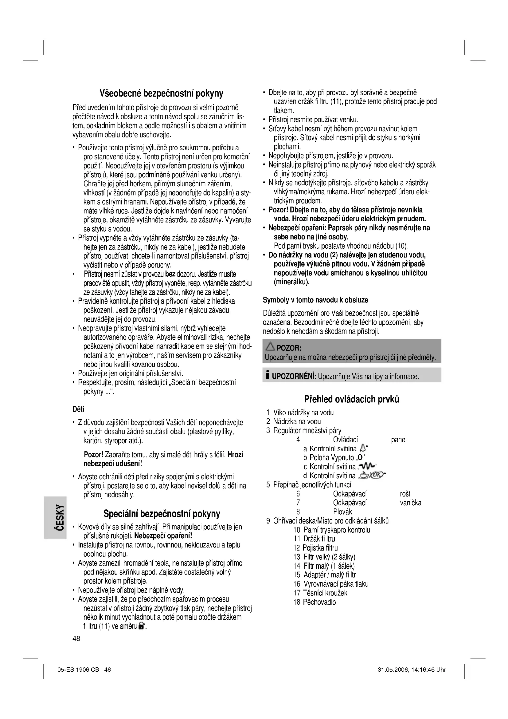 - Do nádržky na vodu (2) nalévejte jen studenou vodu, používejte výlučně pitnou vodu. V žádném případě nepoužívejte vodu smíchanou s kyselinou uhličitou (minerálku). Symboly v tomto návodu k obsluze Důležitá upozornění pro Vaši bezpečnost jsou speciálně označena. Bezpodmínečně dbejte těchto upozornění, aby nedošlo k nehodám a škodám na přístroji. POZOR: Upozorňuje na možná nebezpečí pro přístroj či jiné předměty. UPOZORNĚNÍ: Upozorňuje Vás na tipy a informace. Přehled ovládacích prvků 1 Víko nádržky na vodu 2 Nádržka na vodu 3 Regulátor množství páry 4 Ovládací panel a Kontrolní svítilna „ “ b Poloha Vypnuto „O“ c Kontrolní svítilna „ “ d Kontrolní svítilna „ / “ 5 Přepínač jednotlivých funkcí 6 Odkapávací rošt 7 Odkapávací vanička 8 Plovák 9 Ohřívací deska/Místo pro odkládání šálků 10 Parní tryskapro kontrolu 11 Držák fi ltru 12 Pojistka fi ltru 13 Filtr velký (2 šálky) 14 Filtr malý (1 šálek) 15 Adaptér / malý fi ltr 16 Vyrovnávací páka tlaku 17 Těsnící kroužek 18 Pěchovadlo 05-ES 1906 CB 48 31.05.2006, 14:16:46 UhrČESKY