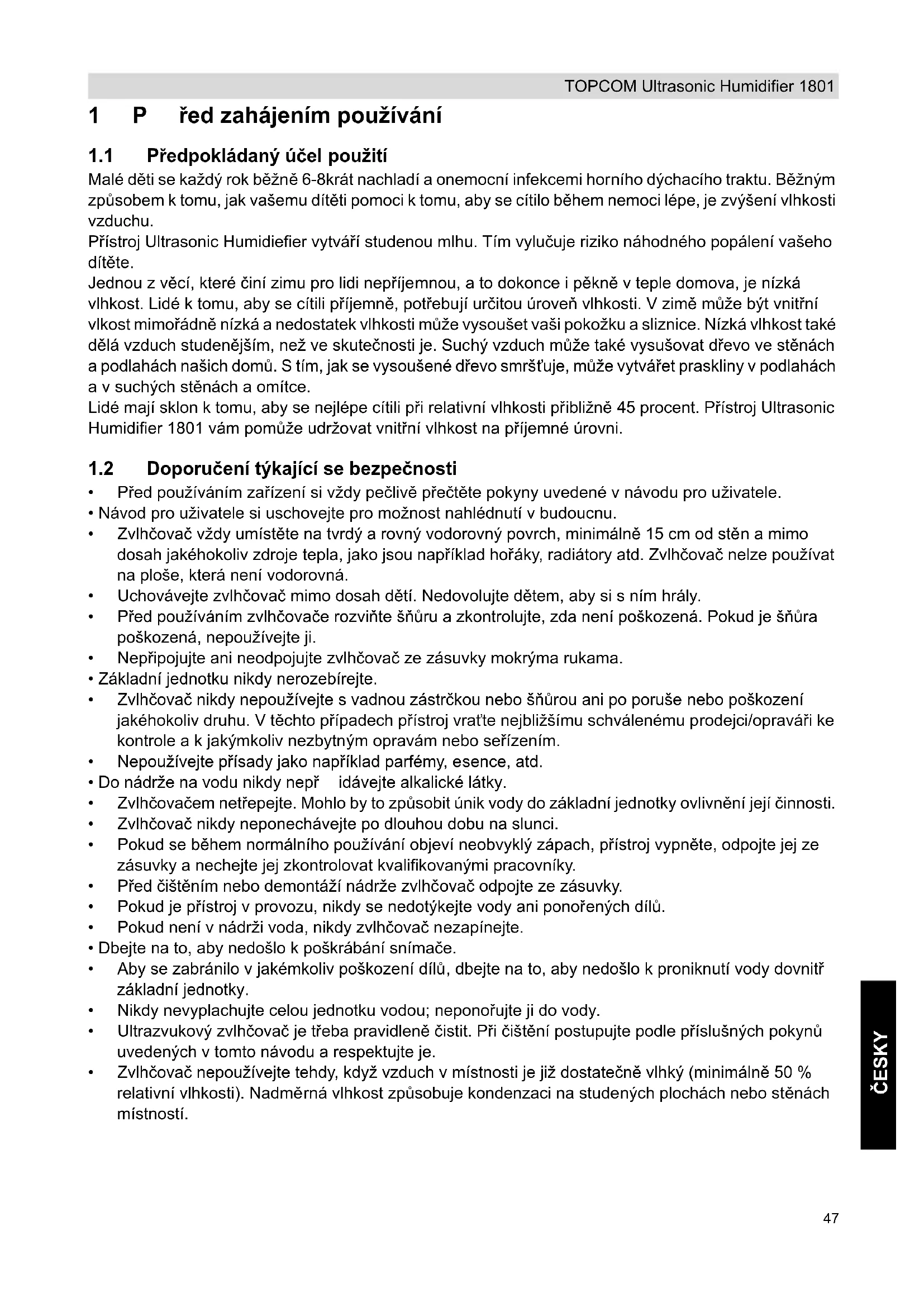 - Zvlhčovač nepoužívejte tehdy, když vzduch v místnosti je již dostatečně vlhký (minimálně 50 % relativní vlhkosti). Nadmě rná vlhkost způsobuje kondenzaci na studených plochách nebo stěnách místností. HL_Ultrasonic Humidifier 1801 D106.book Page 47 Sunday, May 29, 2011 7:33 PM48 TOPCOM Ultrasonic Humidifier 1801 2 Technické specifikace – Kapacita dodávky vlhkosti: 300ml/h – Objem nádrže na vodu: 6 l – Jmenovité napětí: 230 V střídavé – Jmenovitý kmitočet: 50Hz – Jmenovitý výkon: 50 W – Zajistěte ochranu proti úrazu elektrickým proudem: Třída II 3Popis a. Řídící tyč b. Víčko vstupu vody c. Detekce nízké hladiny vody d. Napájecí šňůra e. Klávesnice f. LCD displej g. Přívod vody h. Nádrž na vodu