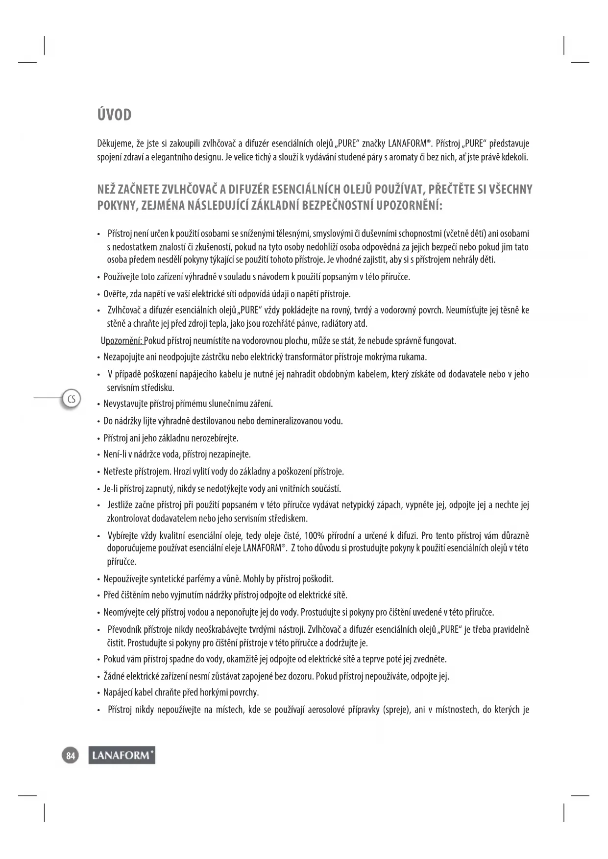 ÚVOD Děkujeme, že jste si zakoupili zvlhčovač a difuzér esenciálních olejů „PURE“ značky LANAFORM®. Přístroj „PURE“ představuje spojení zdraví a elegantního designu. Je velice tichý a slouží k vydávání studené páry s aromaty či bez nich, ať jste právě kdekoli. NEŽ ZAČNETE ZVLHČOVAČ A DIFUZÉR ESENCIÁLNÍCH OLEJŮ POUŽÍVAT, PŘEČTĚTE SI VŠECHNY POKYNY, ZEJMÉNA NÁSLEDUJÍCÍ ZÁKLADNÍ BEZPEČNOSTNÍ UPOZORNĚNÍ: