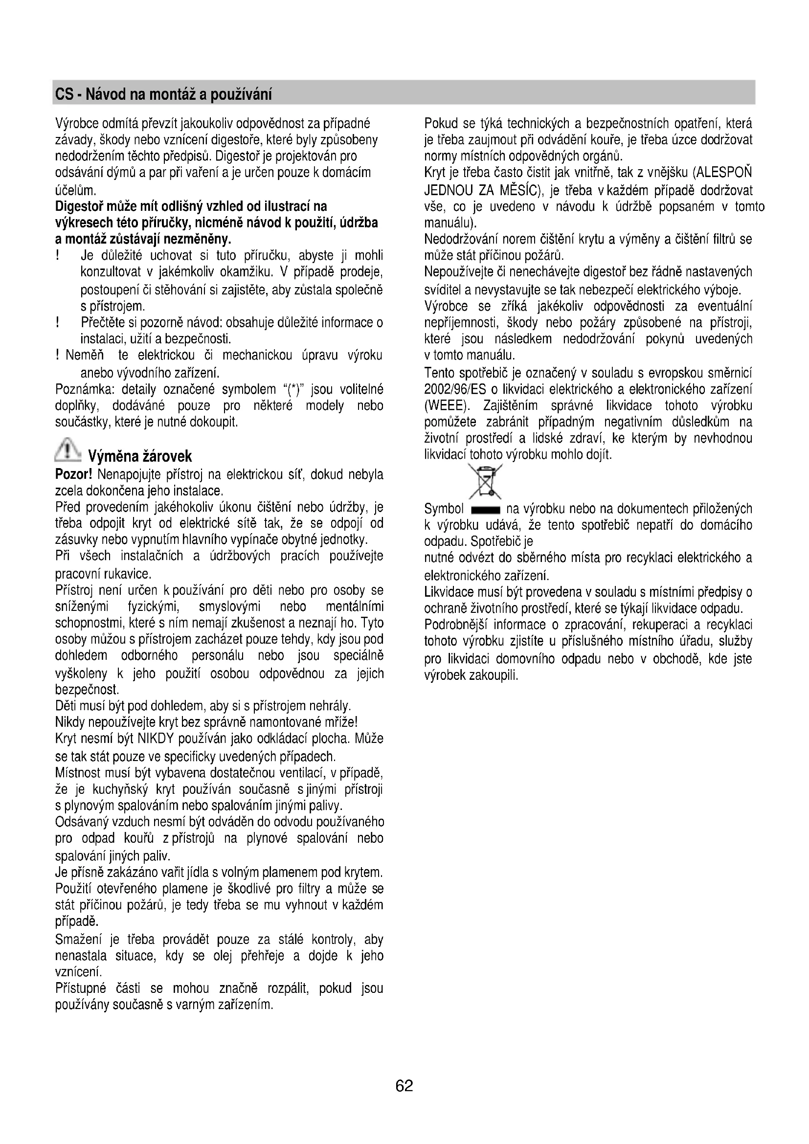 W przypadku, gdy oś wietlenie nie działa należy najpierw spr awdzić, czy lampki zostały prawidłowo zamontowane. Jeżeli po przeprowadzeniu takiej kontroli oświetlenie nadal nie działa, należy zwrócić się do serwisu.62 CS - Návod na montáž a používání Výrobce odmítá převzít jakoukoliv odpovědnost za případné závady, škody nebo vznícení digestoře, které byly způsobeny nedodržením těchto předpisů. Digestoř je projektován pro odsávání dýmů a par při vaření a je určen pouze k domácím účelům. Digestoř může mít odlišný vzhled od ilustrací na výkresech této příručky, nicméně návod k použití, údržba a montáž zůstávají nezměněny. ! Je důležité uchovat si tuto příručku, abyste ji mohli konzultovat v jakémkoliv okamžiku. V případě prodeje, postoupení či stěhování si zajistěte, aby zůstala společně s přístrojem. ! Přečtěte si pozorně návod: obsahuje důležité informace o instalaci, užití a bezpečnosti. ! Neměň te elektrickou či mechanickou úpravu výroku anebo vývodního zařízení. Poznámka: detaily označené symbolem “(*)” jsou volitelné doplňky, dodáváné pouze pro některé modely nebo součástky, které je nutné dokoupit. Výměna žárovek Pozor! Nenapojujte přístroj na elektrickou síť, dokud nebyla zcela dokončena jeho instalace. Před provedením jakéhokoliv úkonu čištění nebo údržby, je třeba odpojit kryt od elektrické sítě tak, že se odpojí od zásuvky nebo vypnutím hlavního vypínače obytné jednotky. Při všech instalačních a údržbových pracích používejte pracovní rukavice. Přístroj není určen k používání pro děti nebo pro osoby se sníženými fyzickými, smyslovými nebo mentálními schopnostmi, které s ním nemají zkušenost a neznají ho. Tyto osoby můžou s přístrojem zacházet pouze tehdy, kdy jsou pod dohledem odborného personálu nebo jsou speciálně vyškoleny k jeho použití osobou odpovědnou za jejich bezpečnost. Děti musí být pod dohledem, aby si s přístrojem nehrály. Nikdy nepoužívejte kryt bez správně namontované mříže! Kryt nesmí být NIKDY používán jako odkládací plocha. Může se tak stát pouze ve specificky uvedených případech. Místnost musí být vybavena dostatečnou ventilací, v případě, že je kuchyňský kryt používán současně s jinými přístroji s plynovým spalováním nebo spalováním jinými palivy. Odsávaný vzduch nesmí být odváděn do odvodu používaného pro odpad kouřů z přístrojů na plynové spalování nebo spalování jiných paliv. Je přísně zakázáno vařit jídla s volným plamenem pod krytem. Použití otevř eného plamene je škodlivé pro filtry a může s