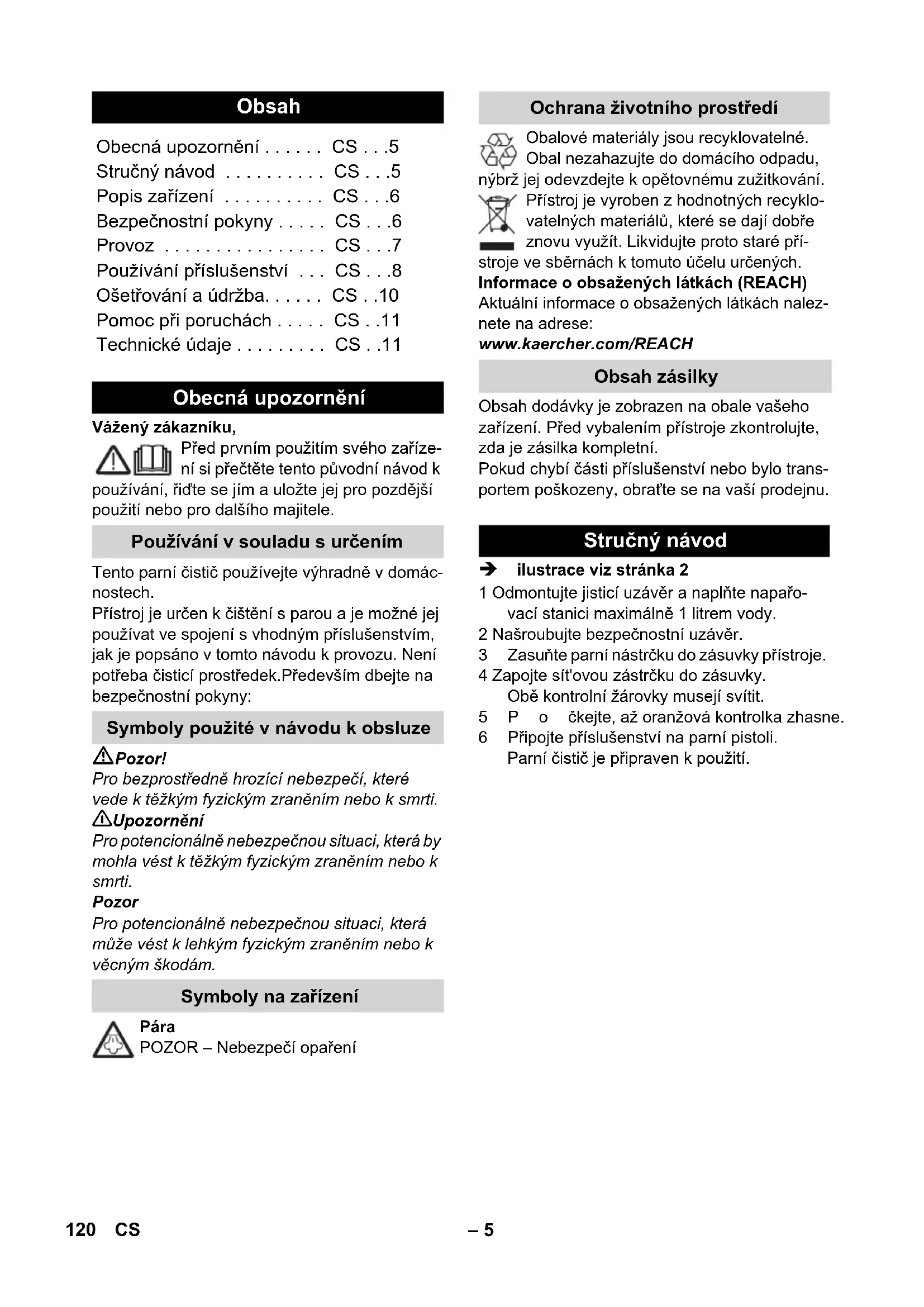 • Védelmi fokozat IP X4 Védelmi osztály I Teljesítményre vonatkozó adatok Fűtőteljesítmény 1500 W Fűtőteljesítmény Vasaló 750 W Max. üzemi hőmérséklet 0,32 MPa Felfűtési idő 8 Perc Max. gőzmennyiség 40 g/min Méretek Gőztartály 1,0 l Hossz 380 mm Szélesség 254 mm Magasság 260 mm Tartozékok nélküli súly 2,9 kg 119HU– 5 Vážený zákazníku, Před prvním použitím svého zaříze- ní si přečtěte tento původní návod k používání, řiďte se jím a uložte jej pro pozdější použití nebo pro dalšího majitele. Tento parní čistič používejte výhradně v domác- nostech. Přístroj je určen k čištění s parou a je možné jej používat ve spojení s vhodným příslušenstvím, jak je popsáno v tomto návodu k provozu. Není potřeba čisticí prostředek.Především dbejte na bezpečnostní pokyny: Pozor! Pro bezprostředně hrozící nebezpečí, které vede k těžkým fyzickým zraněním nebo k smrti. 몇 Upozornění Pro potencionálně nebezpečnou situaci, která by mohla vést k těžkým fyzickým zraněním nebo k smrti. Pozor Pro potencionálně nebezpečnou situaci, která může vést k lehkým fyzickým zraněním nebo k věcným škodám. Pára POZOR – Nebezpečí opaření Obalové materiály jsou recyklovatelné. Obal nezahazujte do domácího odpadu, nýbrž jej odevzdejte k opětovnému zužitkování. Přístroj je vyroben z hodnotných recyklo- vatelných materiálů, které se dají dobře znovu využít. Likvidujte proto staré pří- stroje ve sběrnách k tomuto účelu určených. Informace o obsažených látkách (REACH) Aktuální informace o obsažených látkách nalez- nete na adrese: www.kaercher.com/REACH Obsah dodávky je zobrazen na obale vašeho zařízení. Před vybalením přístroje zkontrolujte, zda je zásilka kompletní. Pokud chybí části příslušenství nebo bylo trans- portem poškozeny, obraťte se na vaší prodejnu. ilustrace viz stránka 2 1 Odmontujte jisticí uzávěr a naplňte napařo- vací stanici maximálně 1 litrem vody. 2 Našroubujte bezpečnostní uzávěr. 3 Zasuňte parní nástrčku do zásuvky přístroje. 4 Zapojte sít'ovou zástrčku do zásuvky. Obě kontrolní žárovky musejí svítit. 5Počkejte, až oranžová kontrolka zhasne. 6Připojte příslušenství na parní pistoli. Parní čistič je připraven k použití. Obsah Obecná upozornění