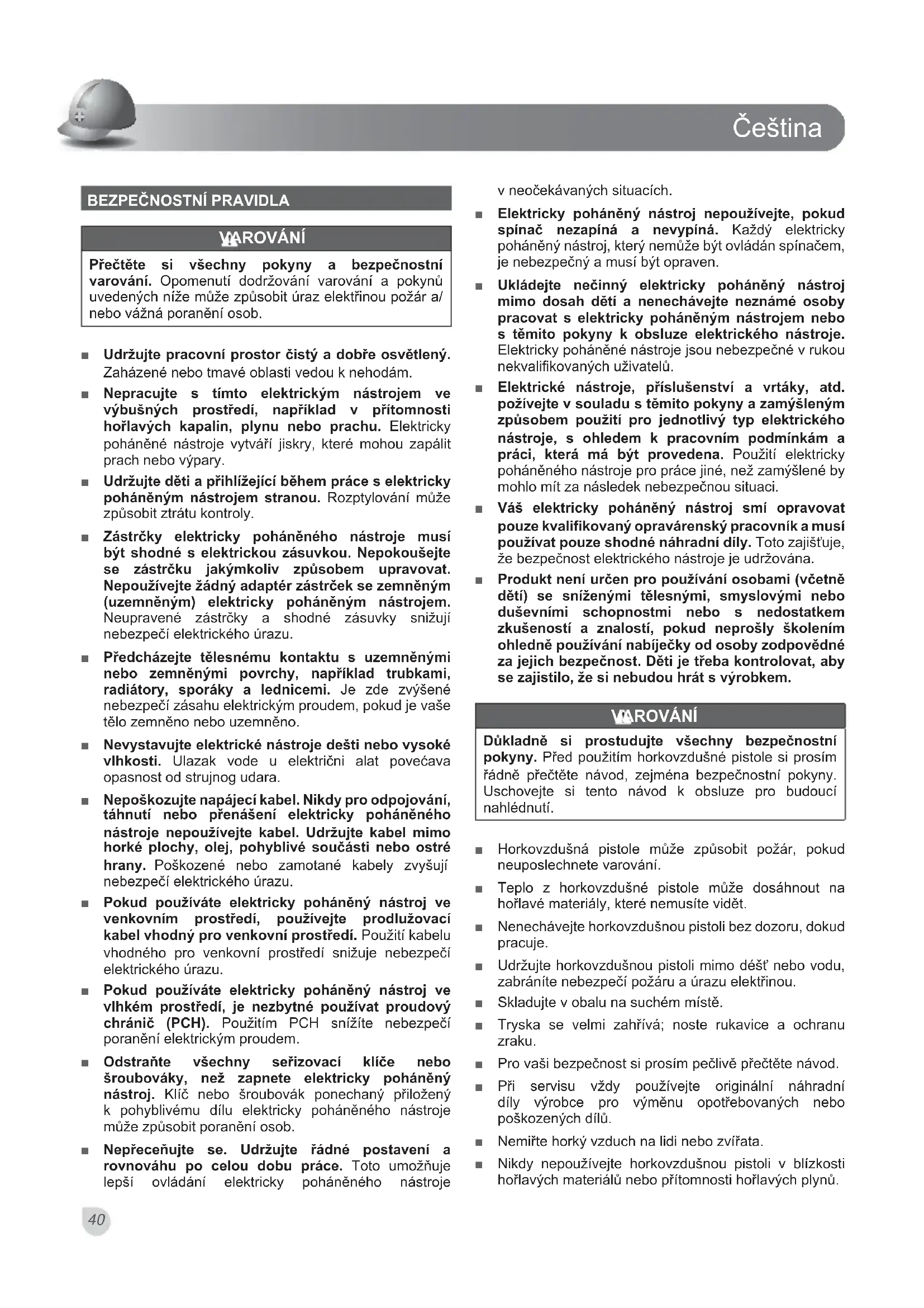 Dukladne si prostudujte vsechny bezpečnostníPokyny. Pred použitím horkovzdušné pistole si prosim rádné prěctěte námod, zejměna bezpečnostníPokyny. Uschovejte si tento námod k obsluze pro budouci nahlédnuti.