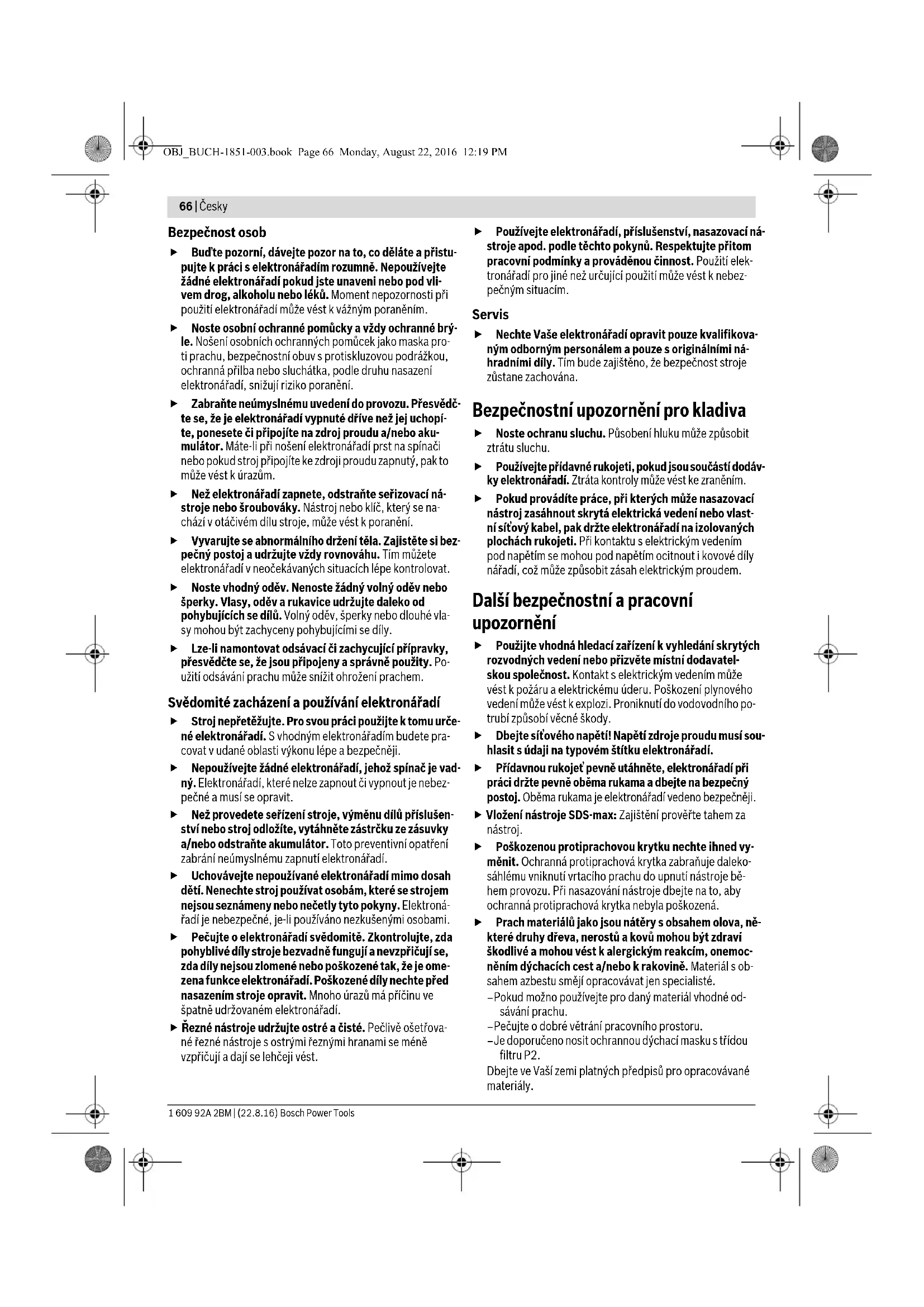 OBJ_BUCH-1851-003.book Page 64 Monday, August 22, 2016 12:19 PMČesky | 65 Bosch Power Tools 1 609 92A 2BM | (22.8.16) Jeżeli wskaźnik serwisowania miga w krótkich odstępach cza- su, oznacza to, że elektronarzędzie jest uszkodzone. W takim wypadku należy przerwać obróbkę elektronarzędziem i ode- słać je do punktu obsługi klienta. Obsługa klienta oraz doradztwo dotyczące użytkowania W punkcie obsługi klienta można uzyskać odpowiedzi na pyta- nia dotyczące napraw i konserwacji nabytego produktu, a tak- że dotyczące części zamiennych. Rysunki rozłożeniowe oraz informacje dotyczące części zamiennych można znaleźć rów- nież pod adresem: www.bosch-pt.com Nasz zespół doradztwa dotyczącego użytkowania odpowie na wszystkie pytania związane z produktami firmy Bosch oraz ich osprzętem. Przy wszystkich zgłoszeniach oraz zamówieniach części za- miennych konieczne jest podanie 10-cyfrowego numeru kata- logowego, znajdującego się na tabliczce znamionowej pro- duktu. Polska Robert Bosch Sp. z o.o. Serwis Elektronarzędzi Ul. Szyszkowa 35/37 02-285 Warszawa Na www.bosch-pt.pl znajdą Państwo wszystkie szczegóły do- tyczące usług serwisowych online. Tel.: 22 7154460 Faks: 22 7154441 E-Mail: bsc@pl.bosch.com Infolinia Działu Elektronarzędzi: 801 100900 (w cenie połączenia lokalnego) E-Mail: elektronarzedzia.info@pl.bosch.com www.bosch.pl Usuwanie odpadów Elektronarzędzia, osprzęt i opakowanie należy poddać utyli- zacji zgodnie z obowiązującymi zasadami ochrony środowi- ska. Nie wolno wyrzucać elektronarzędzi do odpadów z gospodar- stwa domowego! Tylko dla państw należących do UE: Zgodnie z europejską wytyczną 2012/19/UE o starych, zużytych narzę- dziach elektrycznych i elektronicznych i jej stosowania w prawie krajowym, wyelimino- wane niezdatne do użycia elektronarzędzia należy zbierać osobno i doprowadzić do po- nownego użytkowania zgodnego z zasadami ochrony środowiska. Zastrzega się prawo dokonywania zmian. Česky Všeobecná varovná upozornění pro elektronářadí Čtěte všechna varovná upozornění a pokyny. Zanedbání při dodržování va- rovných upozornění a pokynů mohou mít za následek zásah elektrickým proudem, požár a/nebo těžká poranění. Všechna varovná upozornění a pokyny do budoucna uschovejte. Ve varovných upozorněních použitý pojem „elektronářadí“ se vztahuje na elektronářadí provozované na el. síti (se síťovým kabelem) a na elektronářadí provozované na akumulátoru (bez síťového kabelu). Bezpečnost pracovního místa Udržujte Vaše pracovní místo čisté a dobře osvětlené. Nepořádek nebo neosvětlené pracovní oblasti mohou vést k úrazům. S elektronářadím nepracujte v prostředí ohroženém explozí, kde se nacházejí hořlavé kapaliny, plyny nebo prach. Elektronářadí vytváří jiskry, které mohou prach ne- bo páry zapálit. Děti a jiné osoby udržujte při použití elektronářadí da- leko od Vašeho pracovního místa. Při rozptýlení můžete ztratit kontrolu nad strojem. Elektrická bezpečnost Připojovací zástrčka elektronářadí musí lícovat se zá- suvkou. Zástrčka nesmí být žádným způsobem uprave- na. Společně s elektronářadím s ochranným uzemně- ním nepoužívejte žádné adaptérové zástrčky. Neupra- vené zástrčky a vhodné zásuvky snižují riziko zásahu elek- trickým proudem. Zabraňte kontaktu těla s uzemněnými povrchy, jako např. potrubí, topení, sporáky a chladničky. Je-li Vaše tělo uzemněno, existuje zvýšené riziko zásahu elektrickým proudem. Chraňte stroj před deštěm a vlhkem. Vniknutí vody do elektronářadí zvyšuje nebezpečí zásahu elektrickým prou- dem. Dbejte na účel kabelu, nepoužívejte jej k nošení či zavě- šení elektronářadí nebo k vytažení zástrčky ze zásuv- ky. Udržujte kabel daleko od tepla, oleje, ostrých hran nebo pohyblivých dílů stroje. Poškozené nebo spletené kabely zvyšují riziko zásahu elektrickým proudem. Pokud pracujete s elektronářadím venku, použijte pou- ze takové prodlužovací kabely, které jsou způsobilé i pro venkovní použití. Použití prodlužovacího kabelu, jež je vhodný pro použití venku, snižuje riziko zásahu elektric- kým proudem. Pokud se nelze vyhnout provozu elektronářadí ve vlh- kém prostředí, použijte proudový chránič. Nasazení proudového chrániče snižuje riziko zásahu elektrickým proudem. VAROVÁNÍ OBJ_BUCH-1851-003.book Page 65 Monday, August 22, 2016 12:19 PM66 | Česky 1 609 92A 2BM | (22.8.16) Bosch Power Tools Bezpečnost osob Buďte pozorní, dávejte pozor na to, co děláte a přistu- pujte k práci s elektronářadím rozumně. Nepoužívejte žádné elektronářadí pokud jste unaveni nebo pod vli- vem drog, alkoholu nebo léků. Moment nepozornosti při použití elektronářadí může vést k vážným poraněním. Noste osobní ochranné pomůcky a vždy ochranné brý- le. Nošení osobních ochranných pomůcek jako maska pro- ti prachu, bezpečnostní obuv s protiskluzovou podrážkou, ochranná přilba nebo sluchátka, podle druhu nasazení elektronářadí, snižují riziko poranění. Zabraňte neúmyslnému uvedení do provozu. Přesvědč- te se, že je elektronářadí vypnuté dříve než jej uchopí- te, ponesete či připojíte na zdroj proudu a/nebo aku- mulátor. Máte-li při nošení elektronářadí prst na spínači nebo pokud stroj připojíte ke zdroji proudu zapnutý, pak to může vést k úrazům. Než elektronářadí zapnete, odstraňte seřizovací ná- stroje nebo šroubováky. Nástroj nebo klíč, který se na- chází v otáčivém dílu stroje, může vést k poranění. Vyvarujte se abnormálního držení těla. Zajistěte si bez- pečný postoj a udržujte vždy rovnováhu. Tím můžete elektronářadí v neočekávaných situacích lépe kontrolovat. Noste vhodný oděv. Nenoste žádný volný 