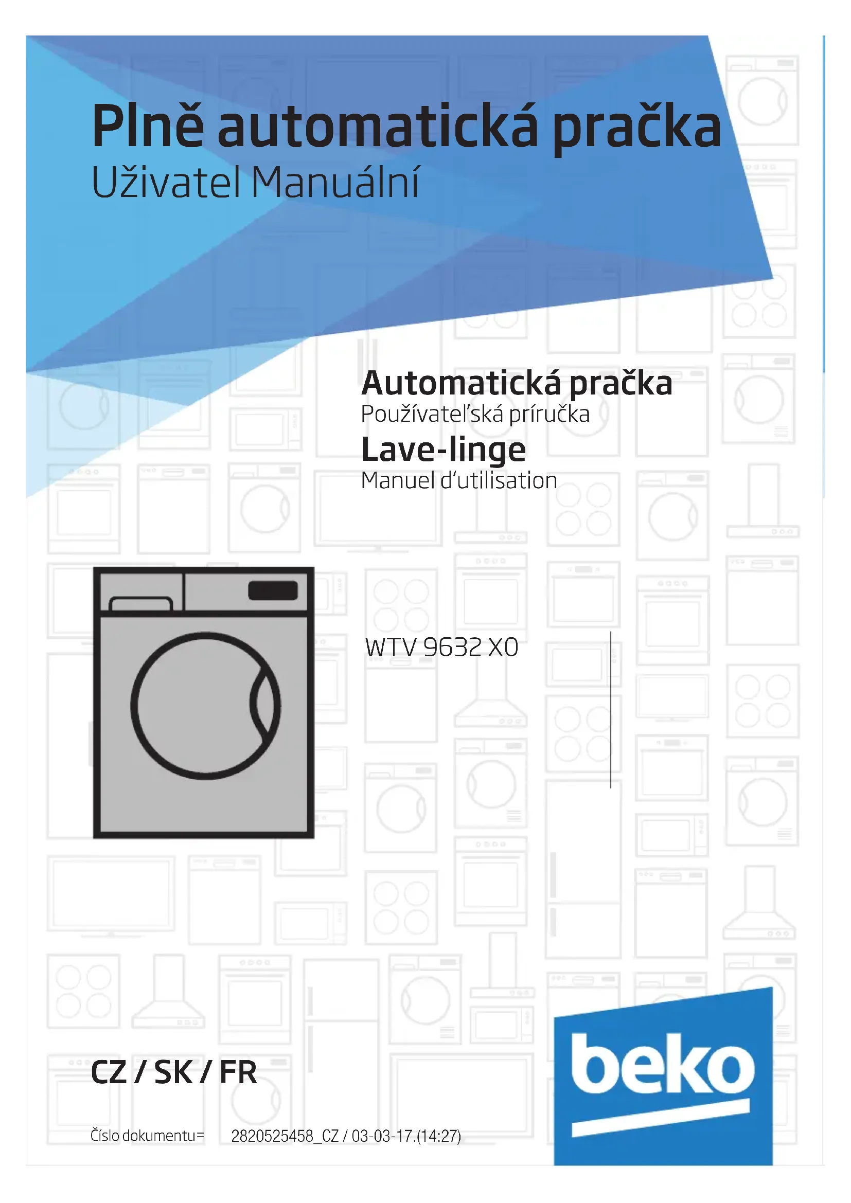 2820525458_CZ / 03-03-17.(14:27) Plně automatická pračka Uživatel Manuální WTV 9632 X0 CZ / SK / FR Číslo dokumentu= Automatická pračka Používateľská príručka Lave-linge Manuel d‘utilisation1 Důležité pokyny pro bezpečnost a ochranu životního prostředí Tento oddíl obsahuje bezpečnostní pokyny, které pomohou s ochranou před zraněním osob nebo poškozením majetku. Nedodržení těchto pokynů způsobí ztrátu nároku na čerpání záruky.