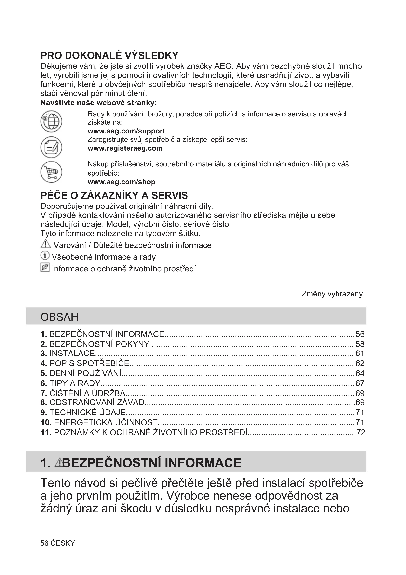 Děkujeme vám, že jste si zvolili výrobek značky AEG. Aby vám bezchybně sloužil mnoho let, vyrobili jsme jej s pomocí inovativních technologií, které usnadňují život, a vybavili funkcemi, které u obyčejných spotřebičů nespíš nenajdete. Aby vám sloužil co nejlépe, stačí věnovat pár minut čtení. Navštivte naše webové stránky:Rady k používání, brožury, poradce při potížích a informace o servisu a opraváchzískáte na:www.aeg.com/supportZaregistrujte svůj spotřebič a získejte lepší servis:www.registeraeg.comNákup příslušenství, spotřebního materiálu a originálních náhradních dílů pro vášspotřebič:www.aeg.com/shop PÉČE O ZÁKAZNÍKY A SERVIS Doporučujeme používat originální náhradní díly. V případě kontaktování našeho autorizovaného servisního střediska mějte u sebe následující údaje: Model, výrobní číslo, sériové číslo. Tyto informace naleznete na typovém štítku. Varování / Důležité bezpečnostní informace Všeobecné informace a rady Informace o ochraně životního prostředí Zmĕny vyhrazeny. OBSAH