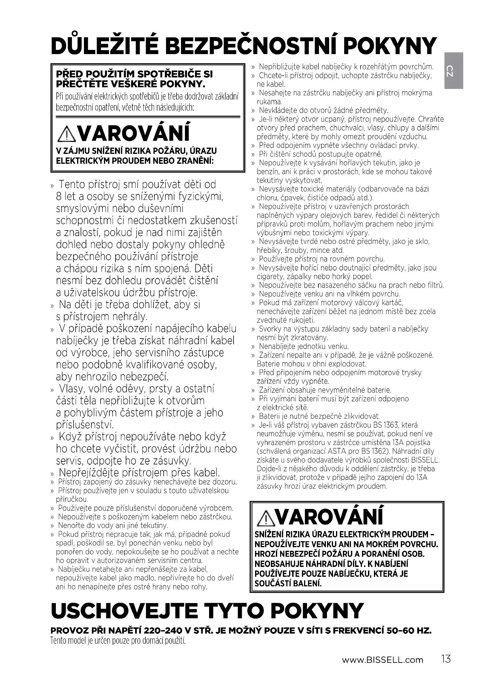PŘED POUŽITÍM SPOTŘEBIČE SI PŘEČTĚTE VEŠKERÉ POKYNY. Při používání elektrických spotřebičů je třeba dodržovat základní bezpečnostní opatření, včetně těch následujících: VAROVÁNÍ VZÁJMU SNÍŽENÍ RIZIKA POŽÁRU, ÚRAZU ELEKTRICKÝM PROUDEM NEBO ZRANĚNÍ:» Tento přístroj smí používat děti od 8let aosoby se sníženými fyzickými, smyslovými nebo duševními schopnostmi či nedostatkem zkušeností aznalostí, pokud je nad nimi zajištěn dohled nebo dostaly pokyny ohledně bezpečného používání přístroje achápou rizika sním spojená. Děti nesmí bez dohledu provádět čištění auživatelskou údržbu přístroje. » Na děti je třeba dohlížet, aby si spřístrojem nehrály. » Vpřípadě poškození napájecího kabelu nabíječky je třeba získat náhradní kabel od výrobce, jeho servisního zástupce nebo podobně kvalifikované osoby, abynehrozilo nebezpečí. » Vlasy, volné oděvy, prsty aostatní části těla nepřibližujte kotvorům apohyblivým částem přístroje ajeho příslušenství. » Když přístroj nepoužíváte nebo když ho chcete vyčistit, provést údržbu nebo servis, odpojte ho ze zásuvky. » Nepřejíždějte přístrojem přes kabel.» Přístroj zapojený do zásuvky nenechávejte bez dozoru.» Přístroj používejte jen vsouladu stouto uživatelskou příručkou.» Používejte pouze příslušenství doporučené výrobcem.» Nepoužívejte spoškozeným kabelem nebo zástrčkou.» Nenořte do vody ani jiné tekutiny.» Pokud přístroj nepracuje tak, jak má, případně pokud spadl, poškodil se, byl ponechán venku nebo byl ponořen do vody, nepokoušejte se ho používat anechte ho opravit vautorizovaném servisním centru.» Nabíječku netahejte ani nepřenášejte za kabel, nepoužívejte kabel jako madlo, nepřivírejte ho do dveří ani ho nenapínejte přes ostré hrany nebo rohy.» Nepřibližujte kabel nabíječky krozehřátým povrchům.» Chcete-li přístroj odpojit, uchopte zástrčku nabíječky, nekabel.» Nesahejte na zástrčku nabíječky ani přístroj mokrýma rukama.» Nevkládejte do otvorů žádné předměty.» Je-li některý otvor ucpaný, přístroj nepoužívejte. Chraňte otvory před prachem, chuchvalci, vlasy, chlupy adalšími předměty, které by mohly omezit proudění vzduchu.» Před odpojením vypněte všechny ovládací prvky.» Při čištění schodů postupujte opatrně.» Nepoužívejte kvysávání hořlavých tekutin, jako je benzín, ani kpráci vprostorách, kde se mohou takové tekutiny vyskytovat.» Nevysávejte toxické materiály (odbarvovače na bázi chloru, čpavek, čističe odpadů atd.).» Nepoužívejte přístroj vuzavřených prostorách naplněných výpary olejových barev, ředidel či některých přípravků proti molům, hořlavým prachem nebo jinými výbušnými nebo toxickými výpary.» Nevysávejte tvrdé nebo ostré předměty, jako je sklo, hřebíky, šrouby, mince atd.» Používejte přístroj na rovném povrchu.» Nevysávejte hořící nebo doutnající předměty, jako jsou cigarety, zápalky nebo horký popel.» Nepoužívejte bez nasazeného sáčku na prach nebo filtrů.» Nepoužívejte venku ani na vlhkém povrchu.» Pokud má zařízení motorový válcový kartáč, nenechávejte zařízení běžet na jednom místě bez zcela zvednuté rukojeti.» Svorky na výstupu základny sady baterií anabíječky nesmí být zkratovány.» Nenabíjejte jednotku venku.» Zařízení nepalte ani vpřípadě, že je vážně poškozené. Baterie mohou vohni explodovat.» Před připojením nebo odpojením motorové trysky zařízení vždy vypněte.» Zařízení obsahuje nevyměnitelné baterie.» Při vyjímání baterií musí být zařízení odpojeno zelektrické sítě.» Baterii je nutné bezpečně zlikvidovat.» Je-li váš přístroj vybaven zástrčkou BS1363, která neumožňuje výměnu, nesmí se používat, pokud není ve vyhrazeném prostoru vzástrčce umístěna 13A pojistka (schválená organizací ASTA pro BS1362). Náhradní díly získáte usvého dodavatele výrobků společnosti BISSELL. Dojde-li znějakého důvodu koddělení zástrčky, je třeba ji zlikvidovat, protože vpřípadě jejího zapojení do 13A zásuvky hrozí úraz elektrickým proudem.