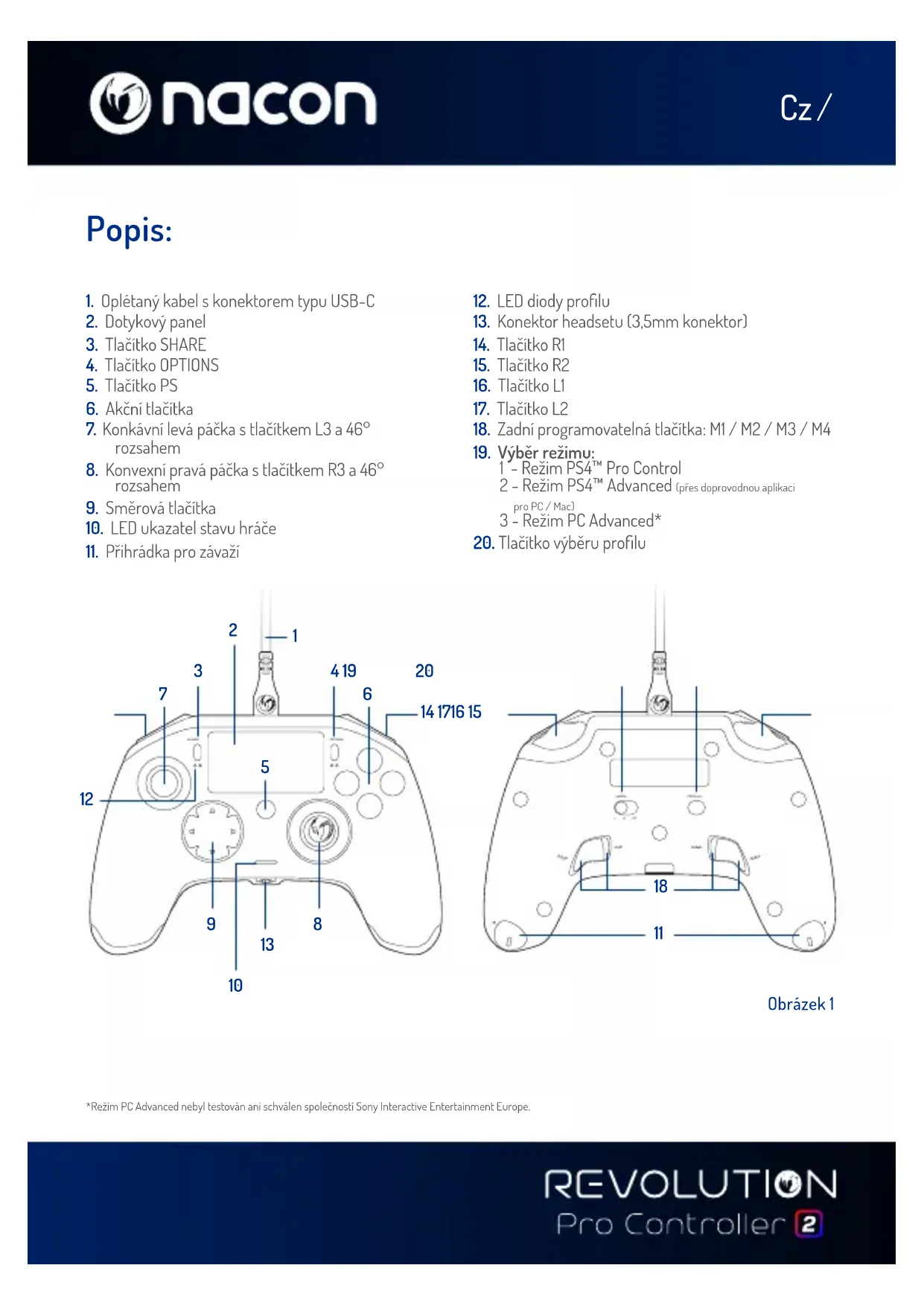 Instalace závaží: Obrázek 2Cz / Ovladač REVOLUTION Pro Controller 2 Děkujeme za zakoupení tohoto produktu společnosti NACON. V případě nefunkčnosti nahlédněte do sekce podpory na konci této příručky. Vážíme si každé zpětné vazby, která nám umožní zdokonalit naše produkty. Tuto příručku si uchovejte pro budoucí použití. Záruka Na tento produkt nesoucí obchodní značku NACON se vztahuje záruka výrobce „Bigben Interactive“, která platí 2 roky od data zakoupení, a v případě výskytu poruchy způsobené vadným materiálem nebo zpracováním bude v tomto období zdarma vyměněn za stejný nebo podobný model (dle našich možností). Tato záruka se nevztahuje na vady vyplývající z neúmyslného poškození, nesprávného používání nebo opotřebení a platí pouze pro původního kupce výrobku. Vaše zákonná práva nejsou tímto žádným způsobem dotčena. Bližší informace o záruce a podpoře můžete získat zasláním e-mailu na adresu support@nacongaming.com nebo na stránce www.nacongaming.com Obsah balíčku 1 x ovladač REVOLUTION Pro Controller 2 1 x 3m propojovací kabel 1 x příručka 2 x 10g závaží 2 x 14g závaží 2 x 17g závaží 1 x klíč od přihrádky pro závaží 1 x vak Charakteristické rysy Tento ovladač disponuje 3 režimy: