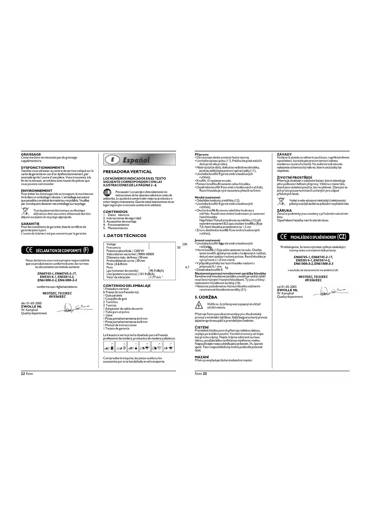 Vědčte se, že přístroj není zapojený do sítě přiúdržbě motoru. Přístroje Ferm jsou zkonstruovány pro dlouhodobýprovoz s minimální údržbou. Stálý bezporuchový provozzájistíte správnou péčí a pravidelným čistěním.ČISTÉNĺPravidelně čistěte povrch přístroje měkkou látkou,nejlépe po každém použití. Ventilační otvory udržujtebez prachu a špíny. Nejde-li špína odstranit suchoulátkou, použijte látku navlhčenou mýdlovou vodou.Nepoužívejte rozpouštědla jako je benzín, líh, čpavekapod. Tato rozpouštědla by mohla poškodit plastovéčásti.MAZÁNĺPřístroj nevyžaduje žádné dodatečné mazání.ZÁVADYVznikne-li závada na některé součástce, například vlivemopotřebení, kontaktujte prosím servisní adresuuvedenou na záruční kartě. Na zadní straně návodunaleznete schematický nákres, které součástky lzeobjednat. ŽIVOTNÍ PROSTŘEDÍPřístroj je dodáván v odolném balení, které zabraňujejeho poškození během přepravy. Většinu z materiálů,které jsou na balení použity, lze recyklovat. Zbavujte sejich proto pouze na místech určených pro odpadpříslušných látek. Vadný a nebo vyhozený elektrický či elektronickýpřístroj musí být dodán na příslušné recyklační míst.ZÁRUKAZáruční podmínky jsou uvedeny v přiloženém záručnímlistu.Opotřebení řezačky není kryté zárukou.Prohlašujeme, že tento výrobek splňuje následujícínormy nebo normativní dokumenty:EN60745-1, EN60745-2-17, EN55014-1, EN55014-2,EN61000-3-2, EN61000-3-3 v souladu se stanoveními ve směrnicích:98/37EEC, 73/23EEC89/336/EECod 01-05-2005ZWOLLE NLW. KamphofQuality department