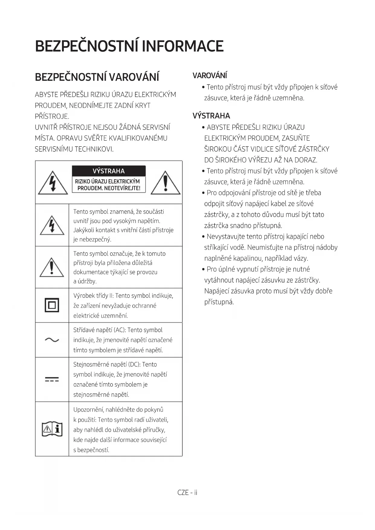 - Pro úplné vypnutí přístroje je nutné vytáhnout napájecí zásuvku ze zástrčky. Napájecí zásuvka proto musí být vždy dobře přístupná.CZE - iii BEZPEČNOSTNÍ OPATŘENÍ