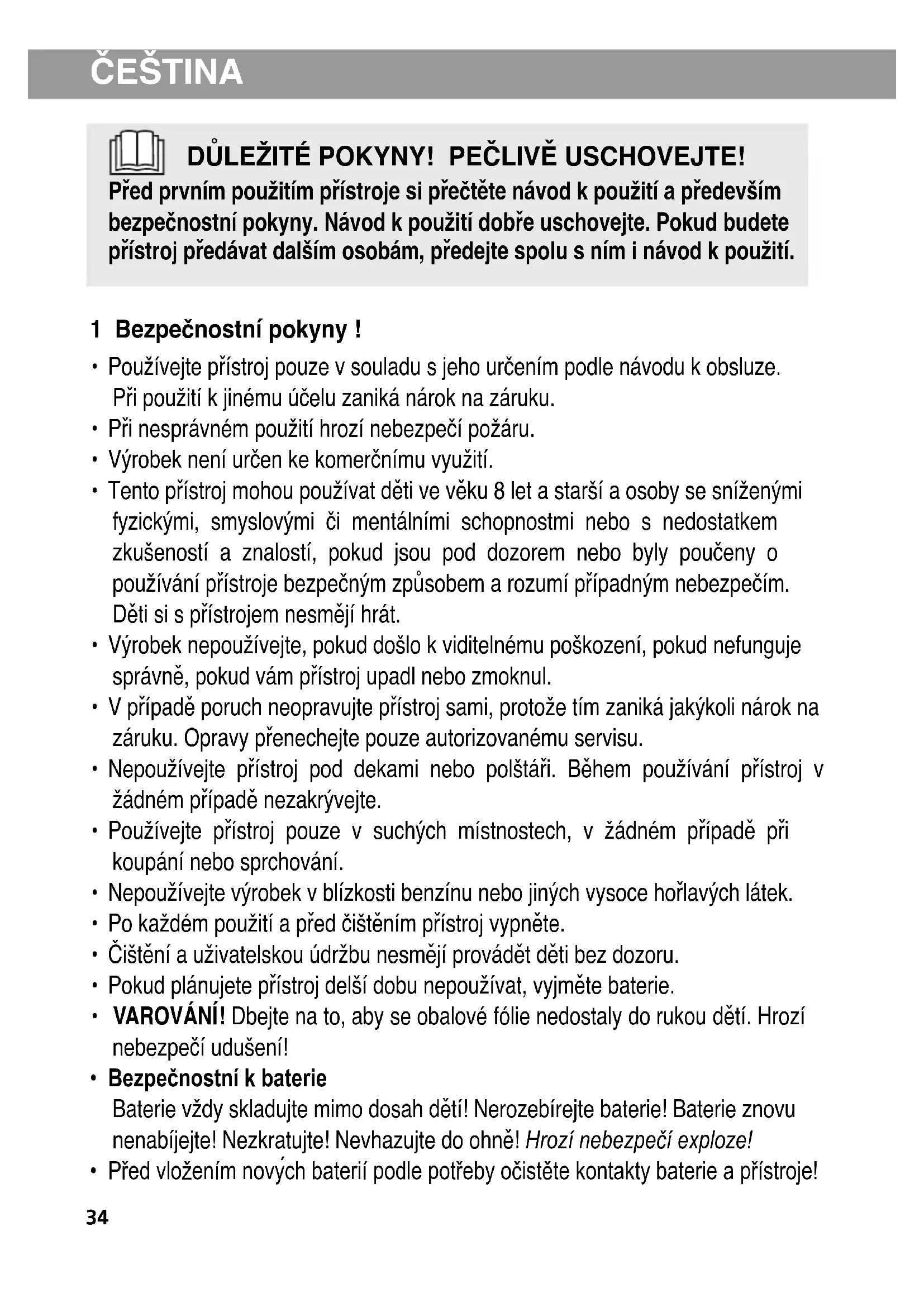 - Používejte přístroj pouze v suchých místnostech, v žádném případě při koupání nebo sprchování.