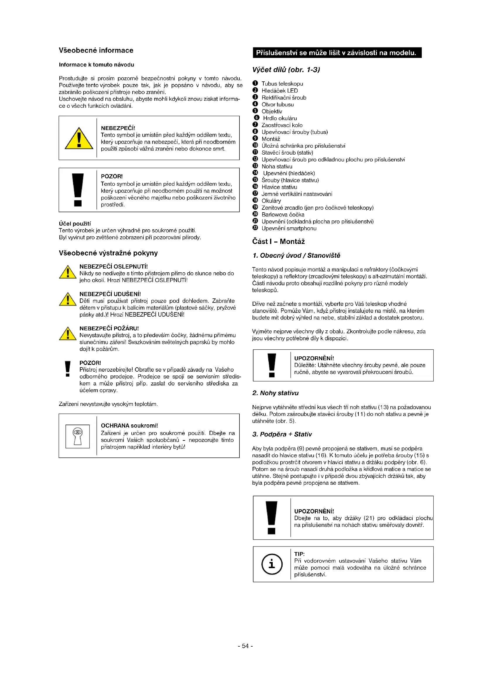 Tento návod popisuje montáž a manipulaci s refraktory (čočkovými teleskopy) a reflektory (zrcadlovými teleskopy) s alt-azimutální montáží. Části návodu proto obsahují rozdílné pokyny pro různé modely teleskopů. Dříve než začnete s montáží, vyberte pro Váš teleskop vhodné stanoviště. Pomůže Vám, když přístroj instalujete na místě, na kterém budete mít dobrý výhled na nebe, stabilní základ a dostatek prostoru. Vyjměte nejprve všechny díly z obalu. Zkontrolujte podle nákresu, zda jsou všechny potřebné díly k dispozici. UPOZORNĚNÍ! Důležité: Utáhněte všechny šrouby pevně, ale pouze ručně, abyste se vyvarovali překroucení šroubů.