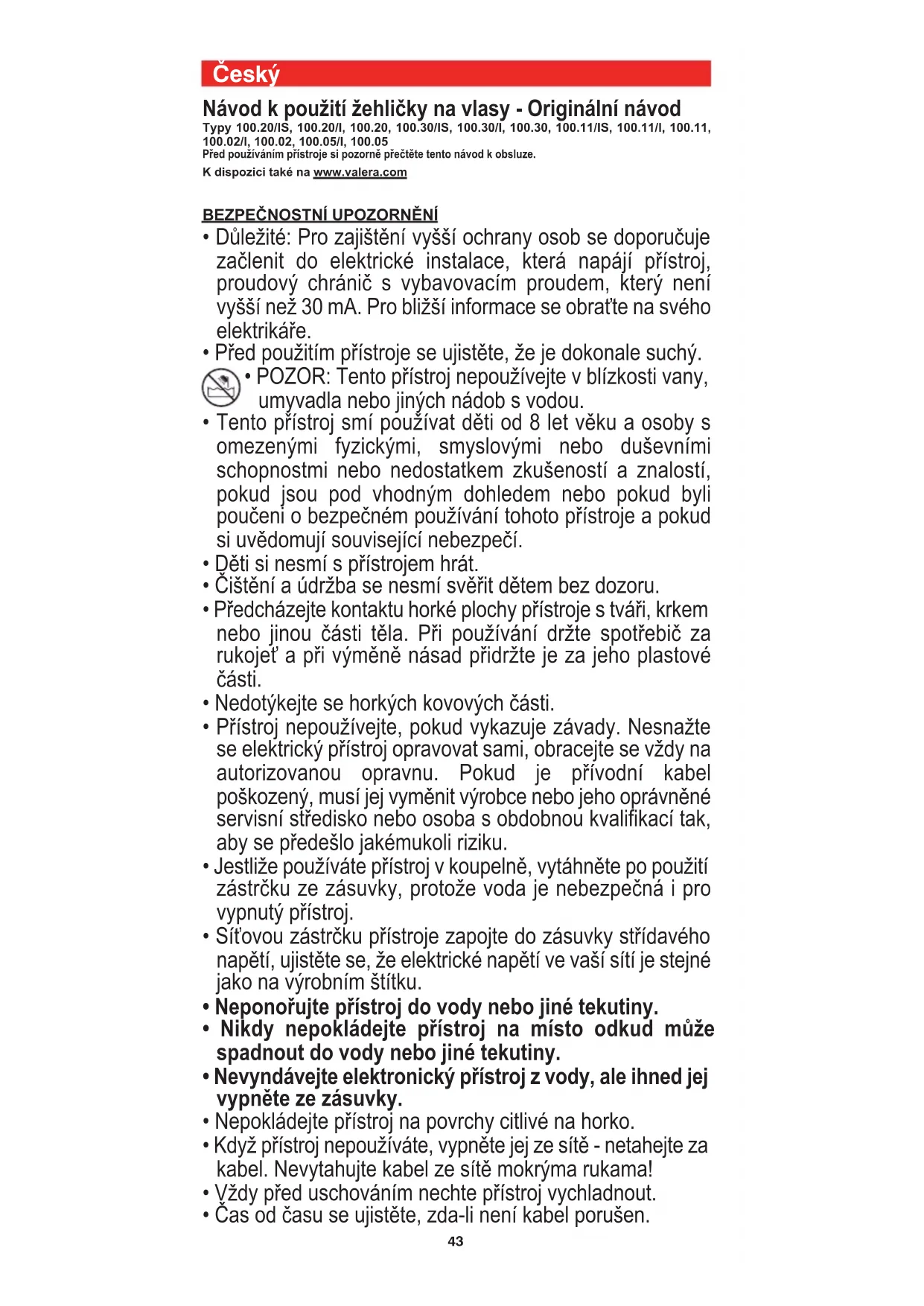 a még meleg hajszálakat, elzárják a hajhám felső rétegét, és elkerülik a túlzott hőhatást a hullám rögzítésénél. 00060754 int_gen2018_Layout 1 22/01/2018 12:50 Pagina 4243 Český Návod k použití žehličky na vlasy - Originální návod Typy 100.20/IS, 100.20/I, 100.20, 100.30/IS, 100.30/I, 100.30, 100.11/IS, 100.11/I, 100.11, 100.02/I, 100.02, 100.05/I, 100.05 Před používáním přístroje si pozorně přečtěte tento návod k obsluze. K dispozici také na www.valera.com