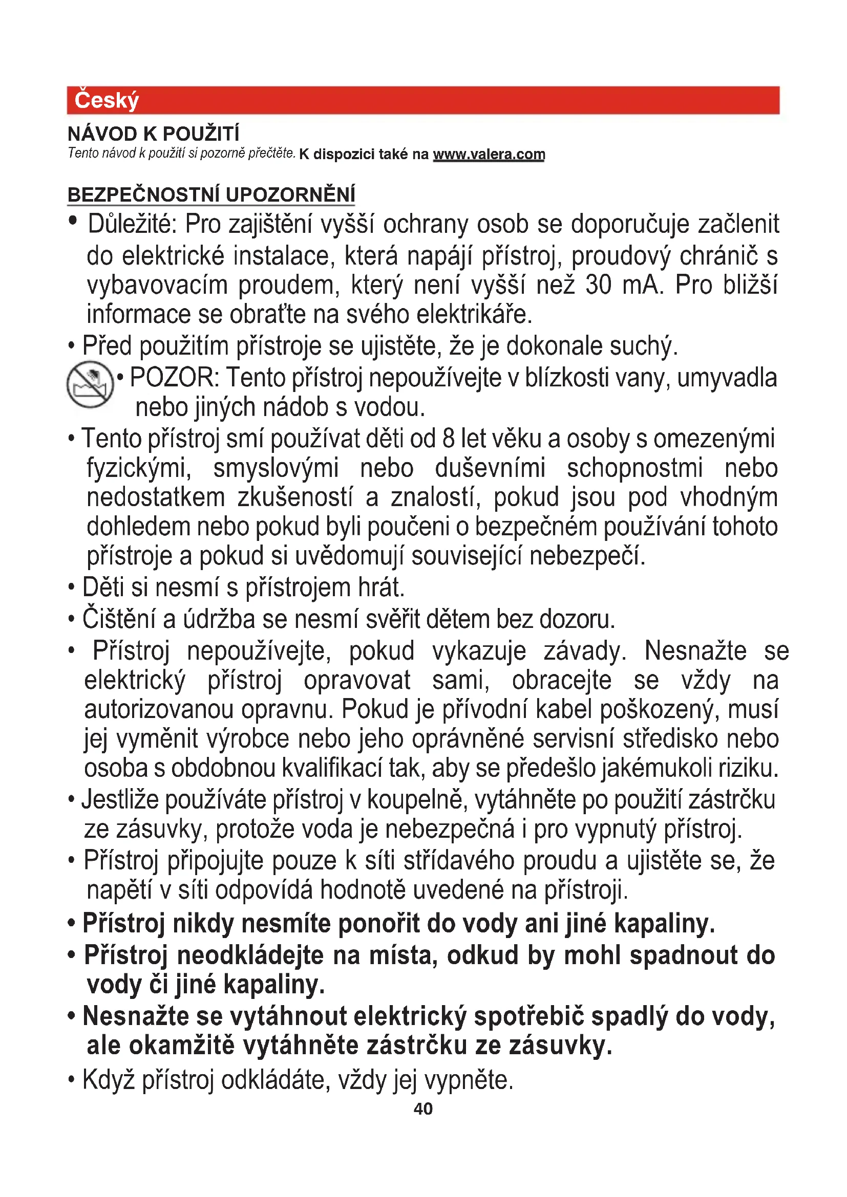 - POZOR: Tento přístroj nepoužívejte v blízkosti vany, umyvadla nebo jiných nádob s vodou.