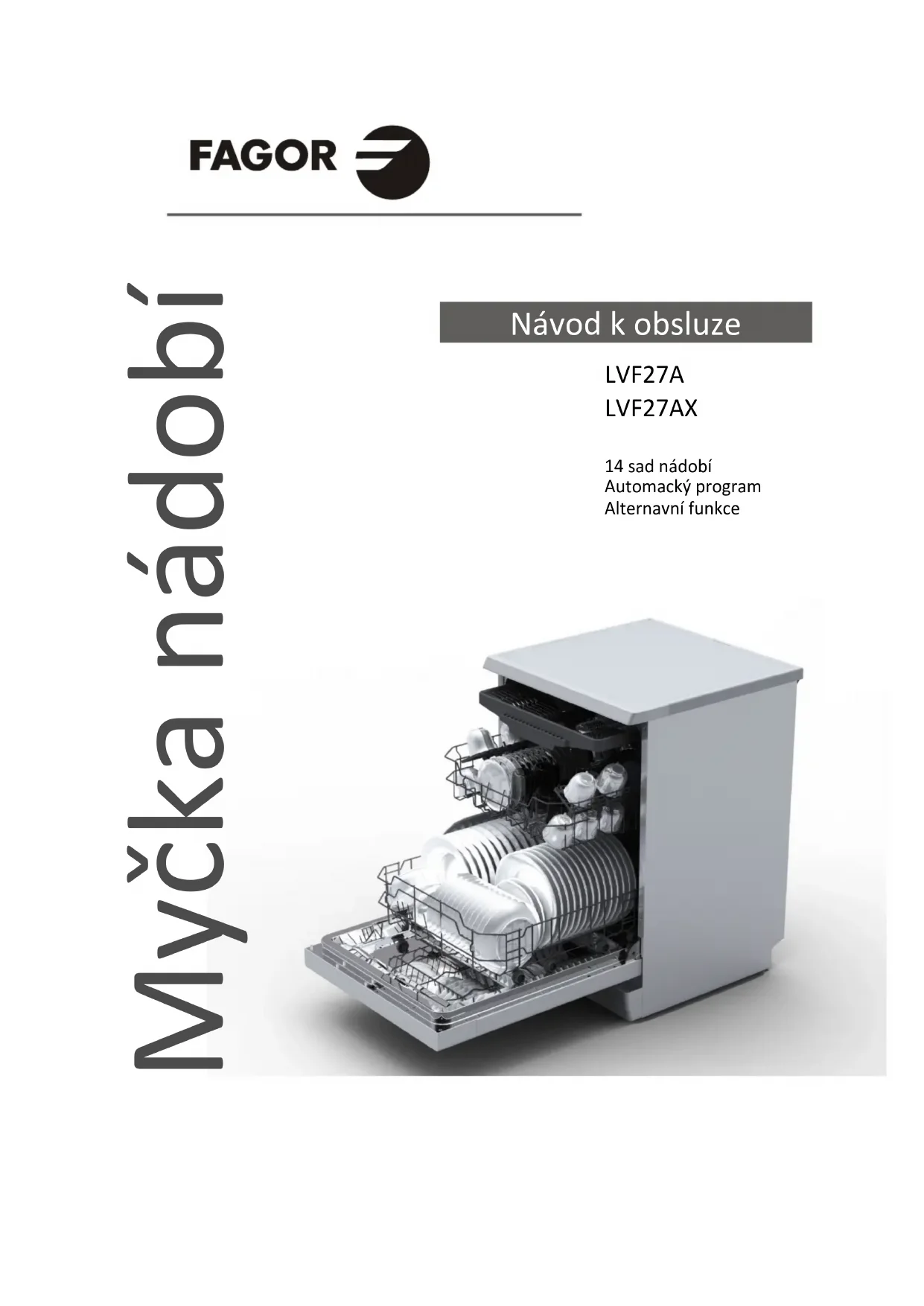 LVF27A LVF27AX 14 sad nádobí Automatický program Alternativní funkce Myčka nádobíPřečtěte si tuto příručku Vážený zákazníku, Před prvním použitím myčky si prosím prostudujte tento návod. Pomůže Vám ke správnému používání a údržbě myčky. Návod si uschovejte pro případné pozdější použití. Předejte jej také případnému dalšímu majiteli tohoto spotřebiče. Tento návod obsahuje bezpečnostní pokyny, provozní pokyny, pokyny pro instalaci, různé tipy pro řešení závad atd. Dříve, než zavoláte do servisu Některé běžné problémy můžete vyřešit sami s pomocí kapitoly "Tipy pro řešení závad". Pokud nejste schopni vyřešit tyto problémy sami, požádejte o pomoc profesionální servisní techniky. POZNÁMKA: Výrobce si v rámci vlastní politiky neustálého vývoje a aktualizace produktu vyhrazuje právo provádět změny bez předchozího upozornění. Tento návod je nutno si v případě potřeby vyžádat od výrobce nebo odpovědného prodejce.